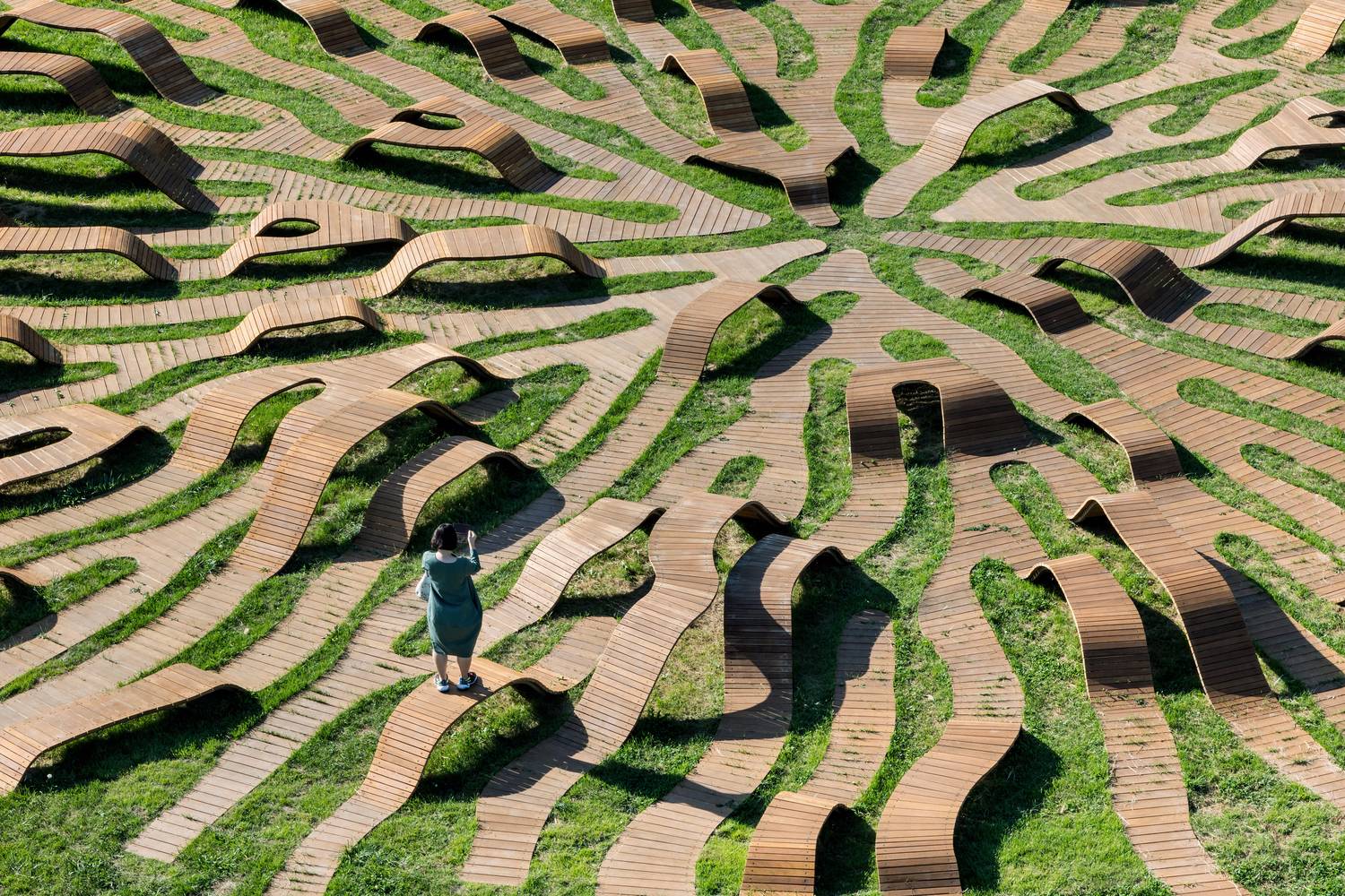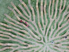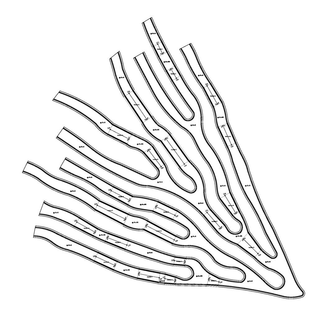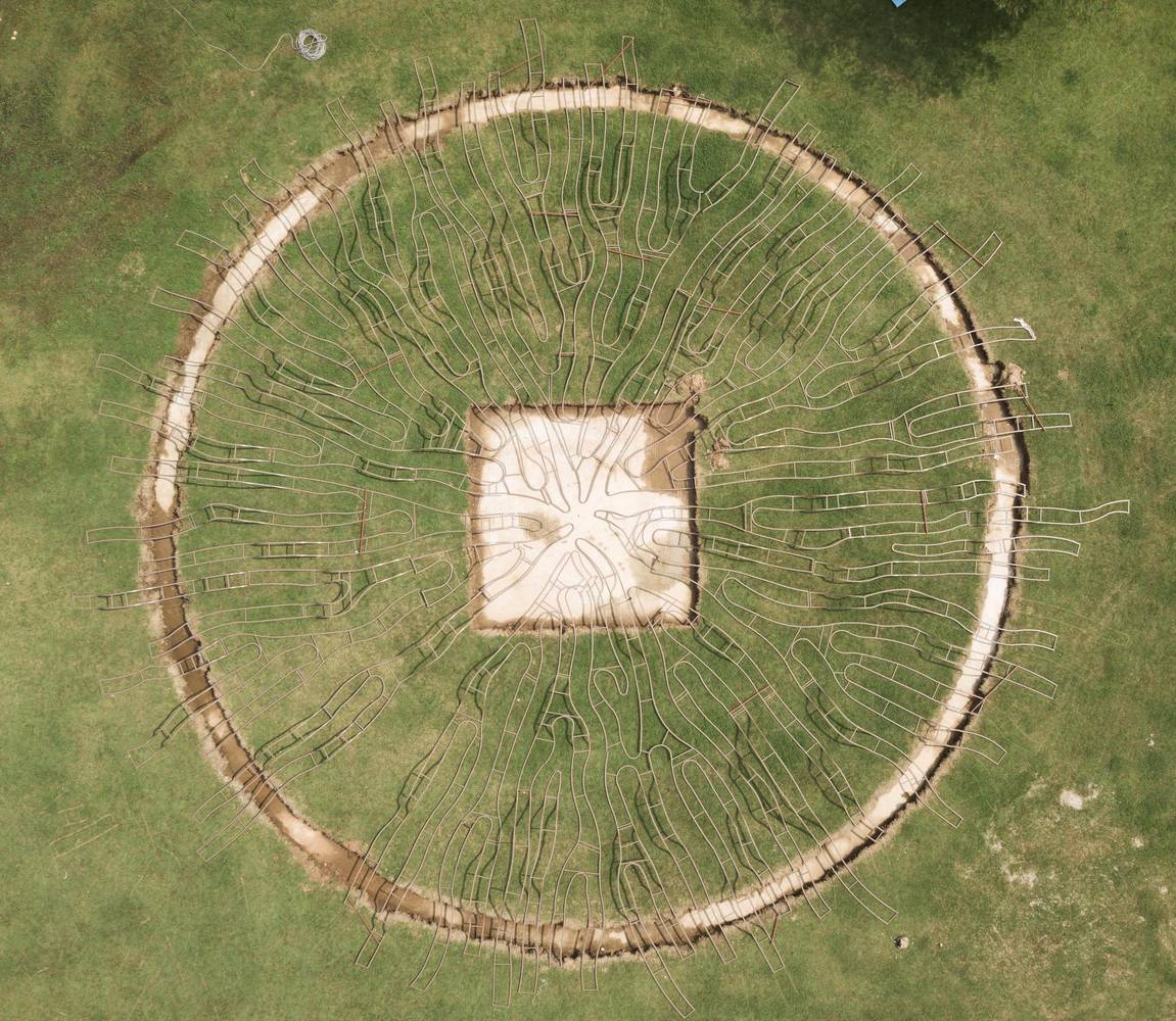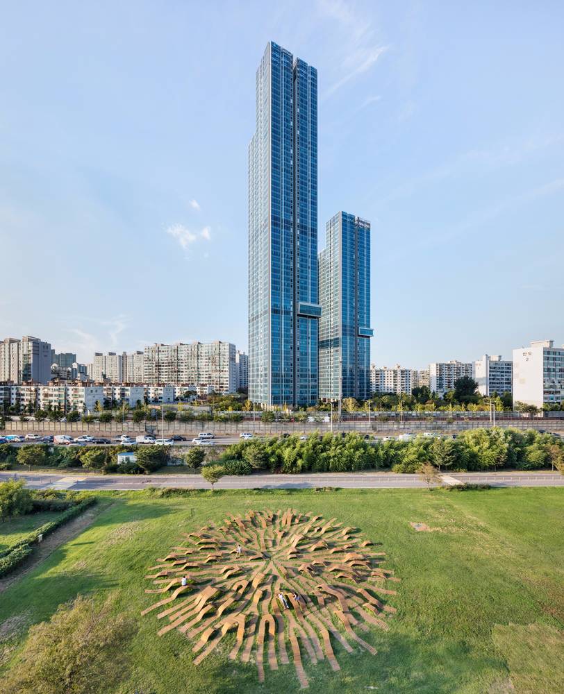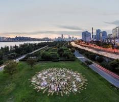 根系長(zhǎng)凳是對(duì)漢江藝術(shù)競(jìng)賽中標(biāo)方案的重新詮釋。這是直徑30米的圓形公共家具,安裝在草地上,在公園內(nèi)呈動(dòng)態(tài)的根系分布的形態(tài)。它提供了視覺(jué)刺激,與寬敞的室外公園背景形成強(qiáng)烈對(duì)比。 人們可以在它不同高度的地方坐著或倚著它休息,從獲獎(jiǎng)方案中延續(xù)下來(lái)的主要概念是以中心向外伸展的有機(jī)形狀創(chuàng)造空間連接。