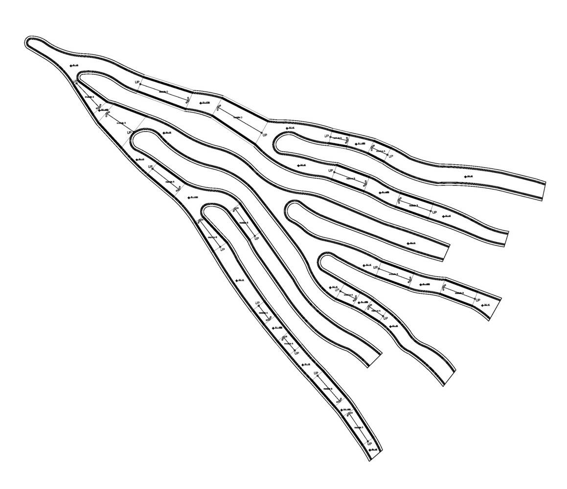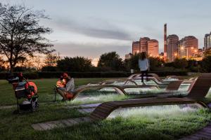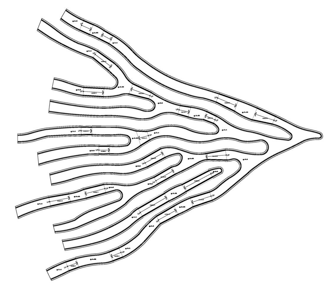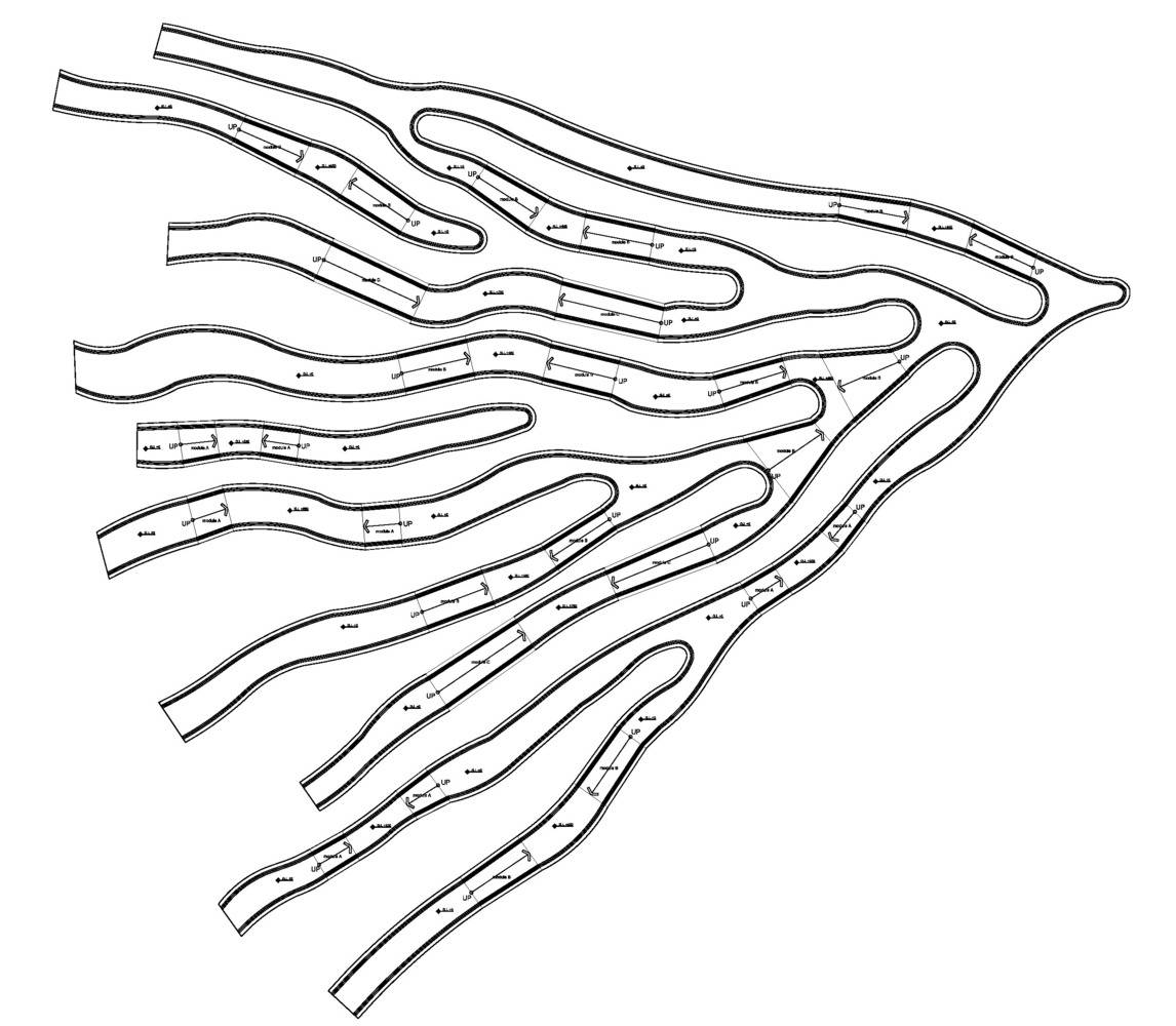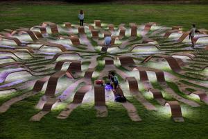 根系長(zhǎng)凳是對(duì)漢江藝術(shù)競(jìng)賽中標(biāo)方案的重新詮釋。這是直徑30米的圓形公共家具,安裝在草地上,在公園內(nèi)呈動(dòng)態(tài)的根系分布的形態(tài)。它提供了視覺(jué)刺激,與寬敞的室外公園背景形成強(qiáng)烈對(duì)比。 人們可以在它不同高度的地方坐著或倚著它休息,從獲獎(jiǎng)方案中延續(xù)下來(lái)的主要概念是以中心向外伸展的有機(jī)形狀創(chuàng)造空間連接。