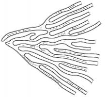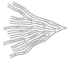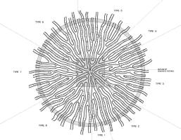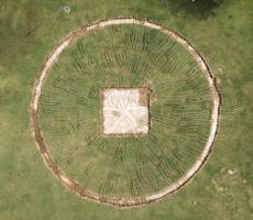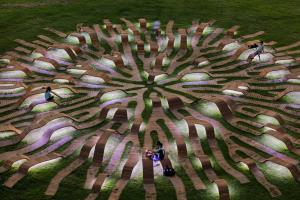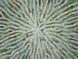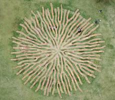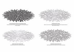 緊密連接的樹(shù)枝,應(yīng)用了“反應(yīng)擴(kuò)散系統(tǒng)”進(jìn)行工藝設(shè)計(jì)。這個(gè)數(shù)學(xué)模型描述了一種或多種化學(xué)物質(zhì)濃度在空間和時(shí)間上的變化:物質(zhì)相互轉(zhuǎn)化的局部化學(xué)反應(yīng),以及使物質(zhì)擴(kuò)散到空間表面的擴(kuò)散。通過(guò)該算法,生成整體徑向形式,將前景裝置合并到背景的草中。