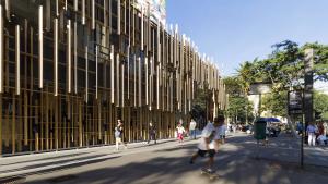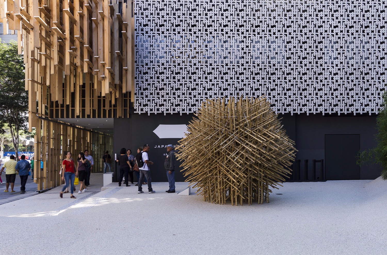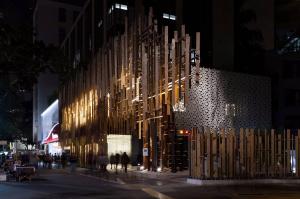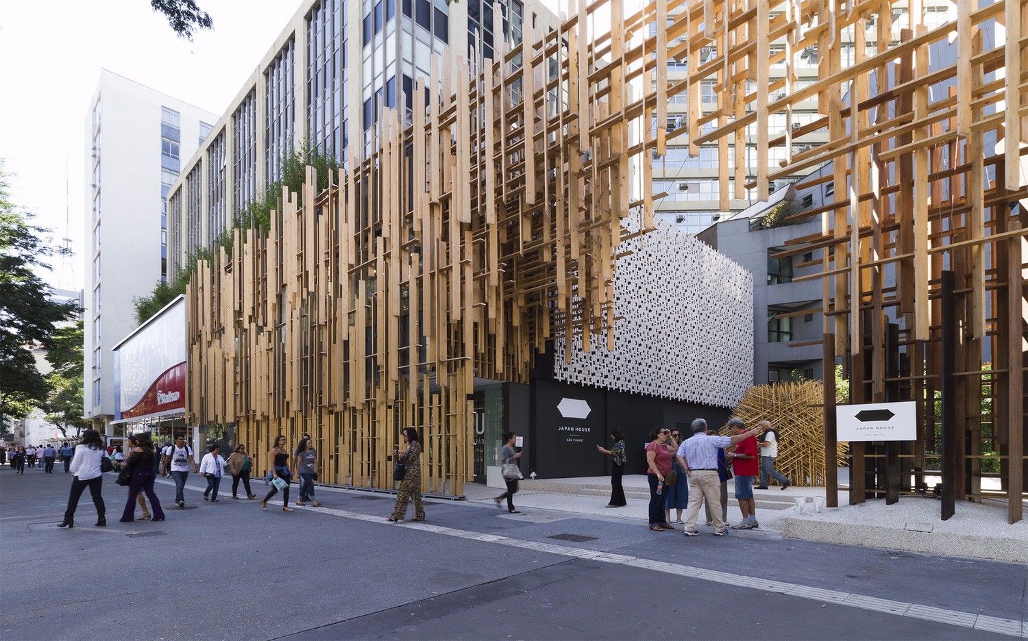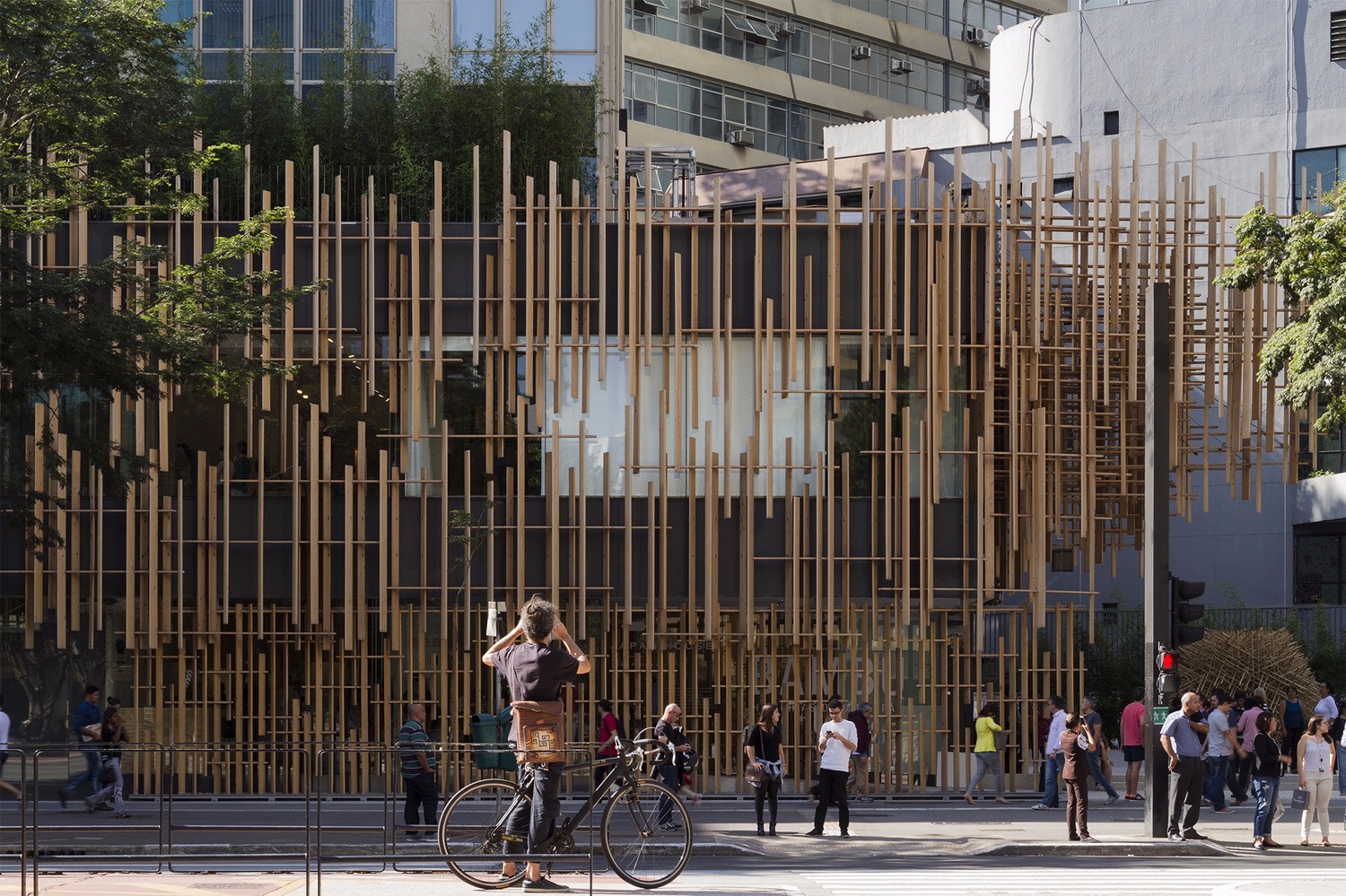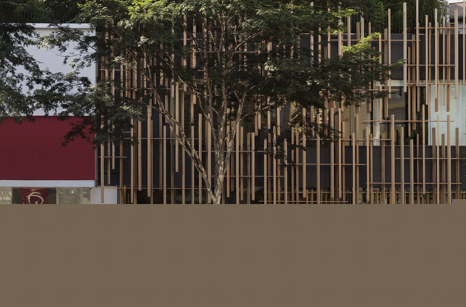 該設計最具代表性的一面是立面,它呈現(xiàn)出“由 hinoki 制成的木質規(guī)則幕布,日本工匠與傳統(tǒng)的 cobogos (巴西現(xiàn)代建筑中常用的空心水泥塊)進行對話”。