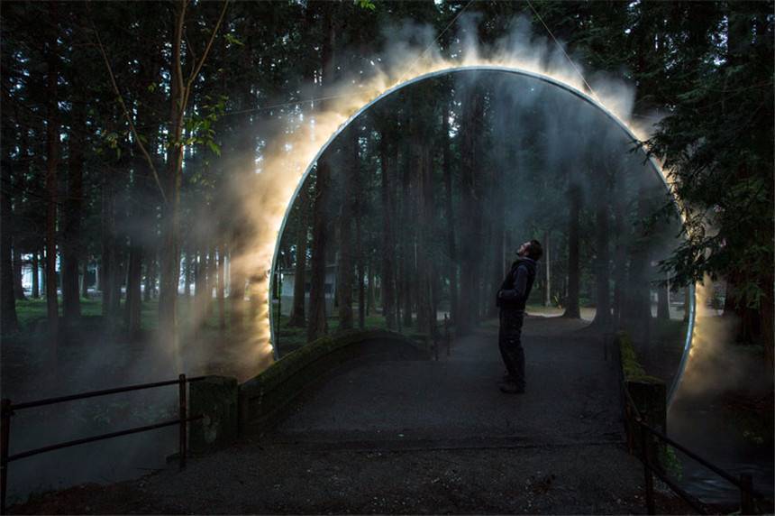 藝術(shù)作品是一個(gè)薄霧環(huán),位于當(dāng)?shù)胤鸾趟略篐otokizaki Kanon-ji的入口處,環(huán)繞著一條橫跨小河的橋梁。在白天,霧氣在日光下產(chǎn)生彩虹,而在夜間,帶有LED燈條的環(huán)形照亮霧氣。
