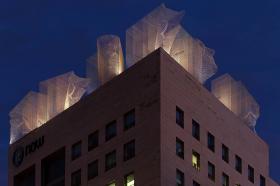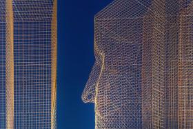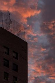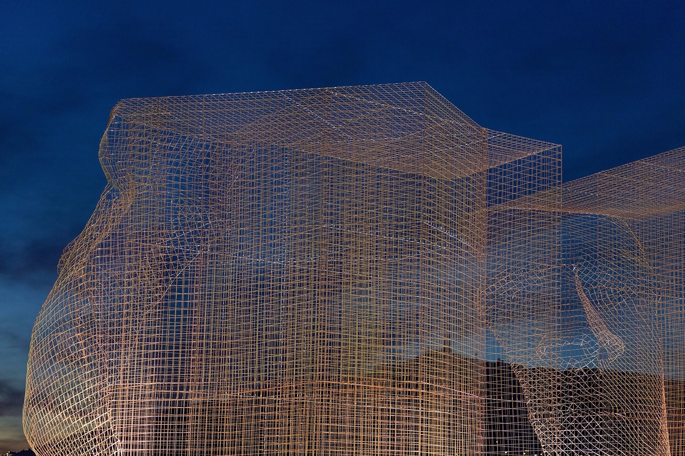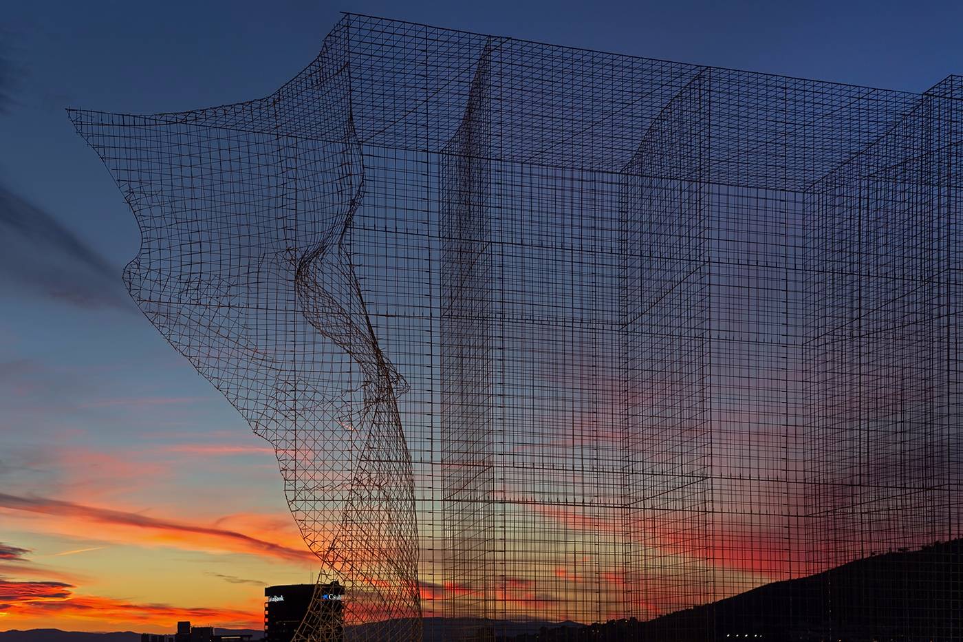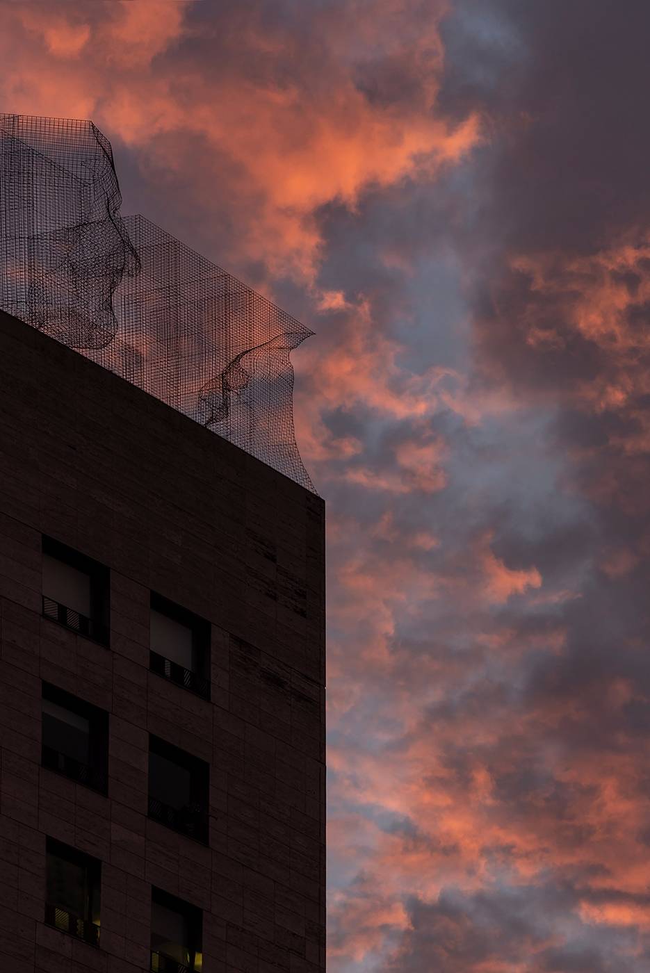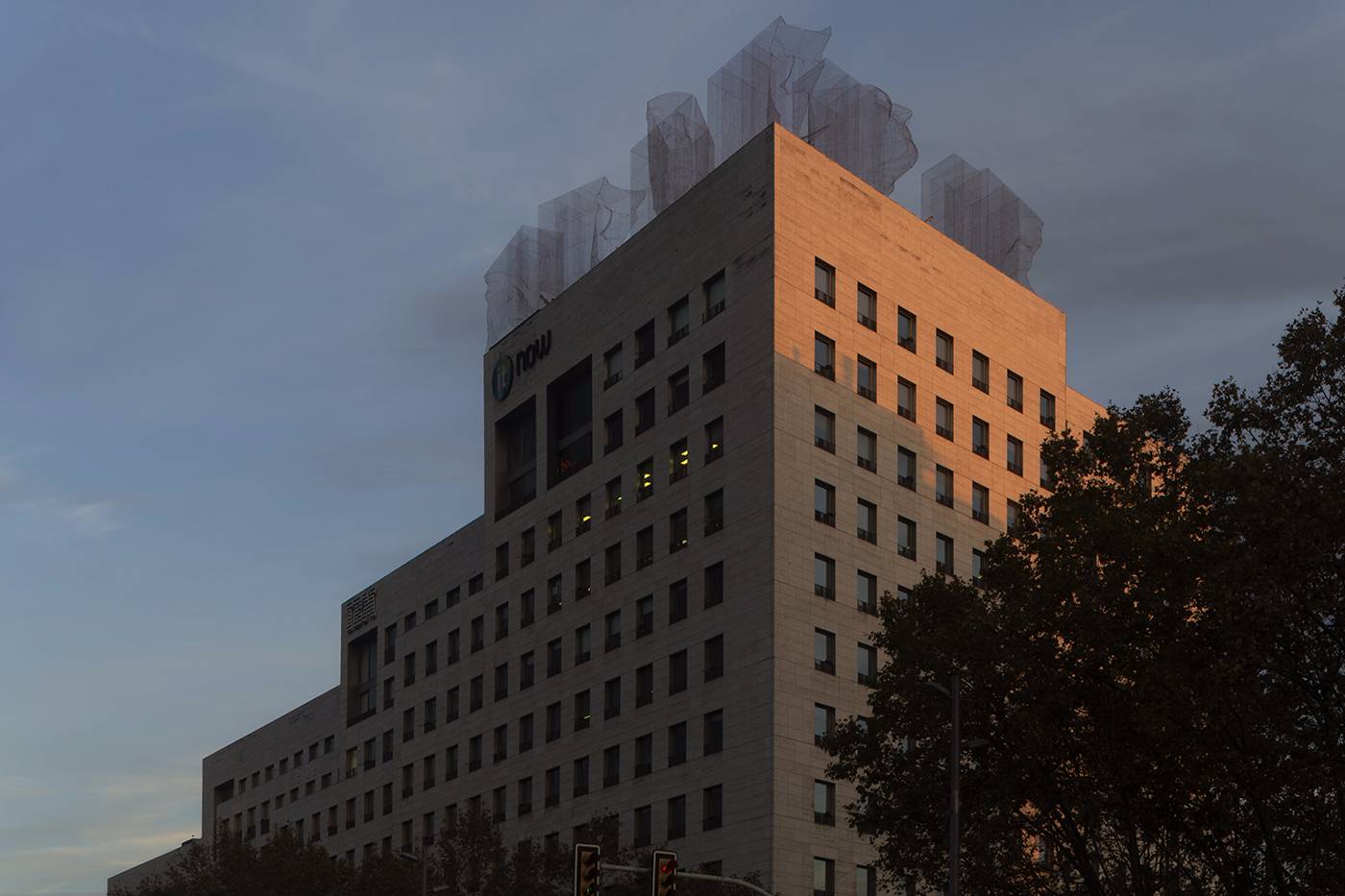 《邊界》的體量延伸到建筑的最高點(diǎn),距離地面約56米。裝置由6個(gè)5.5米高的透明金屬絲網(wǎng)體塊構(gòu)成,并沿著屋頂?shù)倪吘壟帕校總€(gè)體塊的側(cè)面都呈現(xiàn)出一張“人臉”。該裝置與L’Illa Diagonal大樓的建筑形態(tài)產(chǎn)生了相互作用,但其富有韻律的觀感則來(lái)源于“人臉”的不同朝向。抽象元素和比喻元素共同為裝置賦予了一種在“滿(mǎn)”與“空”之間不停變化的可塑張力,這在觀者圍繞建筑移動(dòng)時(shí)將展現(xiàn)得更加明顯。