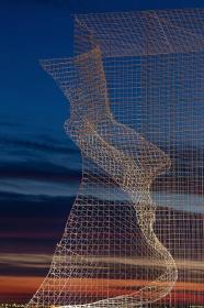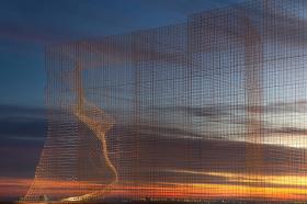 《邊界》輕柔地“降落”在城市上空,與觀看它的人形成一種漸進(jìn)式的連接。裝置中呈現(xiàn)的“人臉”時(shí)而抽象,時(shí)而具體,并且會(huì)根據(jù)觀察者視角的變化而產(chǎn)生不同的效果,同時(shí)捕捉光線(xiàn),與天空融為一體。
