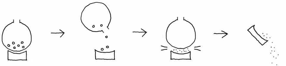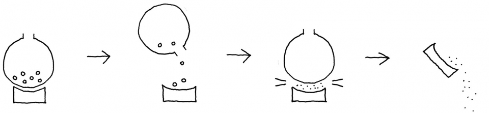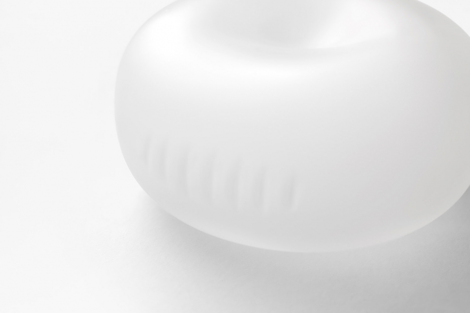 該產(chǎn)品由一個(gè)裝滿胡椒粒的圓形玻璃容器和一個(gè)由相同材料制成的基座組成。使用時(shí),將干燥的胡椒粒從容器中倒入底部的基座中。然后將圓形容器的底部用作「研杵」,并將其底基座用作「研缽」以便手動(dòng)研磨胡椒粉。圓形容器的中央部分略微凹進(jìn),易于抓握,并且底部比身體其他部分厚,從而提高了自身強(qiáng)度。