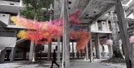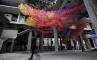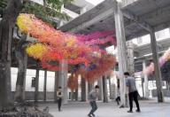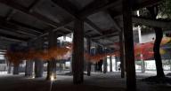 本次展覽使用了特定的場館空間,裝置作品在空間上與建筑的屬性產生對話,創(chuàng)造了具備沖擊力的設計語言,根據建筑空間的條件,一條40米的長龍貫穿建筑的空間,通過色彩、形體與環(huán)境的塑造制造一種矛盾,其反映中國商業(yè)發(fā)展環(huán)境與環(huán)保生態(tài)周遭的集中矛盾。這個矛盾建立在美的誘惑與現實的反思之間,通過將一種非自然的美感與現實聯系,創(chuàng)作者嘗試把握城市發(fā)展的矛盾去成立一個警惕性。