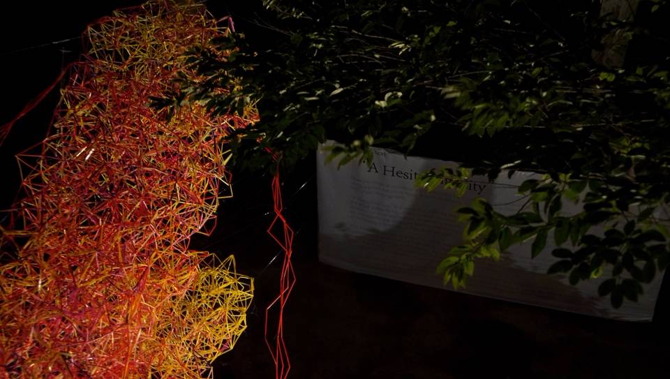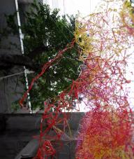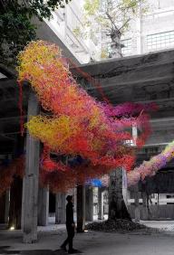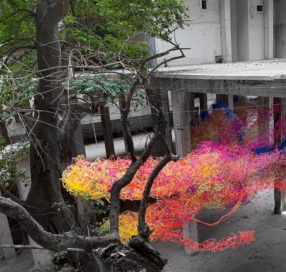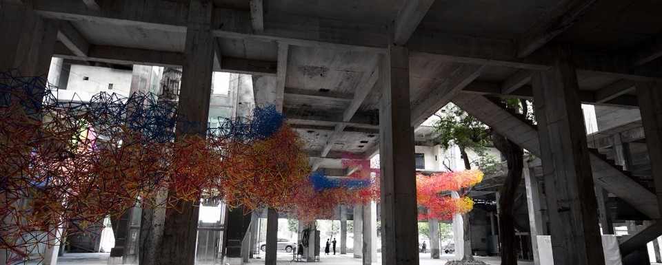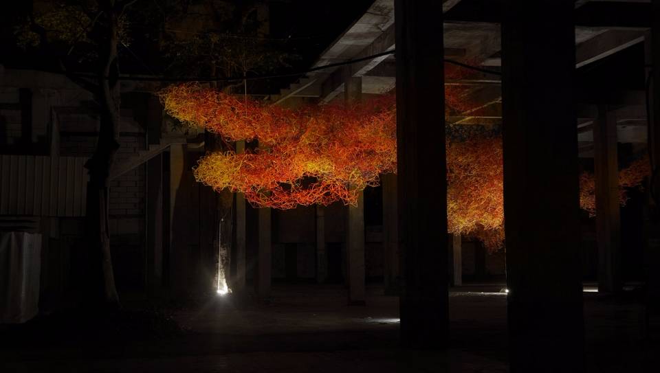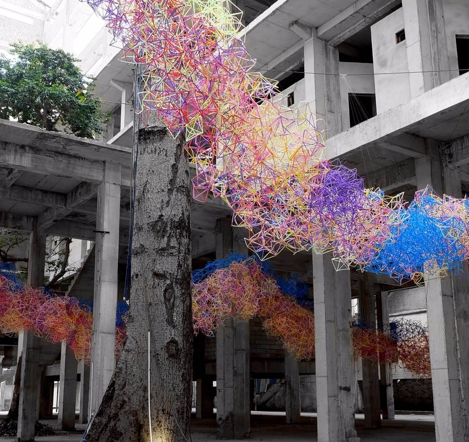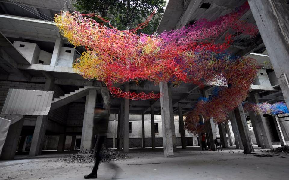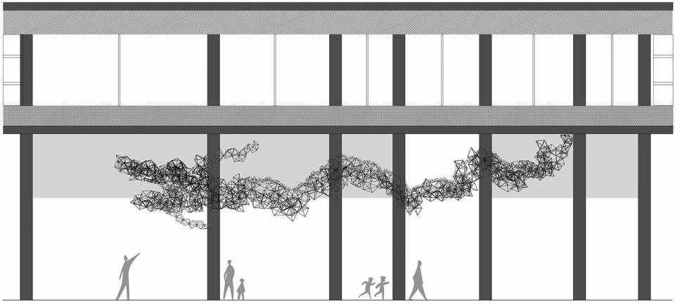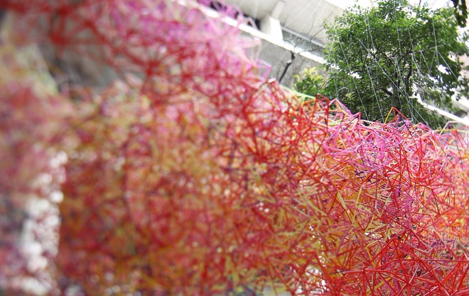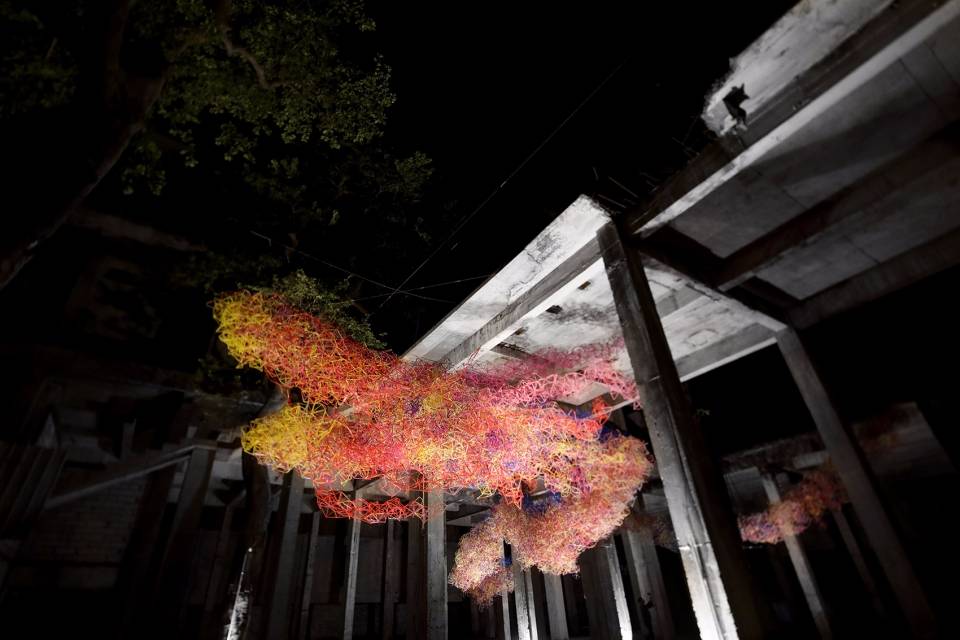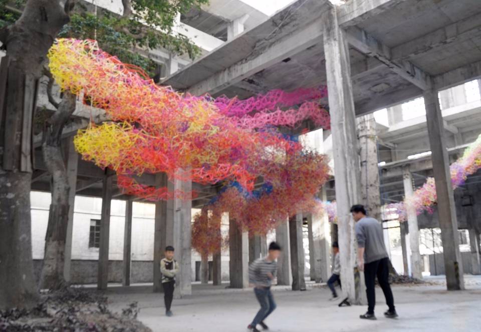 由獨立的吸管通過內部尼龍細絲以三角形結構相互連接纏繞,復制延伸形成的空間組織形態(tài),近看是一個無限擴延、密集的不規(guī)則結構,而從遠的角度則支撐為龍的軀體造型。
