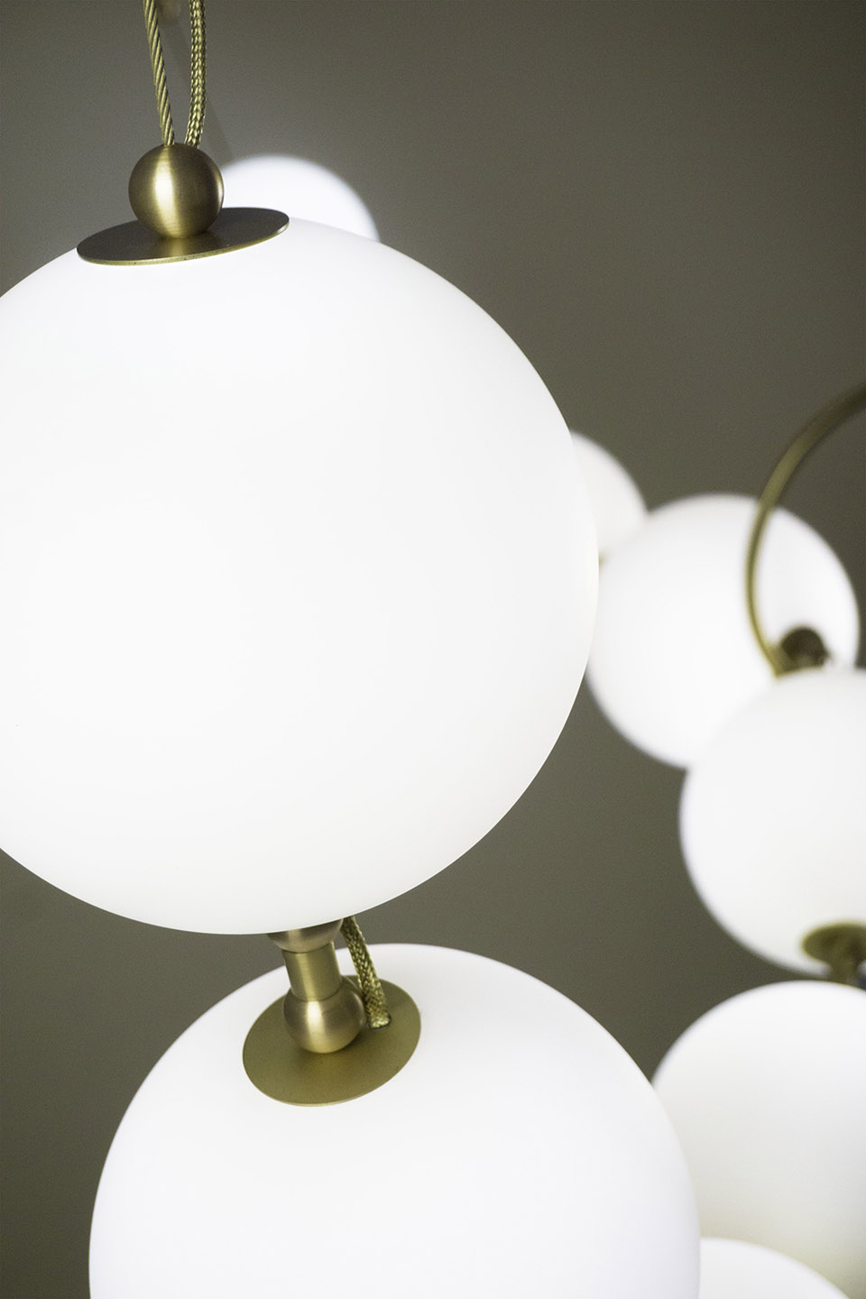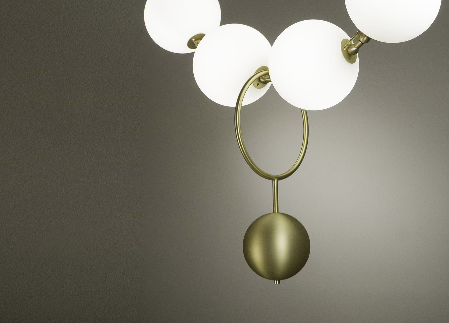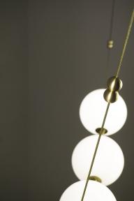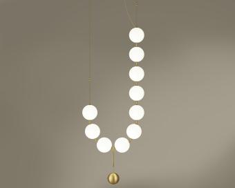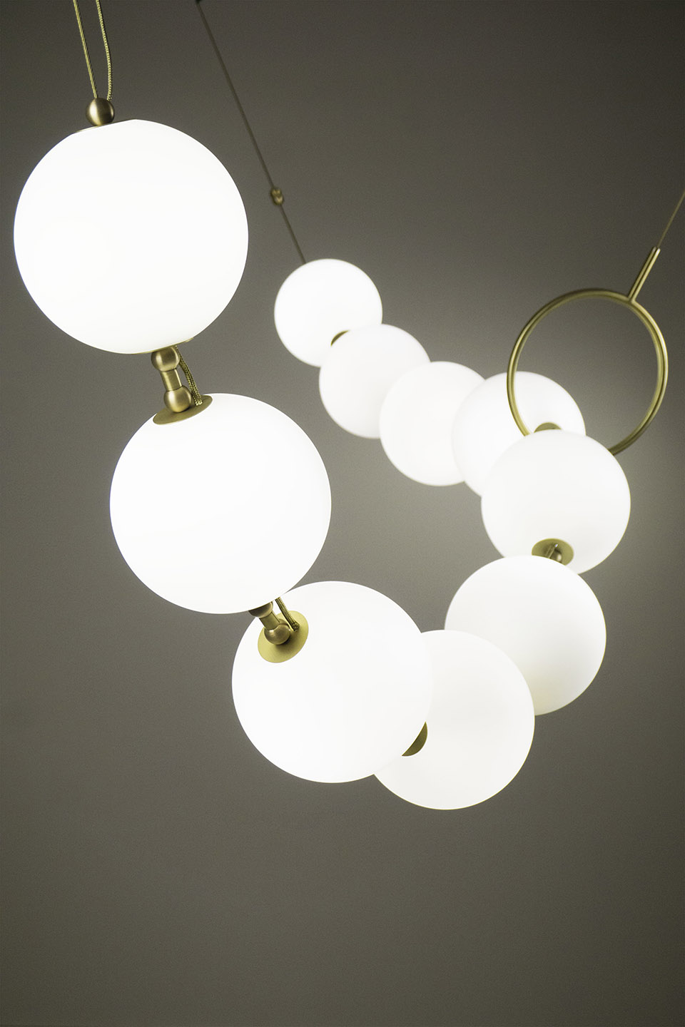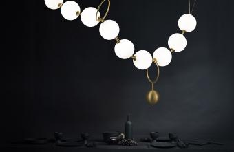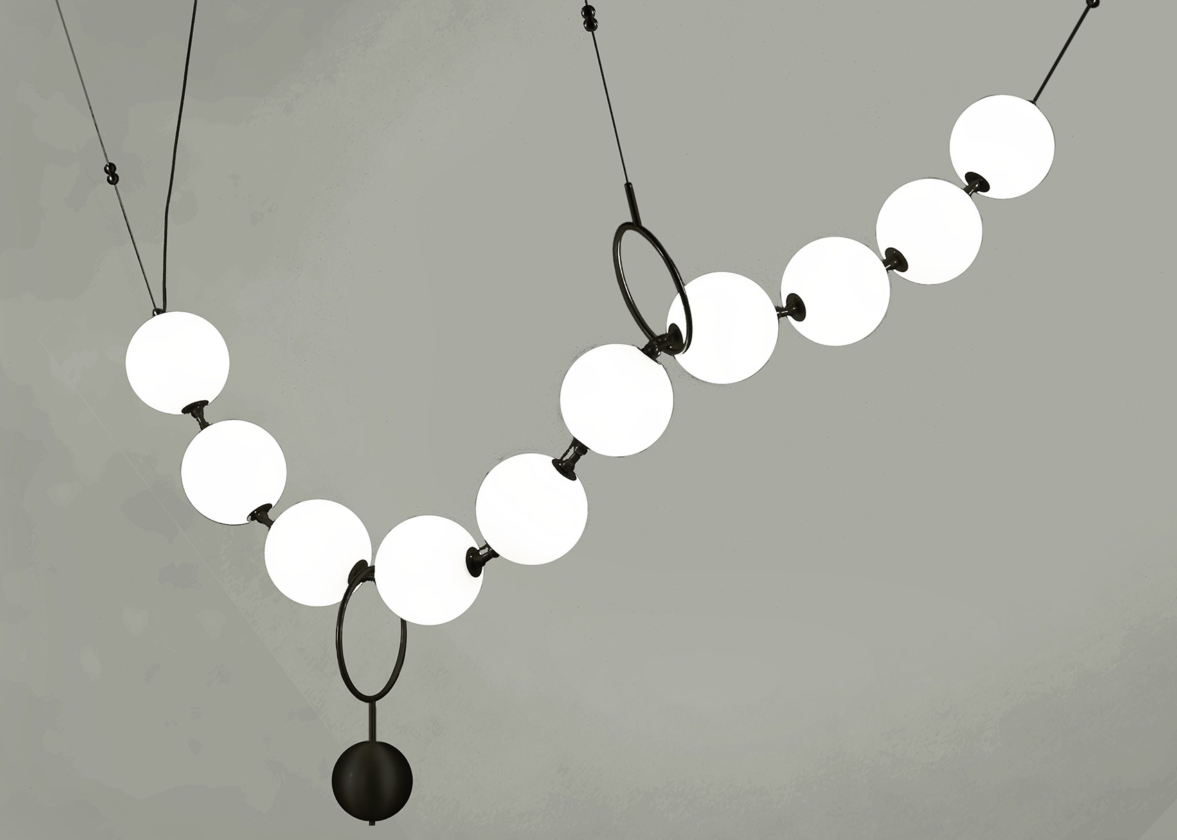 Coco從香奈兒的珠寶和時裝中汲取靈感,其設(shè)計猶如一串發(fā)光珍珠項鏈。10個手工吹制的玻璃球以柔性方式連接,實現(xiàn)了靈活性。此外,燈上懸掛的配重、掛鉤、天花板緊固件和圓環(huán)相互補充,能夠在解決平衡問題的同時滿足多種環(huán)境和空間的使用需要。Larose Guyon的設(shè)計美學(xué)超越了視覺層面,從情感和行為的角度來專注于燈具的設(shè)計,在為人們聚集的場所提供光亮的同時,還為這些場景賦予了詩意的氛圍。