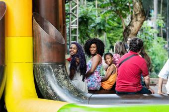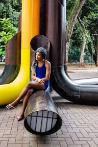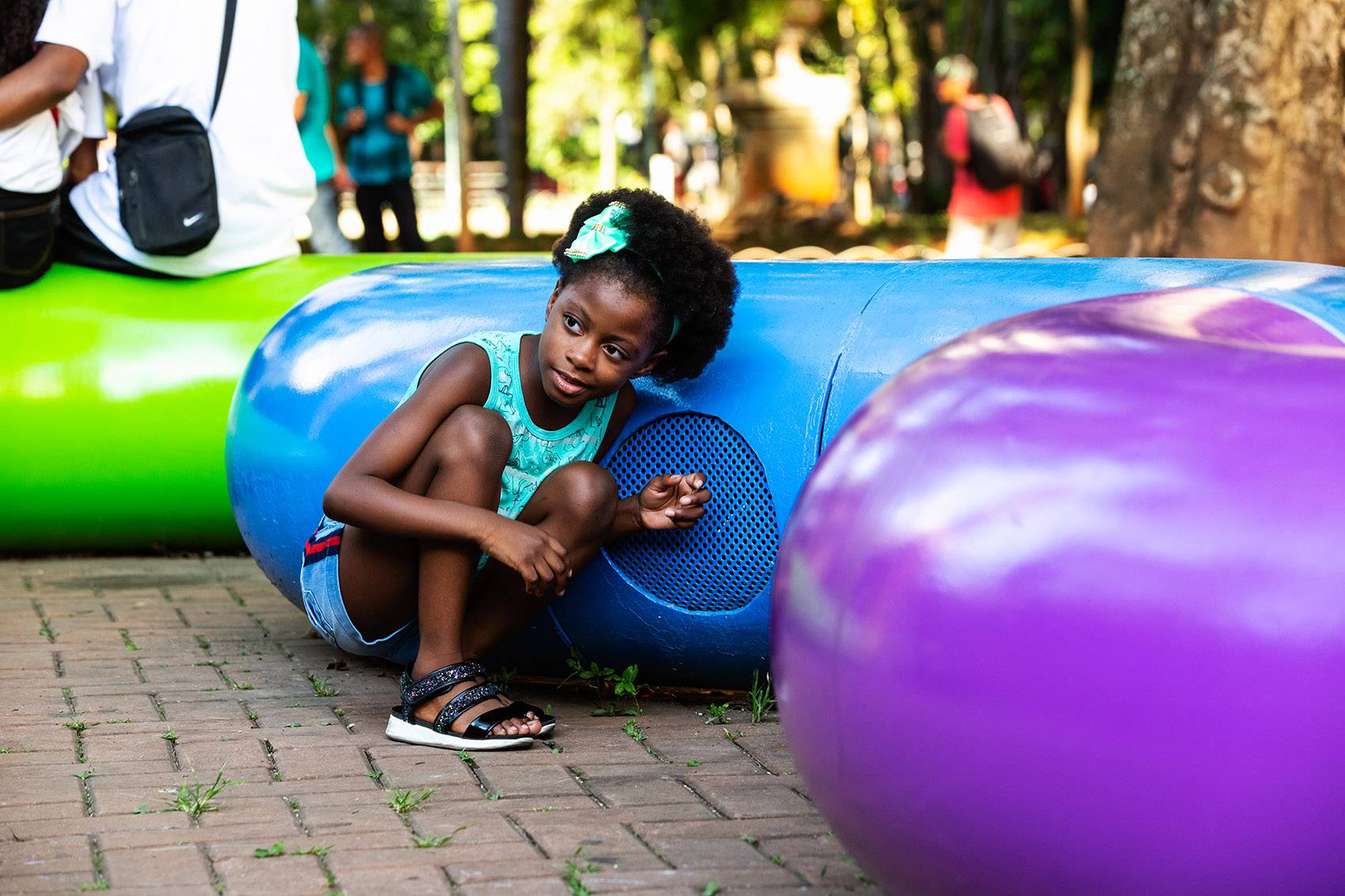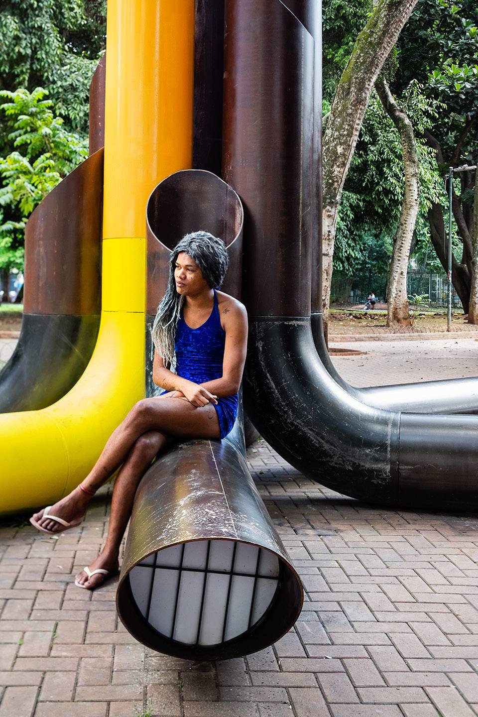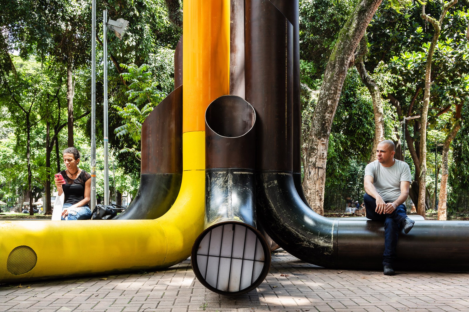 2017年,巴西是LGBT+群體被殺人數(shù)最多的國(guó)家。這座16米高的作品用通常在地下使用的金屬基礎(chǔ)設(shè)施圓筒組裝成一個(gè)引人注目的結(jié)構(gòu),如同是鑲嵌和消融在地面上的一個(gè)巨大的箭頭。圓筒內(nèi)裝有聲音系統(tǒng),可以播放LGBT+活躍分子講述其經(jīng)歷的音頻和講述故事時(shí)他們心跳的聲音。這些心跳脈沖也是裝置夜間燈光設(shè)計(jì)的算法依據(jù),講述故事的音頻日夜循環(huán)播放?!业男奶c你同一節(jié)奏’使用LGBT+旗幟上的顏色,從雕塑核心的圓筒延伸出來(lái),沿著地面蜿蜒形成公共座椅。