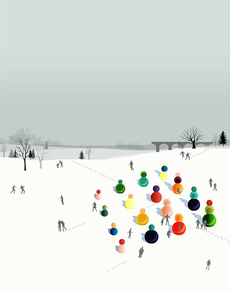 “天氣預(yù)報員”的規(guī)模從5英尺高的實體到10英尺高的內(nèi)部中空亭子不等,這些亭子作為取暖小屋可供人們進(jìn)入內(nèi)部使用?!疤鞖忸A(yù)報員”內(nèi)部雕刻堆疊絕緣泡沫,外部采用石膏涂層,涂刷為各種暖色調(diào)的顏色。通過在貧瘠、寒冷的環(huán)境中引入暖色調(diào),取暖小屋在視覺和物理上活躍了所處場地?!疤鞖忸A(yù)報員”在安裝開始時都處于同一地面高度。在冬季風(fēng)暴期隨著雪的堆積,參觀者可以通過“天氣預(yù)報員”這一熟悉的人體度量工具來推測降雪量。
