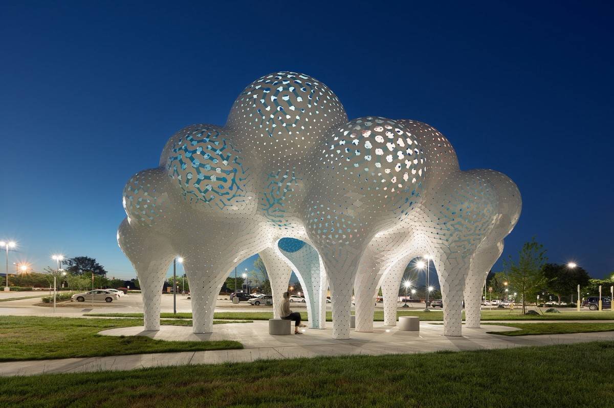 這個生機勃勃的構(gòu)筑物似乎漂浮在在北卡羅來納州夏洛特最近翻新的Valerie C. Woodard中心的廣場上。夢幻之柱是一個需要親自體驗的裝置。這個云朵一般的臨時構(gòu)筑物通過九根支柱固定在地面上,連續(xù)的鋁制表面構(gòu)成了頂部的雙層曲線頂篷,其中一部分同時形成這幾根支柱。開放的支柱被分解為成群的座位,為游客和職員建立了一個公共的聚會場所。