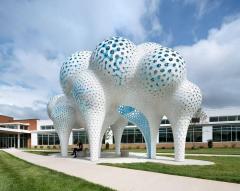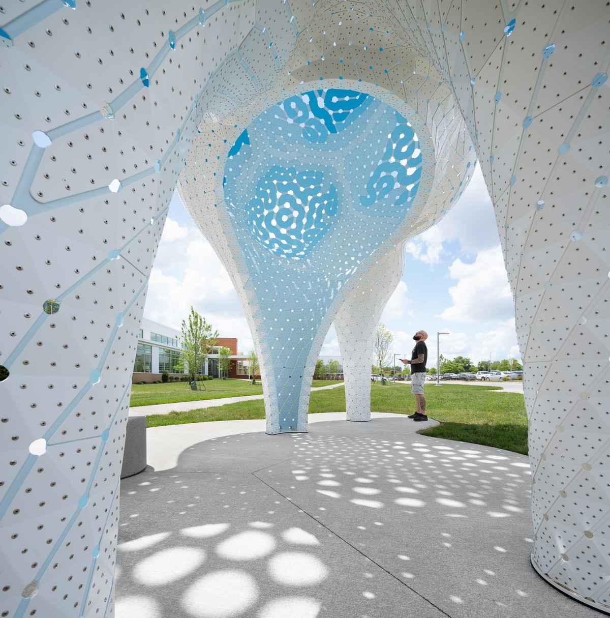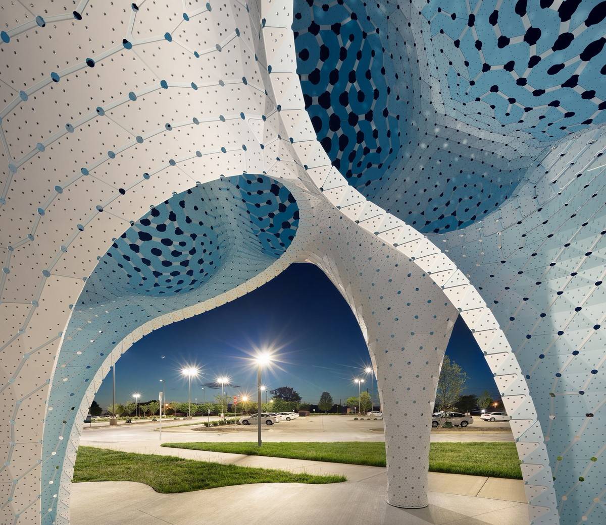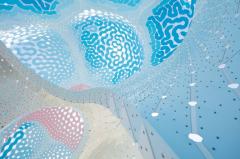 基于工作室的典型結(jié)構(gòu)聚合球體(如Double Agent White,SituationRoom,a pop-upfor Louis Vuitton),在夢幻之柱中,這些球體被推向了空中。在頭頂26英尺(約7.9米)處,它們像氣球一樣飄浮著。但不是氦氣使它們漂浮,也不是任何主要或次要的結(jié)構(gòu):在球狀聚集體上繃緊的表皮自身具有支撐作用。兩層3mm的表面上的復雜圖案穿過了雙層曲面與管狀柱的約束曲面之間的大面積區(qū)域。