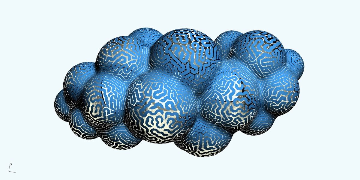 超薄表皮的兩個面組成了兩種顏色的錯綜復雜的部分。將三維網(wǎng)格分解為線性或非線性條紋時,表皮被劃分開來。非線性條紋由基于主體的并行搜索協(xié)議確定,是程序的不明確的結(jié)果,即在急轉(zhuǎn)彎時改變算法。當它們在接縫處碰到并向地面延伸時,就像線性條紋一樣對齊。在廣闊的球體表皮上,它們表達了計算描述的遞歸性質(zhì)。圖案中的分叉和裂縫收緊或擴散來產(chǎn)生孔隙。就像吹泡泡糖一樣,在爆裂的臨界點,表皮變得更薄,在更大的球體上更加開放,能夠讓光線通過。在球體融合的地方,條紋更密集地包裹體量之間的部分,以便適合于結(jié)構(gòu)的性能。