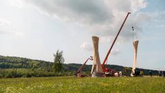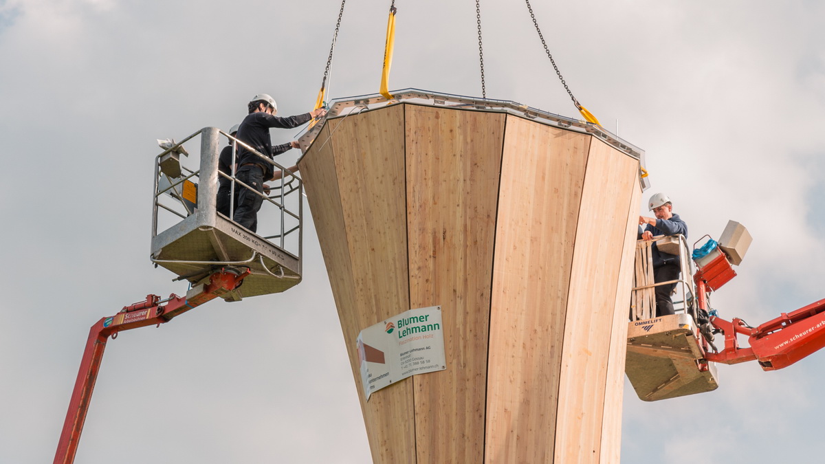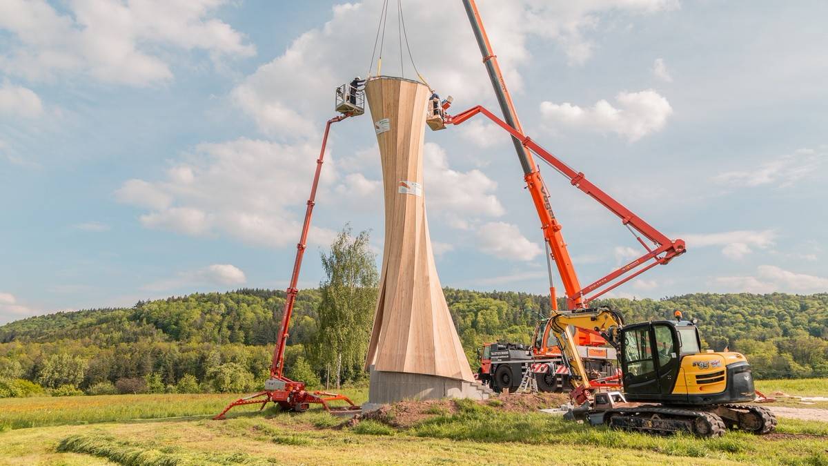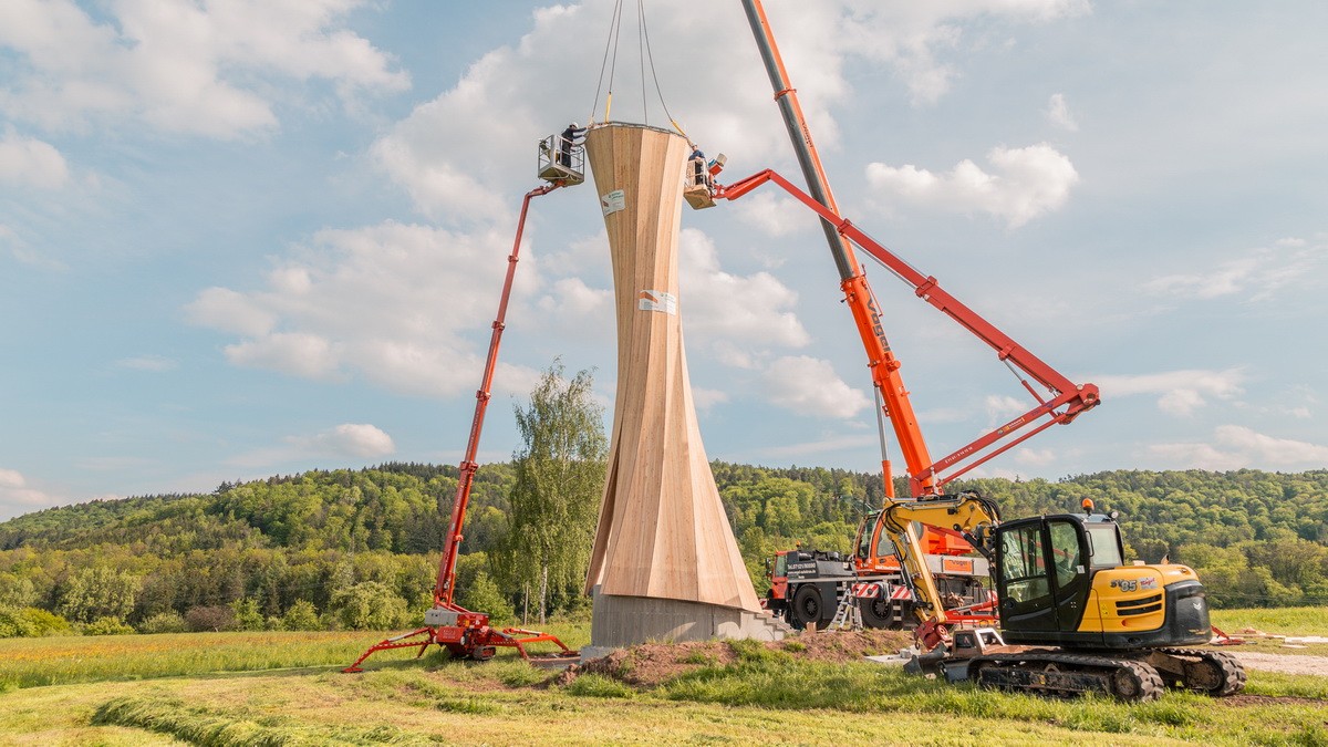 烏爾巴赫塔是一種獨(dú)特的木結(jié)構(gòu)。塔樓的設(shè)計(jì)源于彎曲木材構(gòu)件的一種新的自成型工藝。這一開(kāi)拓性的發(fā)展構(gòu)成了木材制造的一個(gè)范式轉(zhuǎn)變,從需要重型機(jī)械的精細(xì)和能源密集型機(jī)械成型過(guò)程,轉(zhuǎn)變?yōu)橥耆刹牧献陨沓尚偷倪^(guò)程。