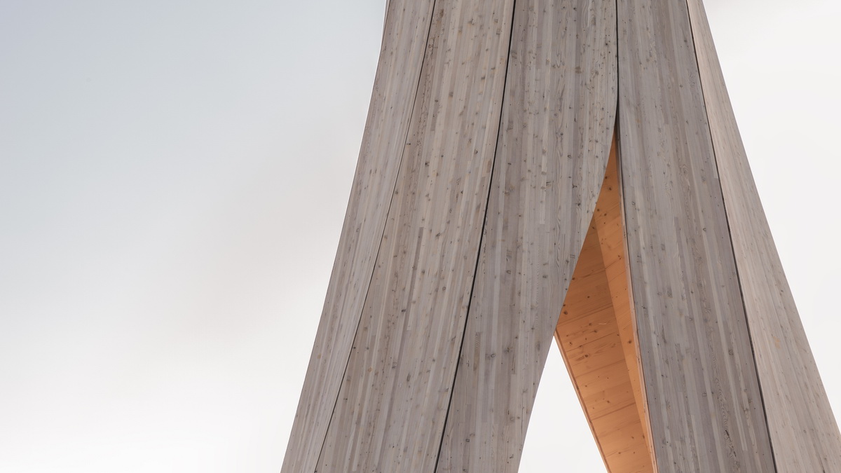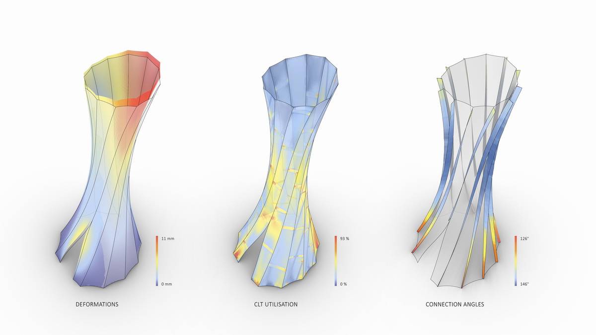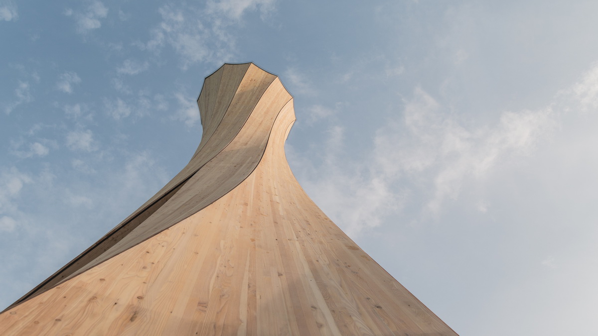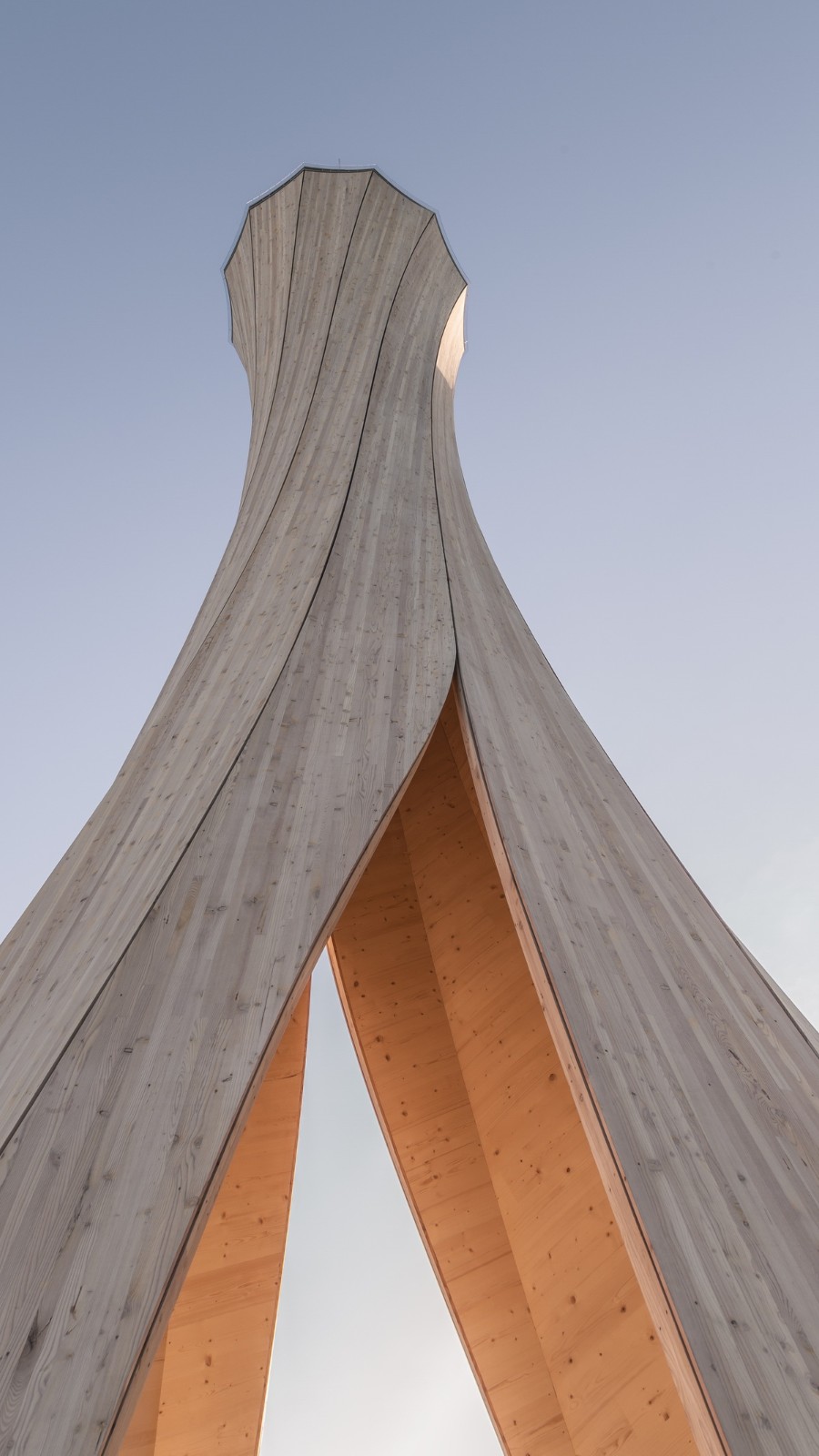 這種形狀的變化僅僅是由木材在含水率降低時(shí)收縮的特性引起的。14米高塔身的部件是在平面狀態(tài)下設(shè)計(jì)和制造的,并在行業(yè)標(biāo)準(zhǔn)的技術(shù)干燥過(guò)程中自動(dòng)轉(zhuǎn)換成最終預(yù)測(cè)的曲線(xiàn)形狀。這為木材結(jié)構(gòu)開(kāi)辟了新的和意想不到的建筑可能性,使用可持續(xù)的、可再生的和當(dāng)?shù)氐慕ㄖ牧稀?/p>