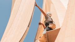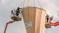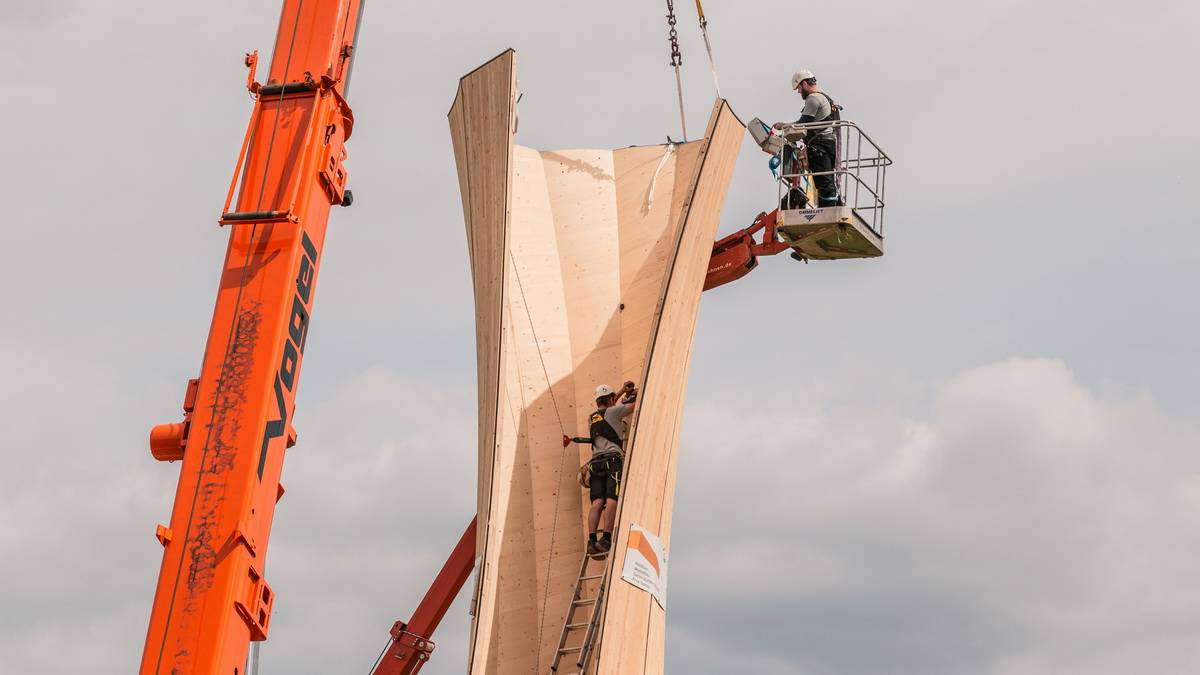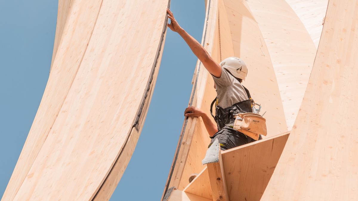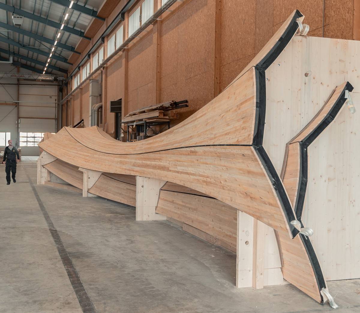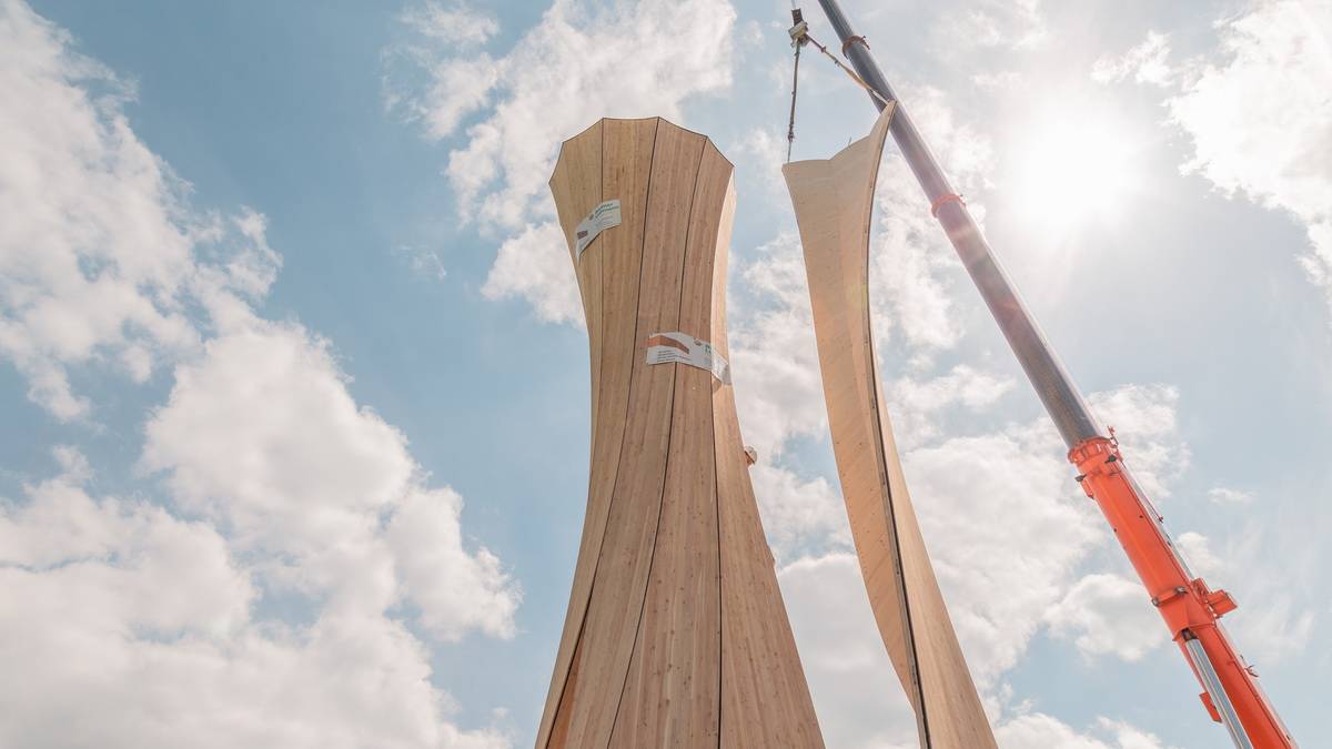 這種形狀的變化僅僅是由木材在含水率降低時(shí)收縮的特性引起的。14米高塔身的部件是在平面狀態(tài)下設(shè)計(jì)和制造的,并在行業(yè)標(biāo)準(zhǔn)的技術(shù)干燥過(guò)程中自動(dòng)轉(zhuǎn)換成最終預(yù)測(cè)的曲線(xiàn)形狀。這為木材結(jié)構(gòu)開(kāi)辟了新的和意想不到的建筑可能性,使用可持續(xù)的、可再生的和當(dāng)?shù)氐慕ㄖ牧稀?/p>