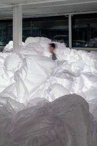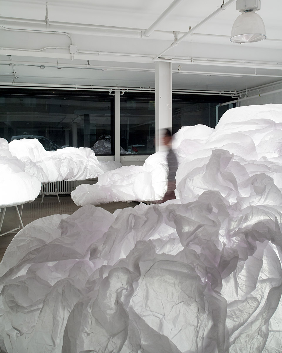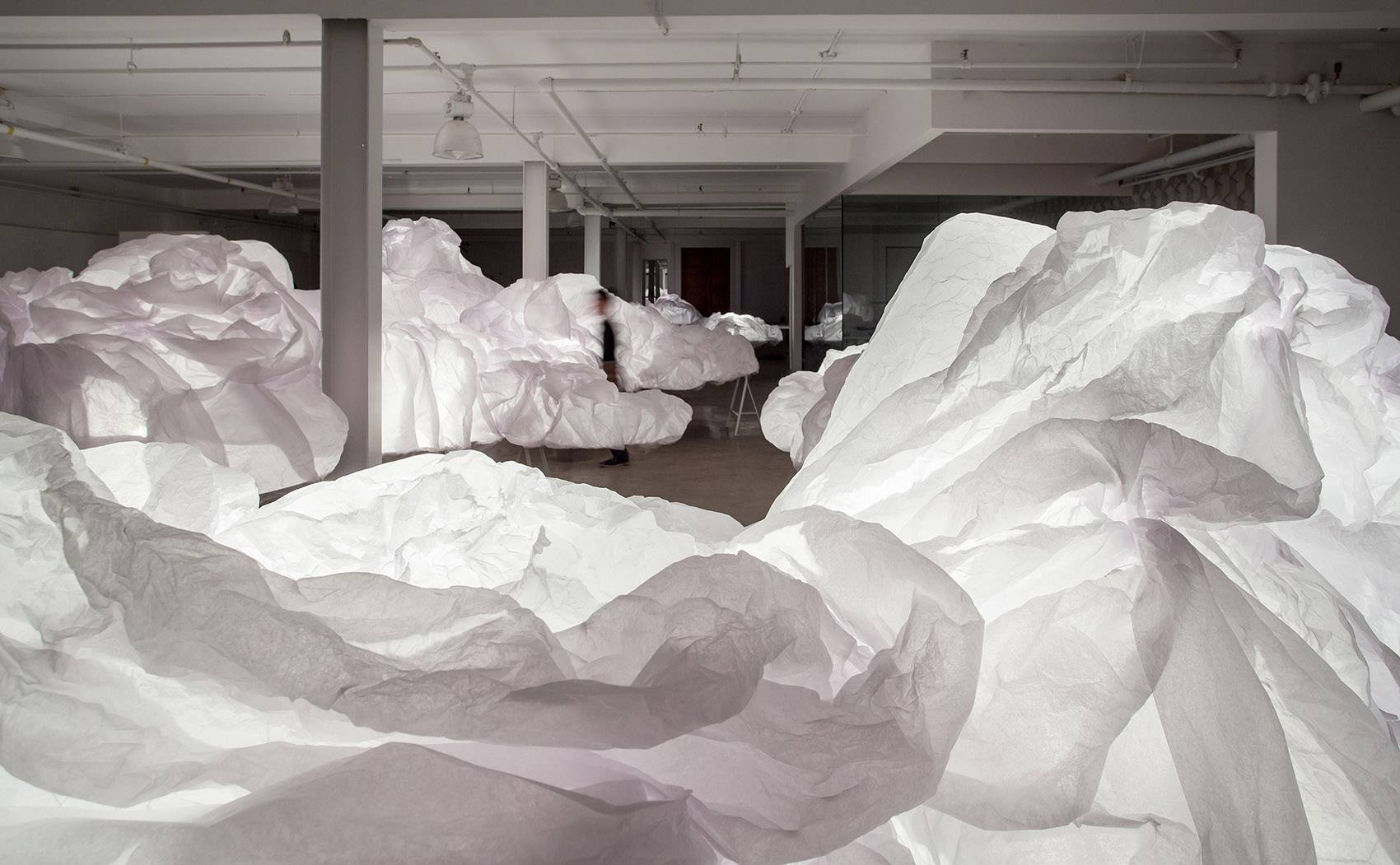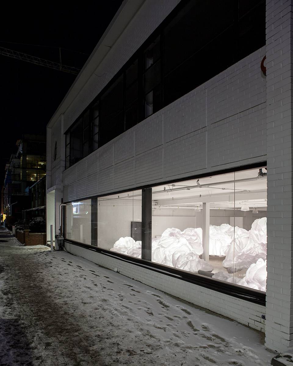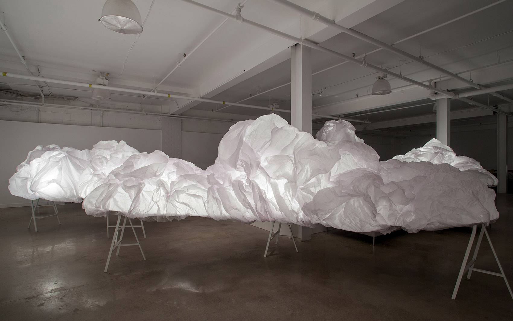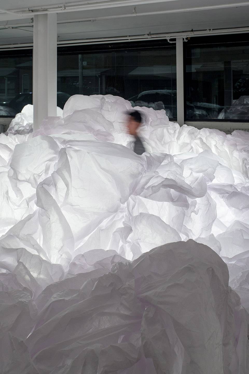在多倫多設(shè)計(jì)節(jié)(Toronto Design Offsite Festival)中,一系列云朵般的物體聚集安裝在一處特定場(chǎng)地中,充斥著整個(gè)展廊并形成一種令人安靜的氛圍。裝置具有互動(dòng)性及移動(dòng)敏感性,能夠根據(jù)周邊環(huán)境做出不同的反應(yīng):近距離觀察時(shí)發(fā)出光亮,遠(yuǎn)離時(shí)則光亮消散。通過(guò)將參觀者從現(xiàn)實(shí)引入一個(gè)充滿虛幻感的作品之中,人們能夠從喧囂的日常生活中掙脫出來(lái),獲得哪怕片刻的平靜時(shí)光。