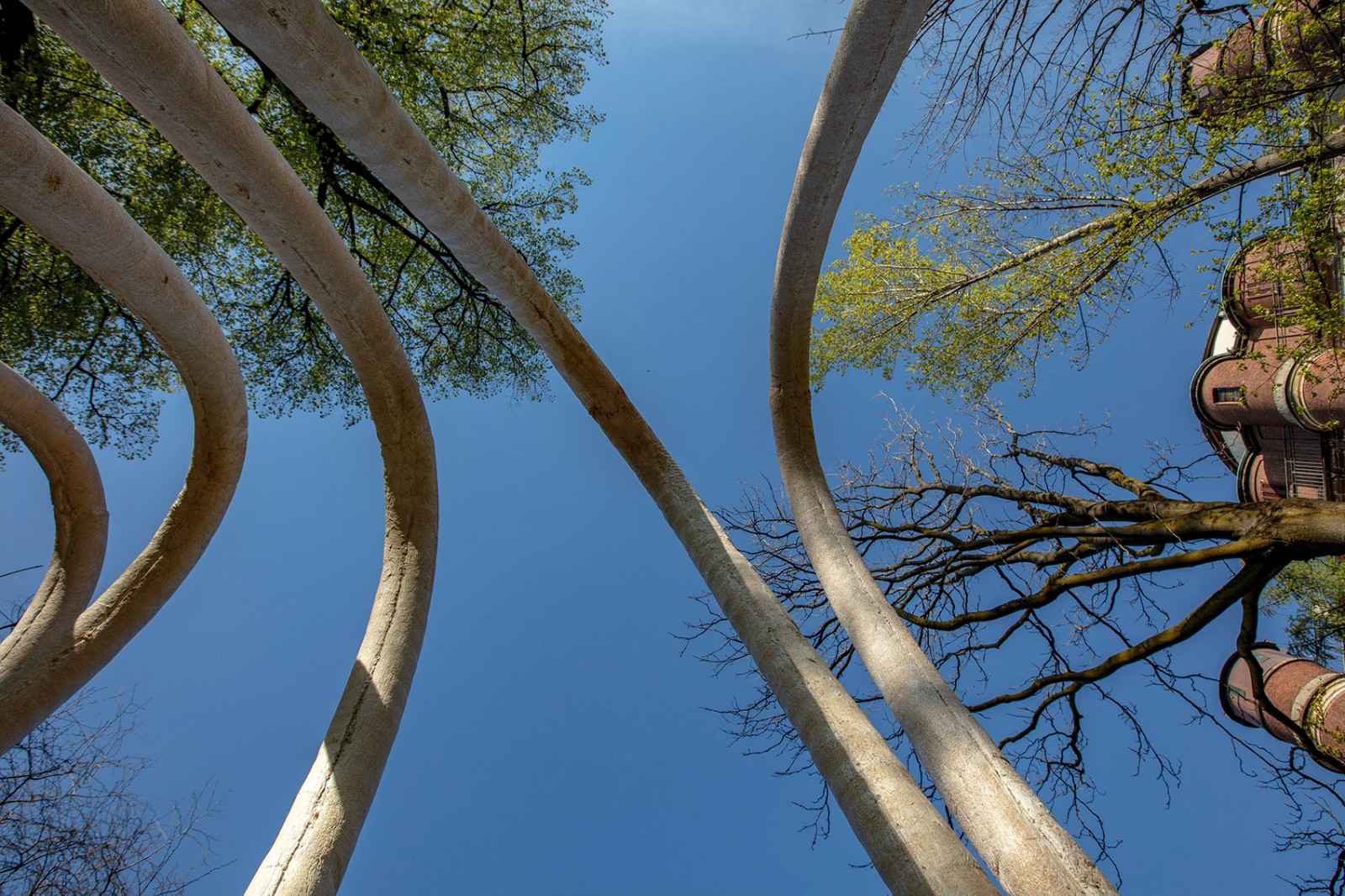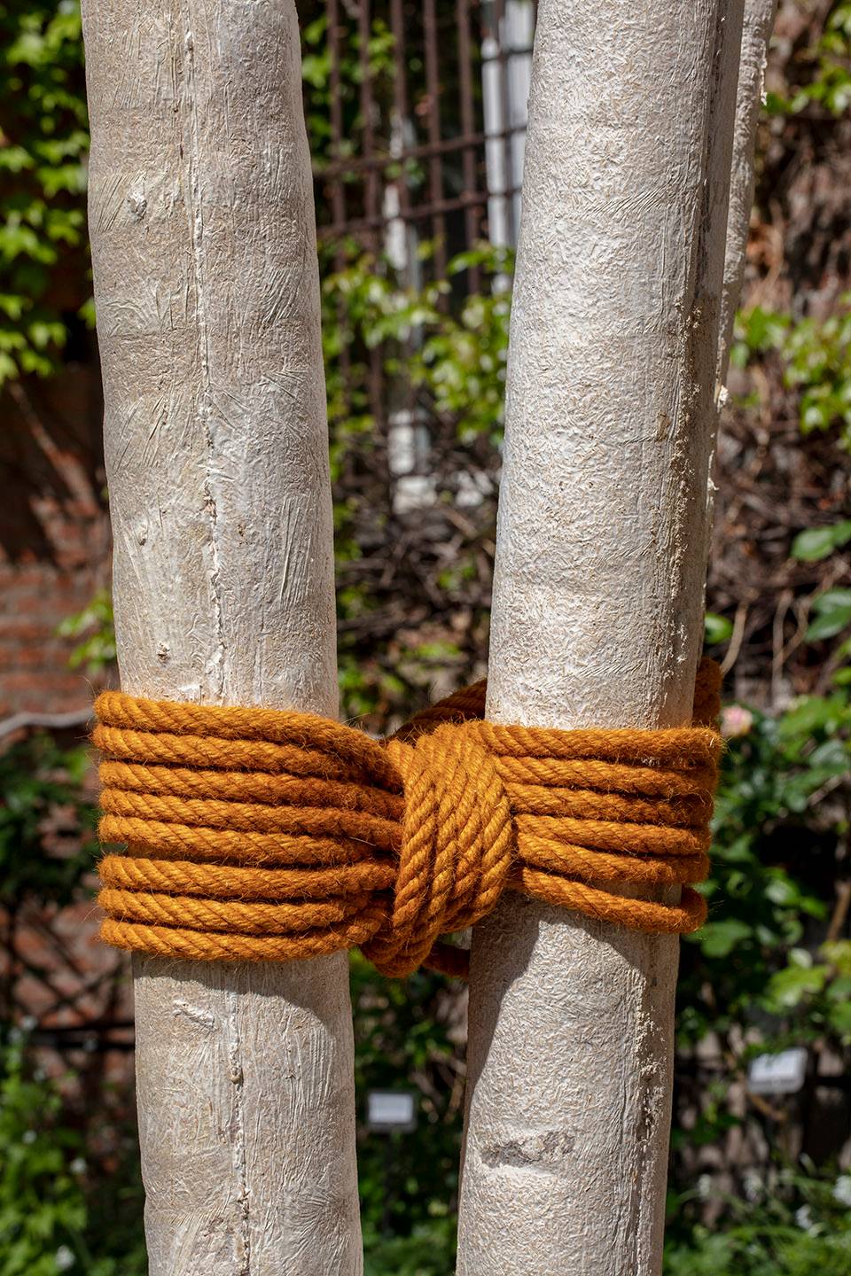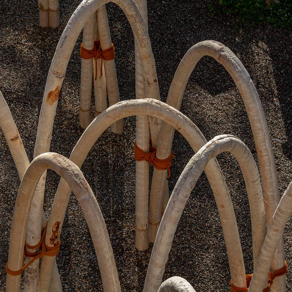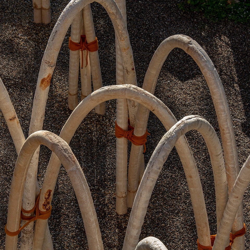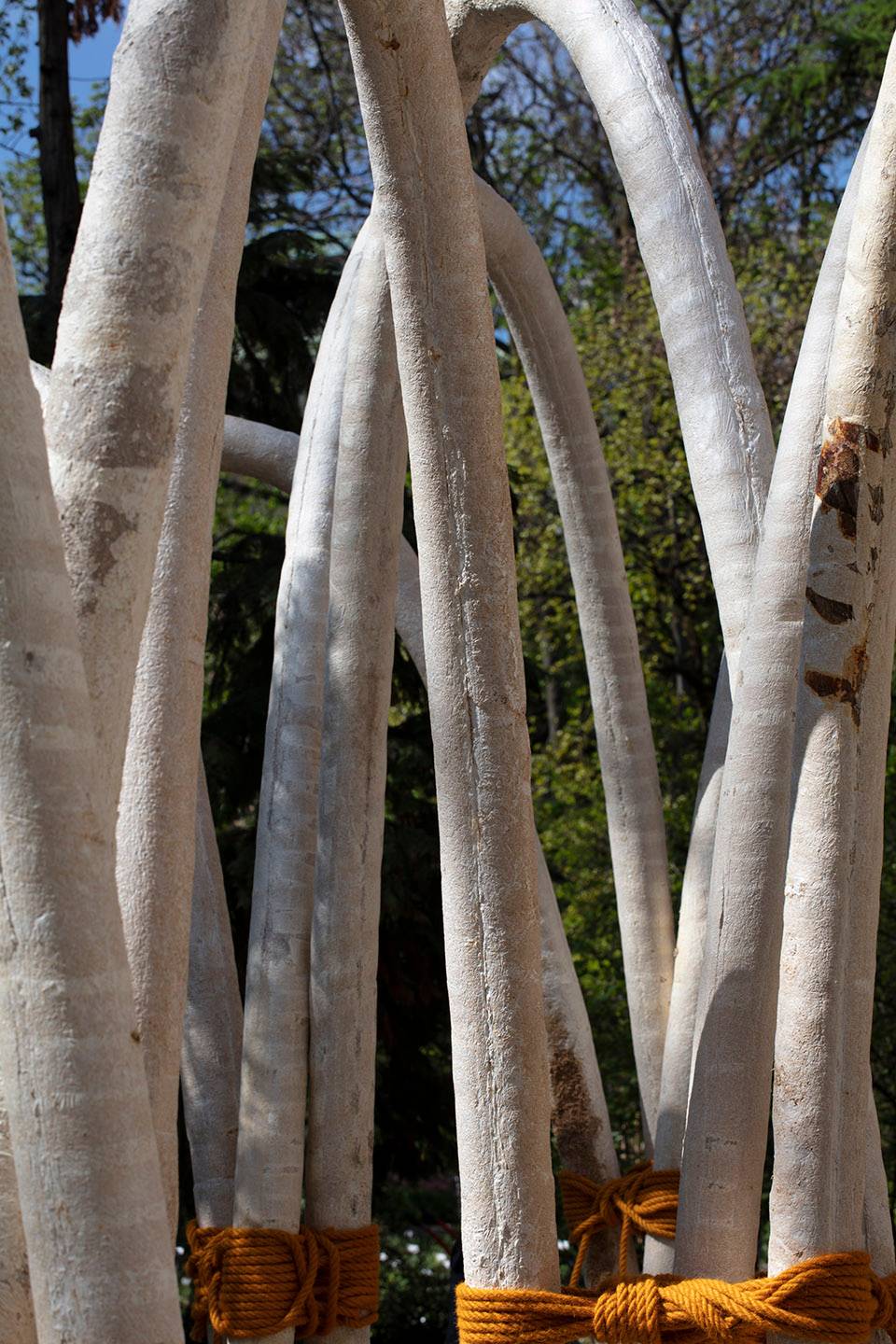 為了讓如此規(guī)模的菌絲體結(jié)構(gòu)能夠自我支撐,項目從偉大的加泰羅尼亞建筑師安東尼·高迪身上汲取靈感,正是他在設(shè)計巴塞羅那圣家族大教堂時復(fù)興了博學(xué)多識的喬瓦尼?波黎尼 (Giovanni Poleni)首創(chuàng)的倒置懸鏈線(inverted catenary)方式。按照這種方法,塑造一個純粹受壓結(jié)構(gòu)需要首先使用懸垂的鏈條找到結(jié)構(gòu)形狀,然后再將結(jié)構(gòu)翻轉(zhuǎn)過來。這種方法應(yīng)用在了The Circular Garden之中,懸鏈拱形成了4個散布于公園之中的“開放式房間”。