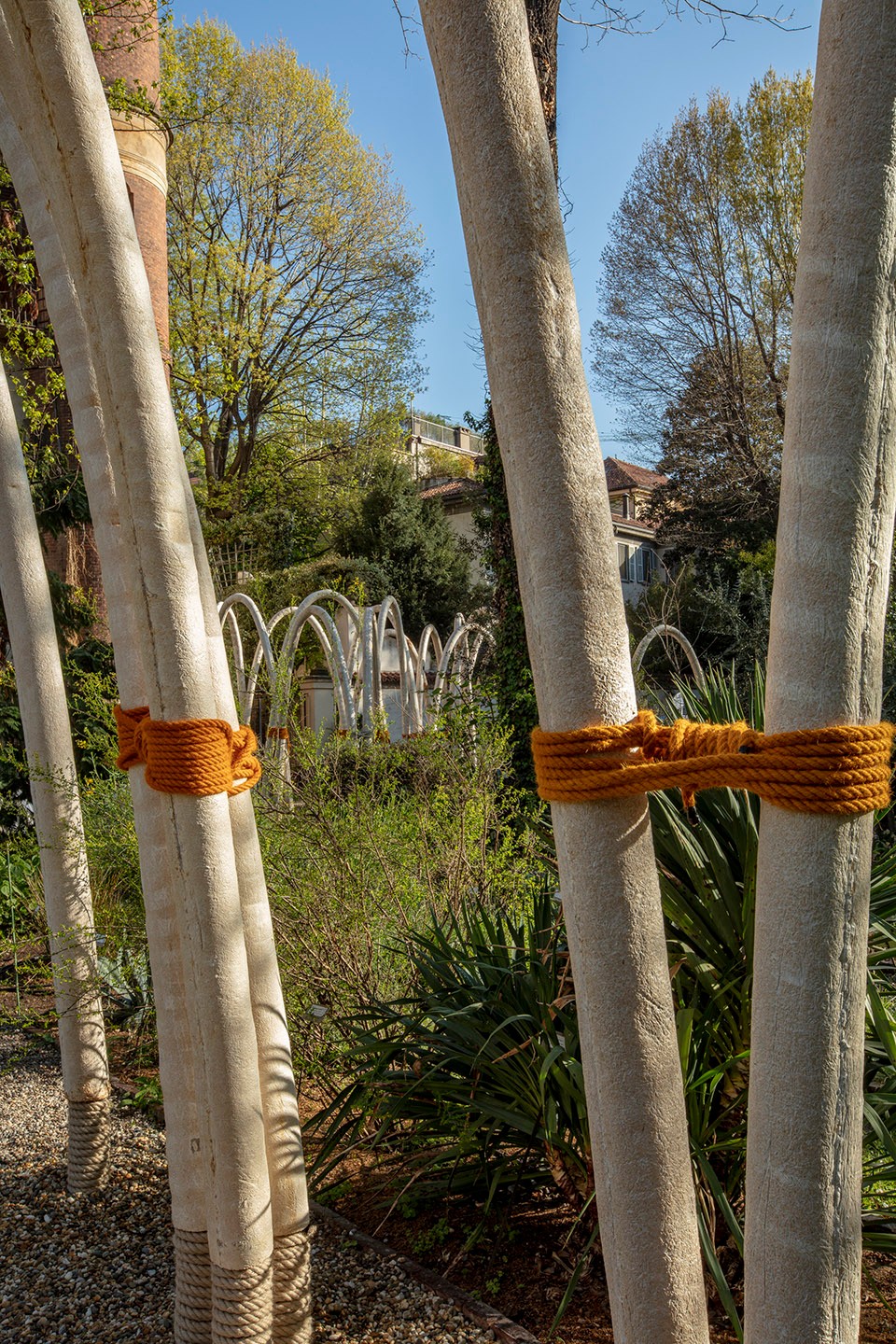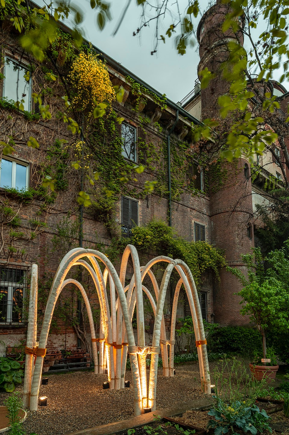 在真菌學(xué)領(lǐng)域重要專家尤其是荷蘭Krown.Bio實驗室的幫助下,設(shè)計團(tuán)隊將孢子注射入有機(jī)體中,讓菌絲體在The Circular Garden開放的前兩個月的時間內(nèi)生長成型。以同樣有機(jī)的方式,所有的菌絲體將在米蘭設(shè)計周結(jié)束時被粉碎,以循環(huán)的方式重歸土壤之中。這種循環(huán)方式類似于以前小鎮(zhèn)和城市花園中生產(chǎn)食物和有機(jī)廢物堆肥的方式。