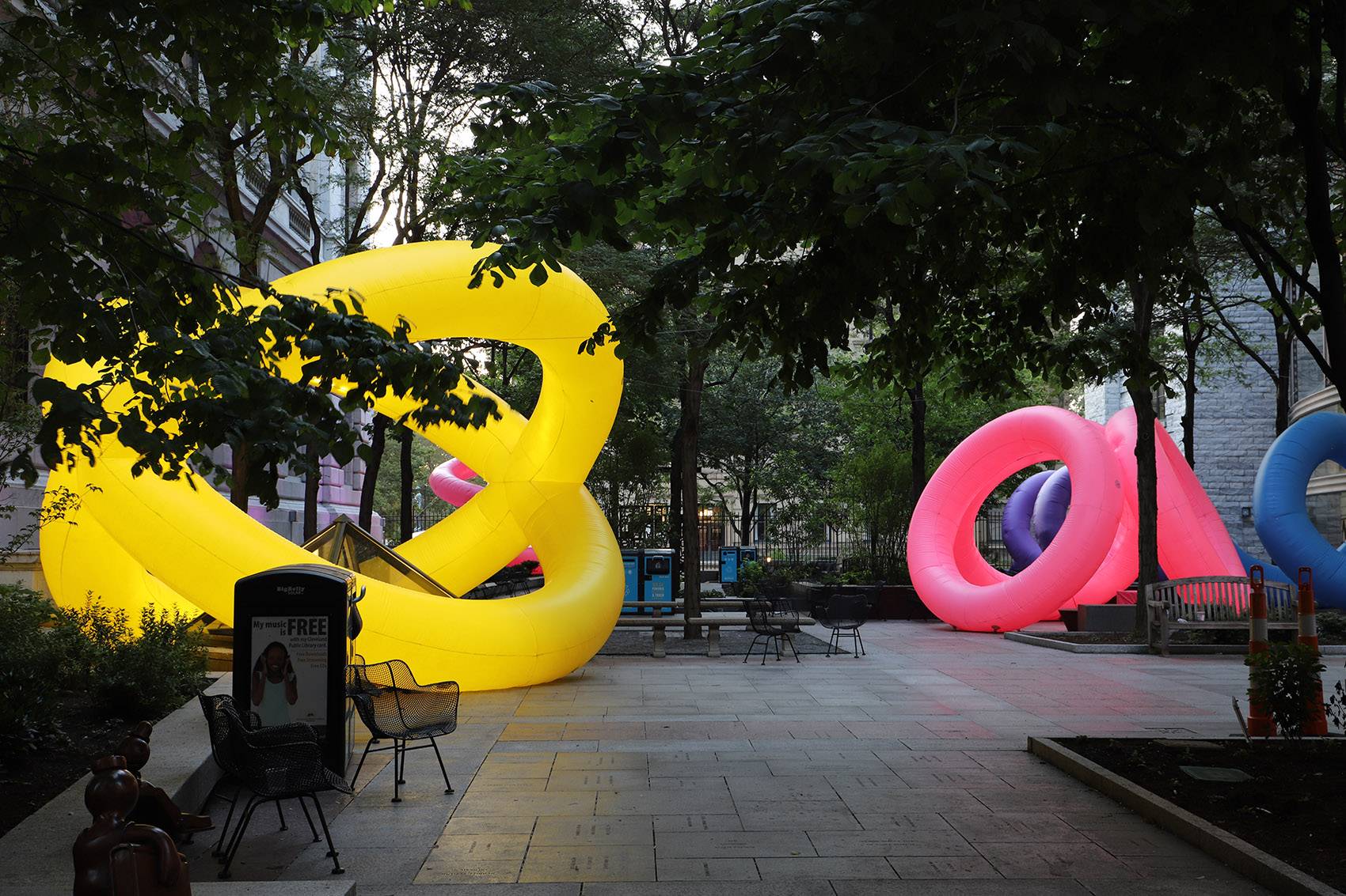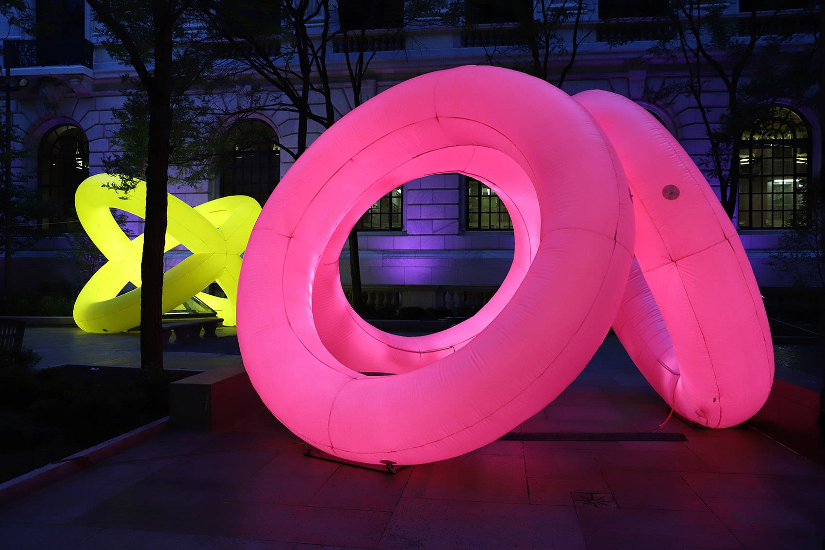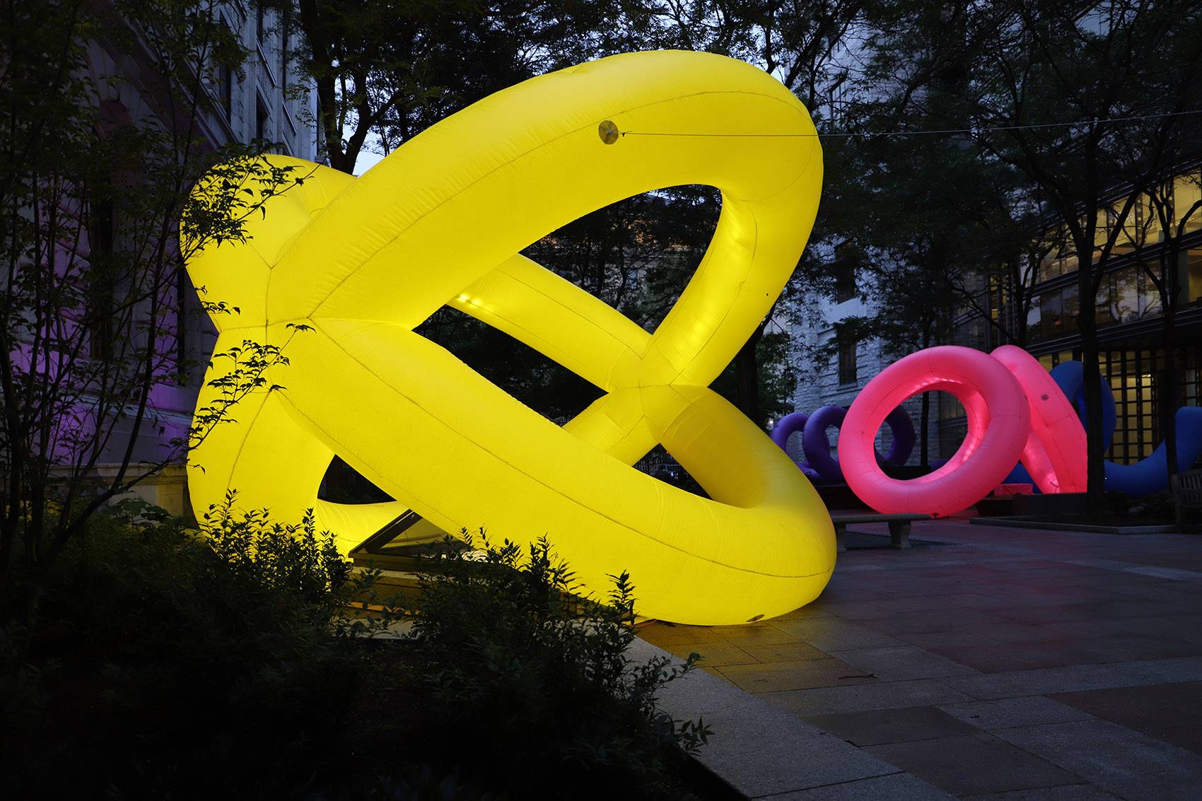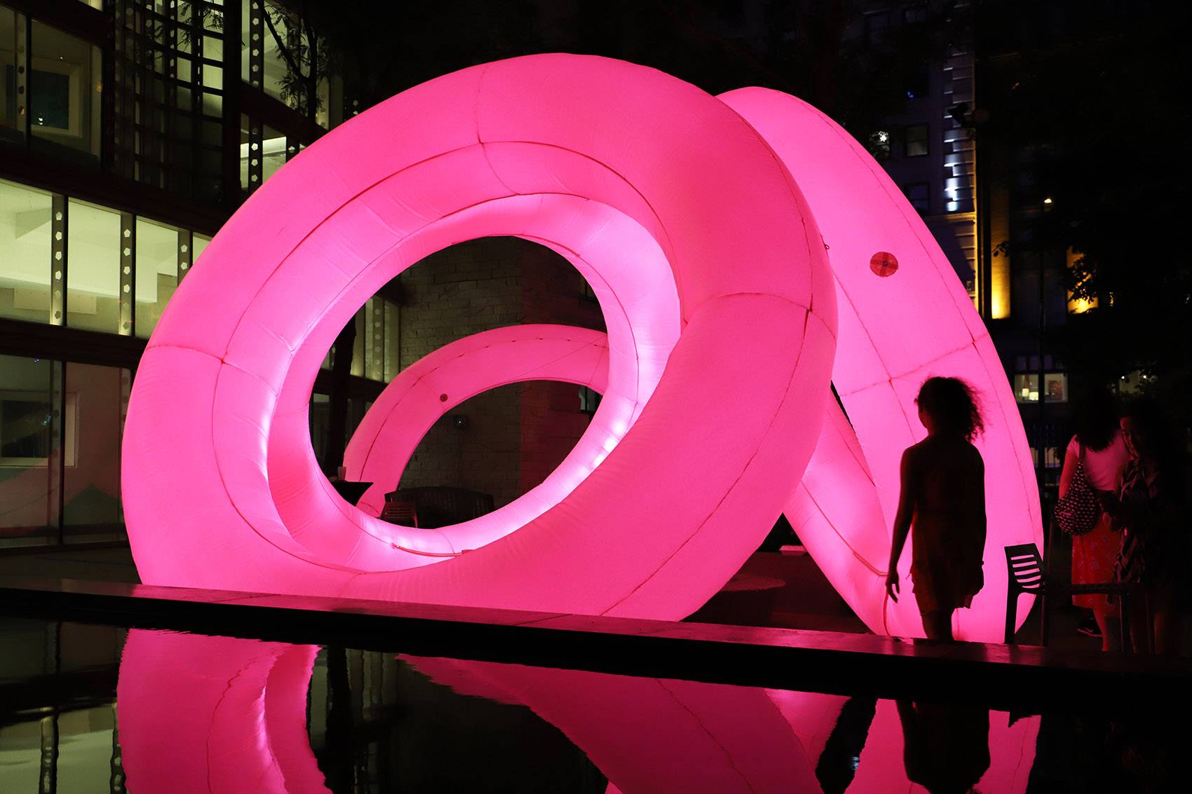 圓形的特征在于起點(diǎn)與終點(diǎn)的閉合,而任何一個(gè)點(diǎn)都可以充當(dāng)起點(diǎn)和終點(diǎn)。圓上的軌跡是不確定且無(wú)止境的。Inner Circles正是由環(huán)形和類似于環(huán)形的體量構(gòu)成的裝置,它們引導(dǎo)參觀者在花園的路徑上進(jìn)行探索,從每個(gè)視角都能夠看到一幅嶄新的畫面。這些充氣的雕塑旨在為游客帶來(lái)沉浸式的體驗(yàn),以柔軟的表面吸引著人們?nèi)ビ|摸,同時(shí)與空間產(chǎn)生互動(dòng)。