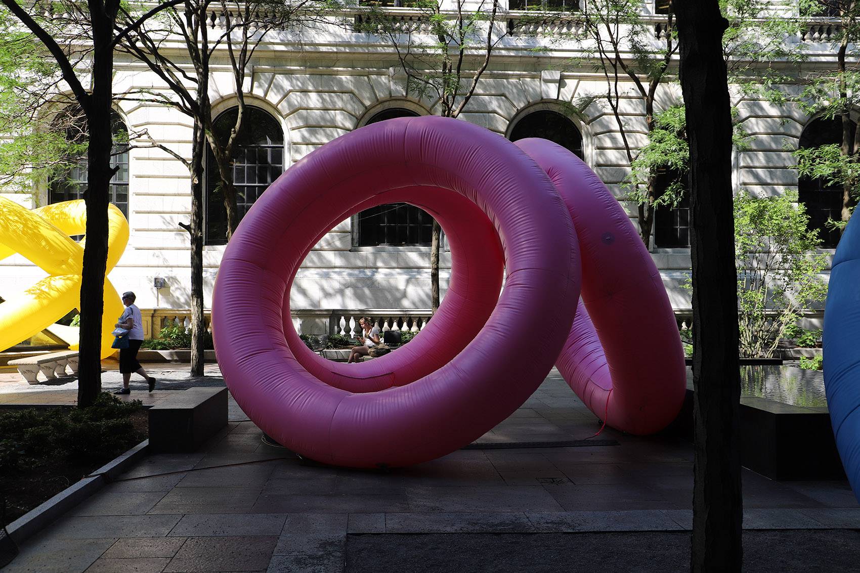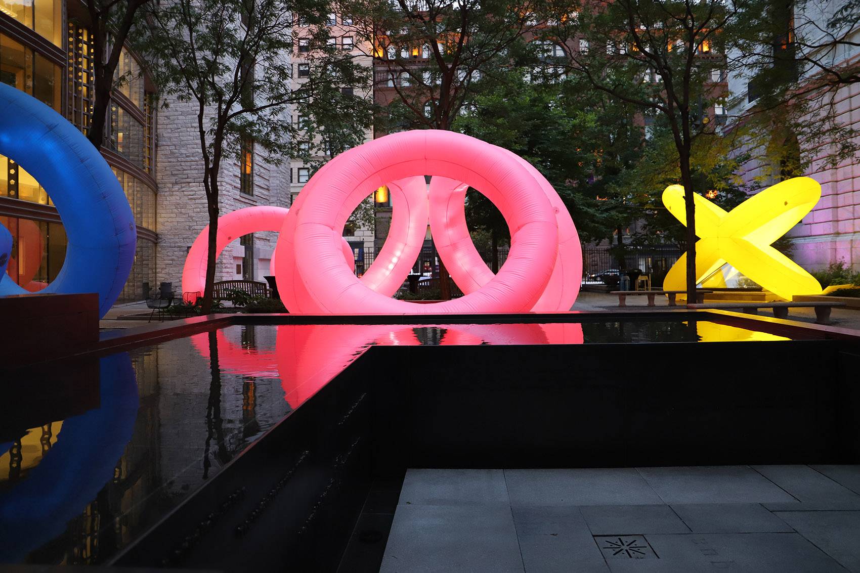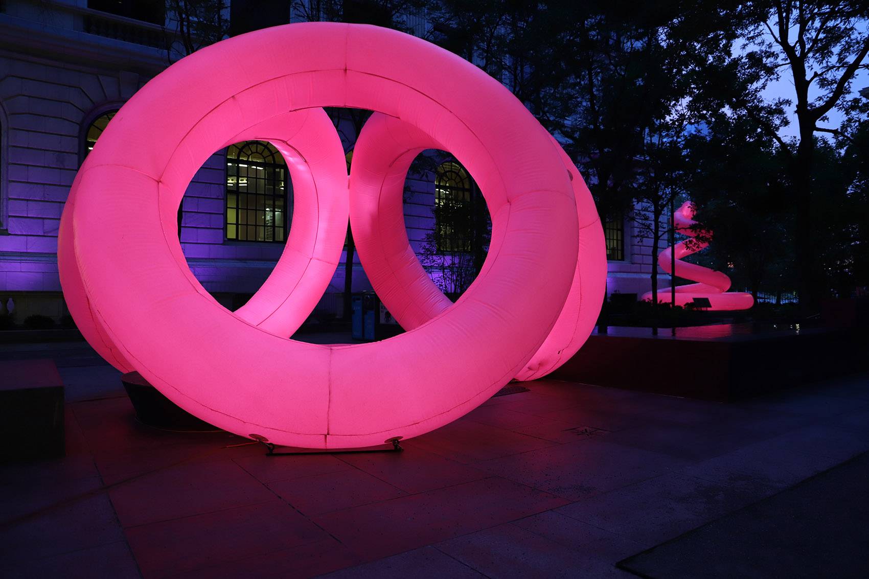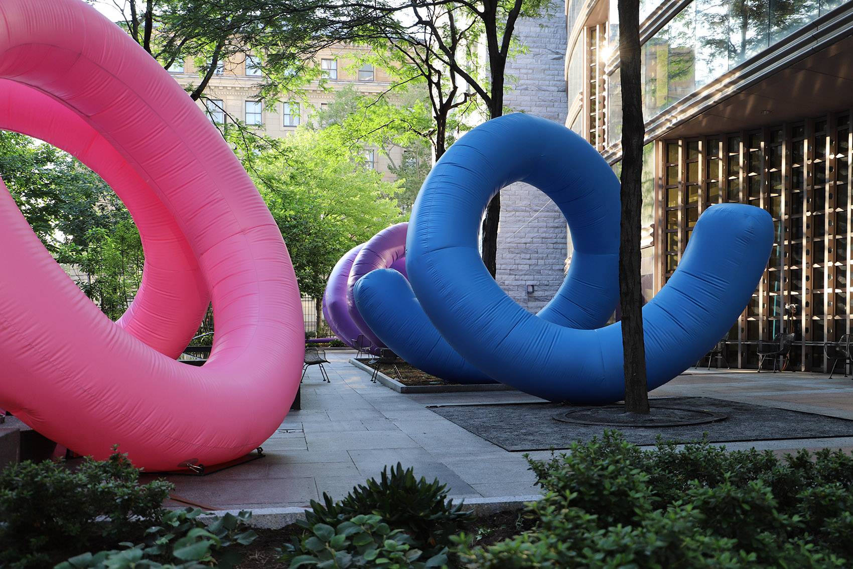圓形的特征在于起點(diǎn)與終點(diǎn)的閉合,而任何一個(gè)點(diǎn)都可以充當(dāng)起點(diǎn)和終點(diǎn)。圓上的軌跡是不確定且無(wú)止境的。Inner Circles正是由環(huán)形和類似于環(huán)形的體量構(gòu)成的裝置,它們引導(dǎo)參觀者在花園的路徑上進(jìn)行探索,從每個(gè)視角都能夠看到一幅嶄新的畫面。這些充氣的雕塑旨在為游客帶來(lái)沉浸式的體驗(yàn),以柔軟的表面吸引著人們?nèi)ビ|摸,同時(shí)與空間產(chǎn)生互動(dòng)。