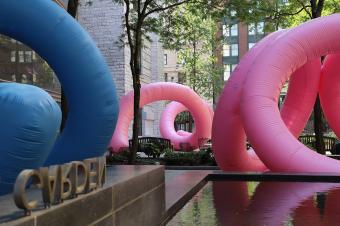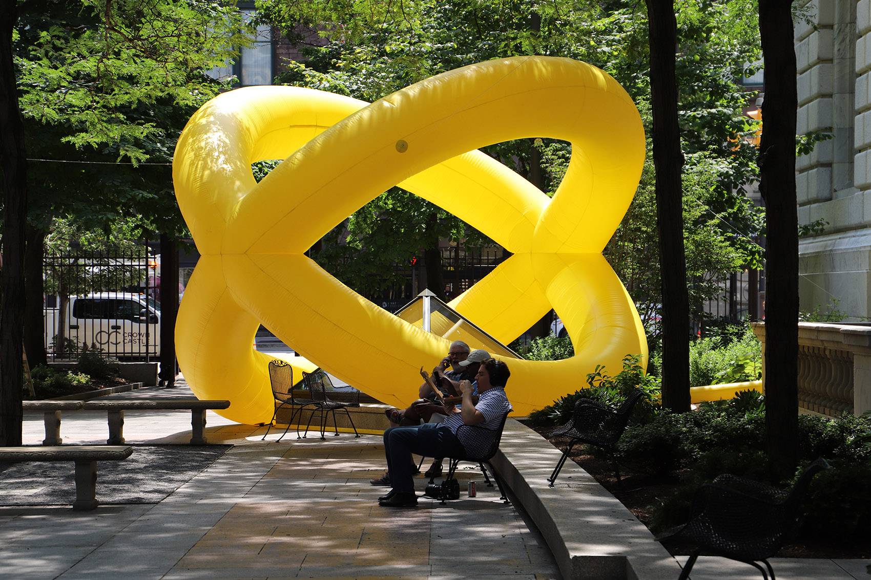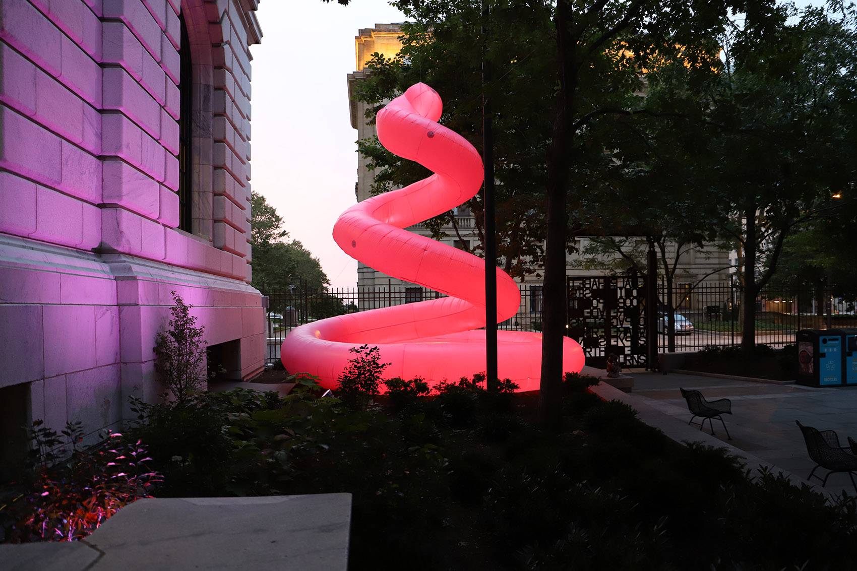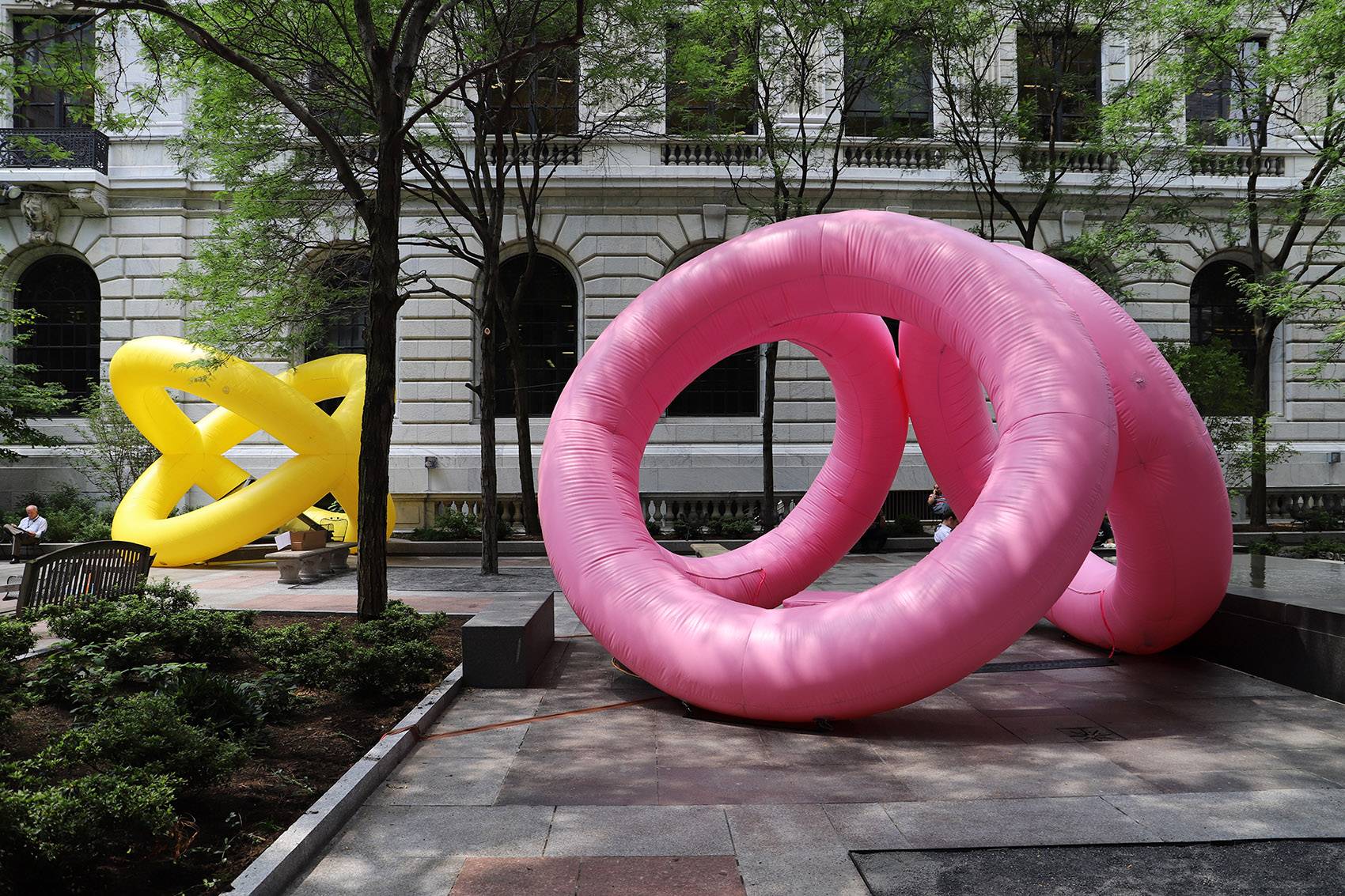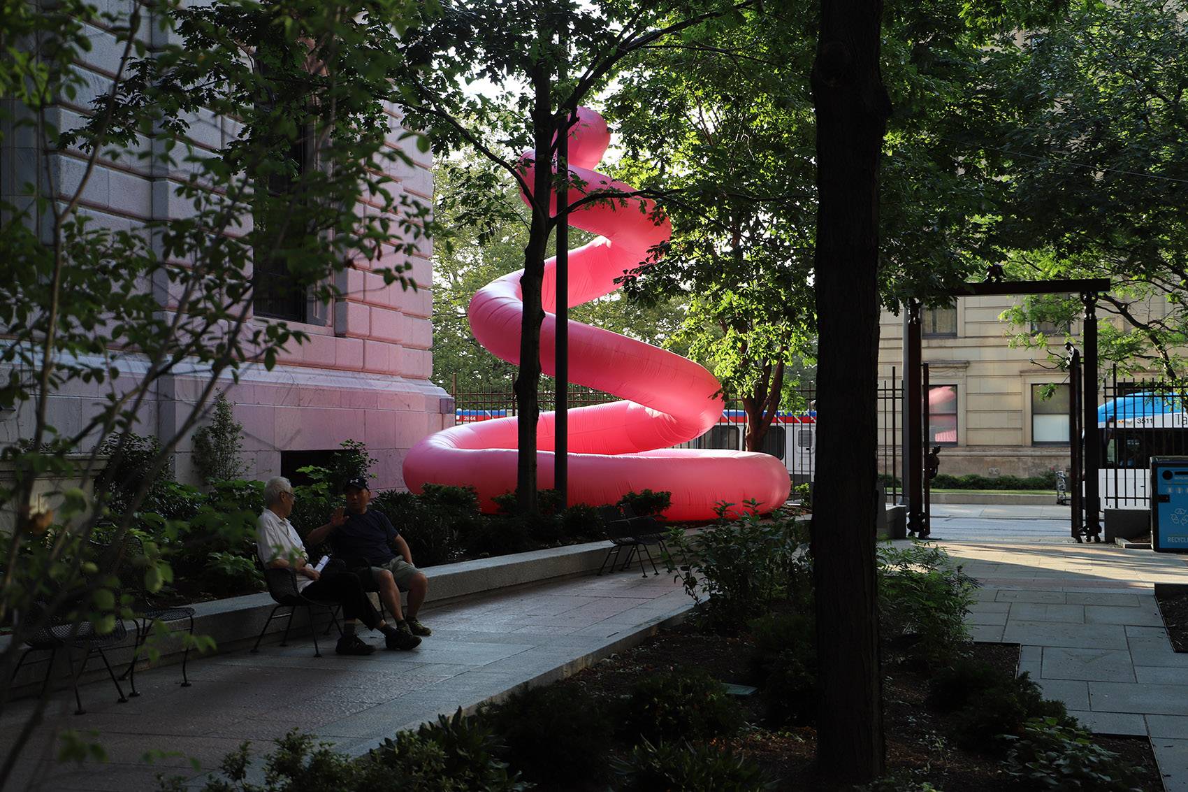 圓形的特征在于起點(diǎn)與終點(diǎn)的閉合,而任何一個(gè)點(diǎn)都可以充當(dāng)起點(diǎn)和終點(diǎn)。圓上的軌跡是不確定且無(wú)止境的。Inner Circles正是由環(huán)形和類似于環(huán)形的體量構(gòu)成的裝置,它們引導(dǎo)參觀者在花園的路徑上進(jìn)行探索,從每個(gè)視角都能夠看到一幅嶄新的畫面。這些充氣的雕塑旨在為游客帶來(lái)沉浸式的體驗(yàn),以柔軟的表面吸引著人們?nèi)ビ|摸,同時(shí)與空間產(chǎn)生互動(dòng)。