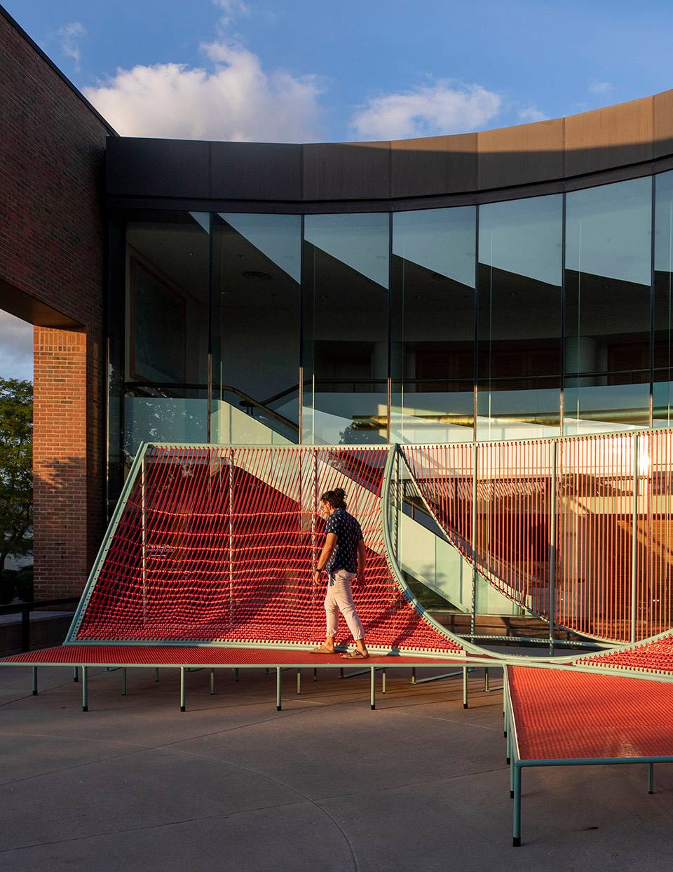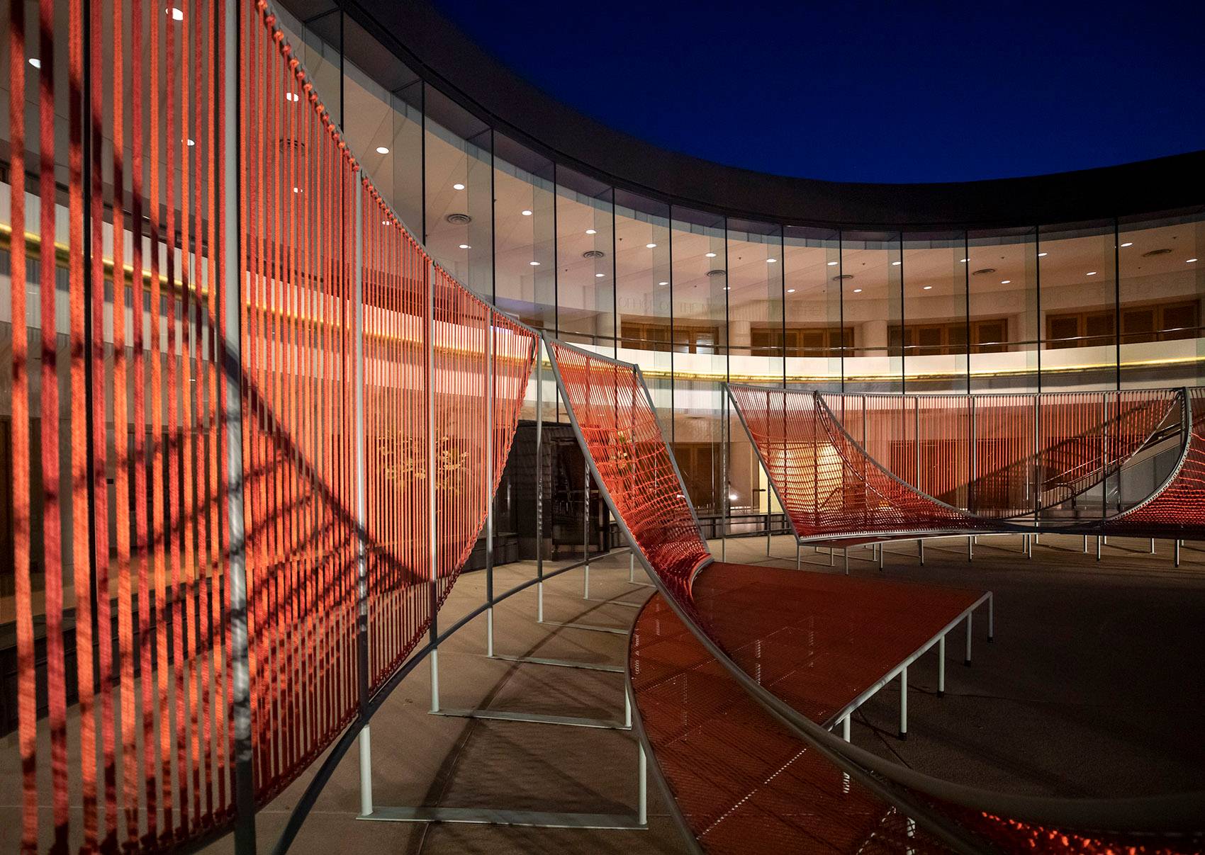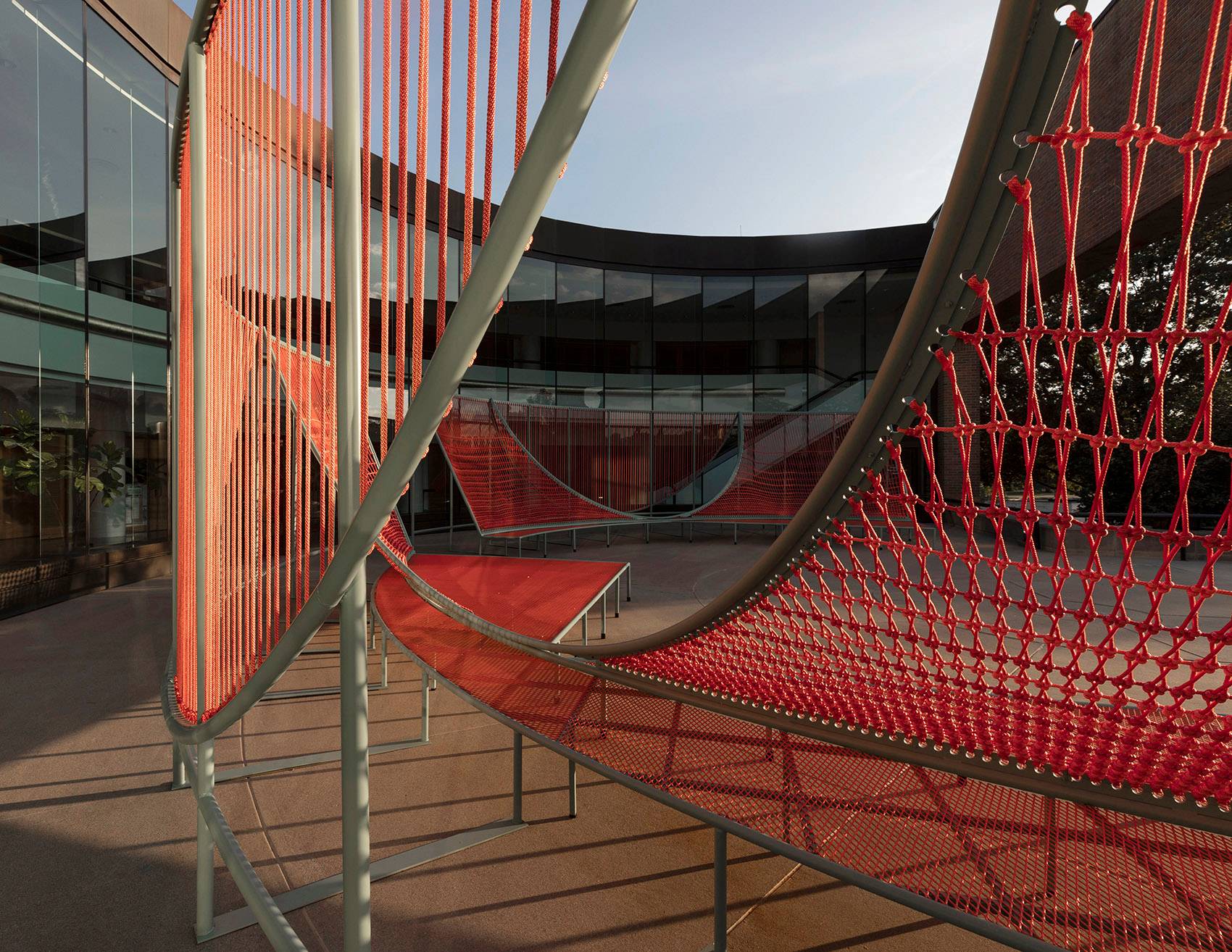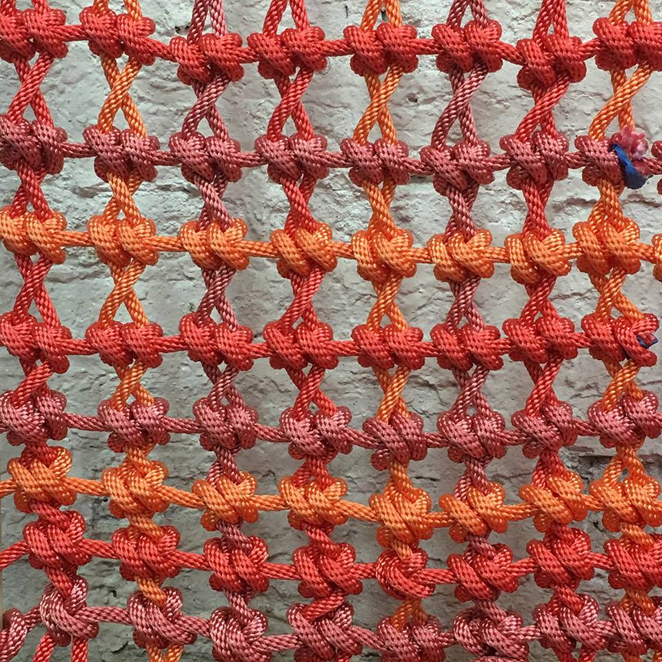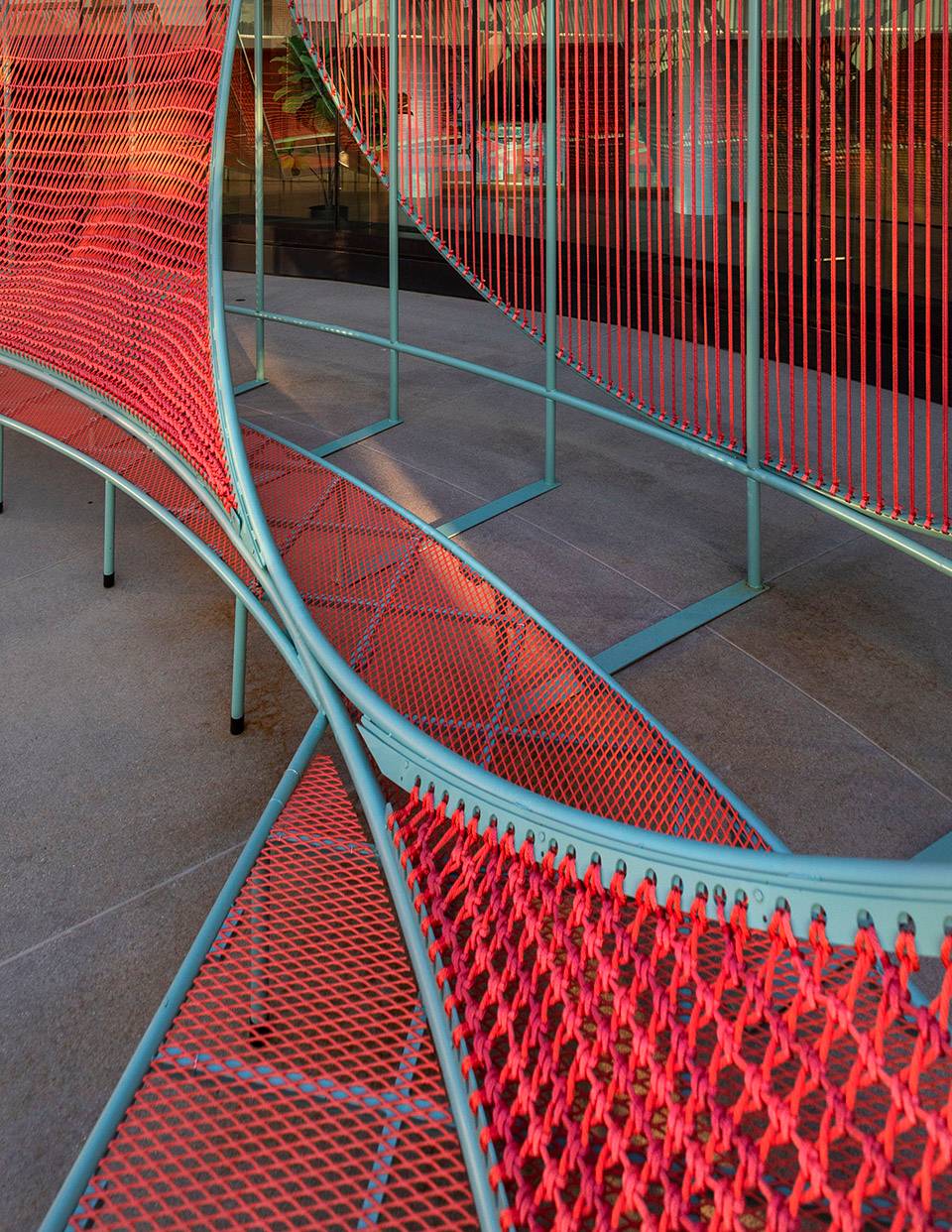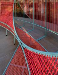 Soft Civic的柔軟性意味著空間功能結合了休閑及政治的用途,以及材料本身的物質性。由編織網(wǎng)面和鋼制框架制作而成的裝置在很大程度上探索了織物的柔軟性。編織網(wǎng)面通過尼龍繩編織的繩結,將家居空間的紋理帶入到公共領域,意圖鼓勵在管制場地進行游戲和互動。橙紅相間的繩子來回纏縛在市政廳古老的磚墻之間,將建筑物的色彩與紡織景觀聯(lián)系起來。編織的繩結是與布魯克林一家紡織工坊Powerhouse Arts合作完成的,它代表了一種共同努力的愿望,以及項目圍繞著集體參與的初衷。
