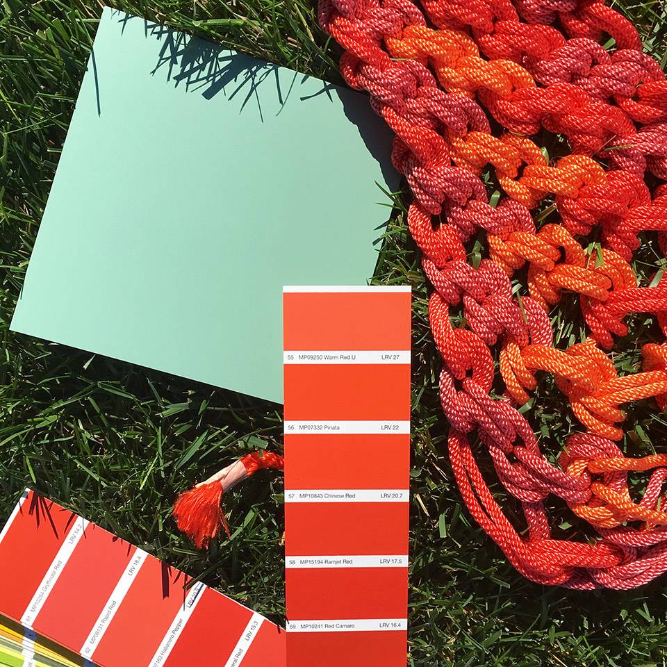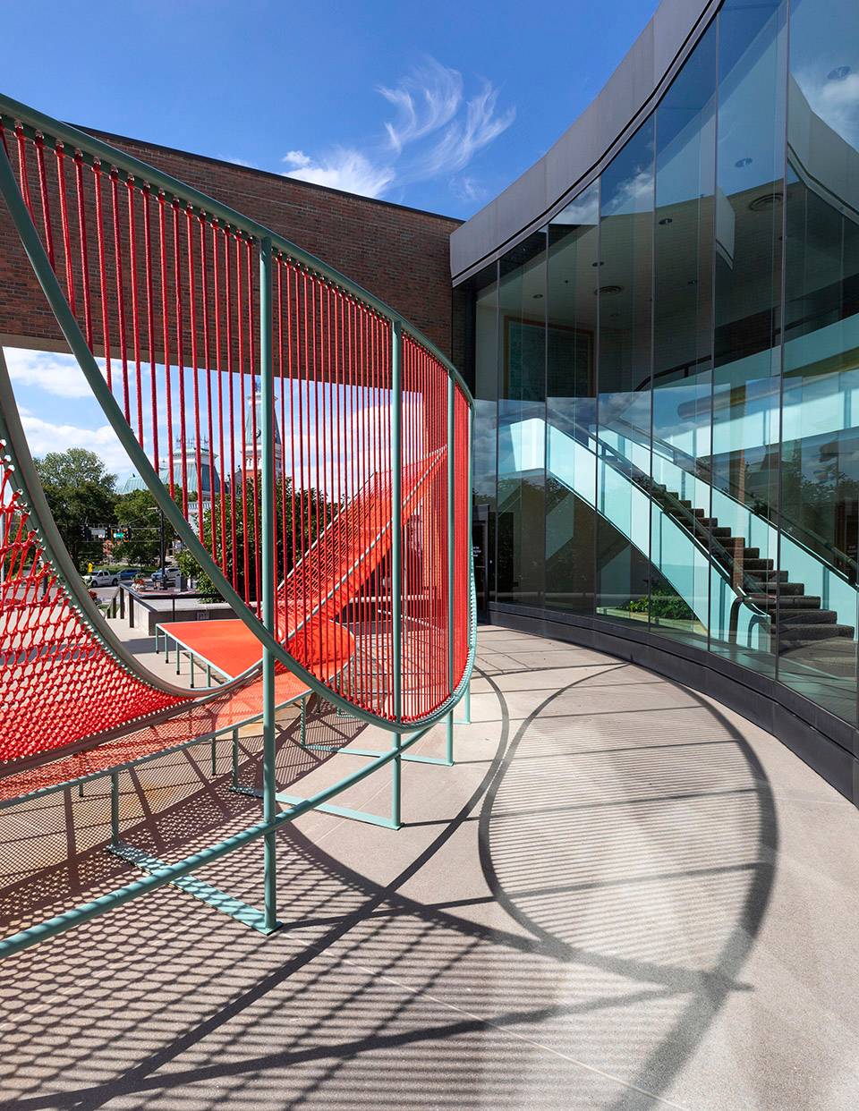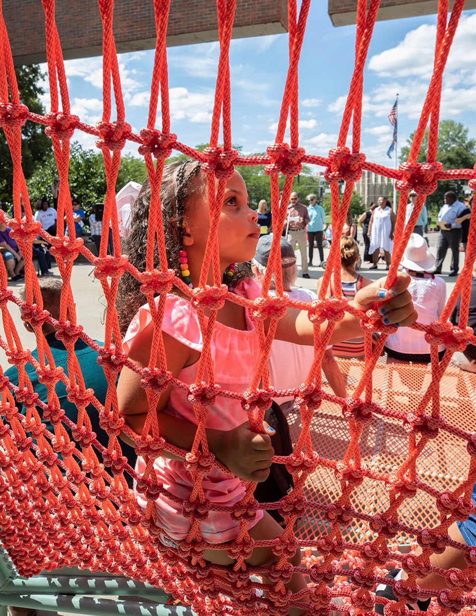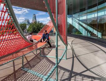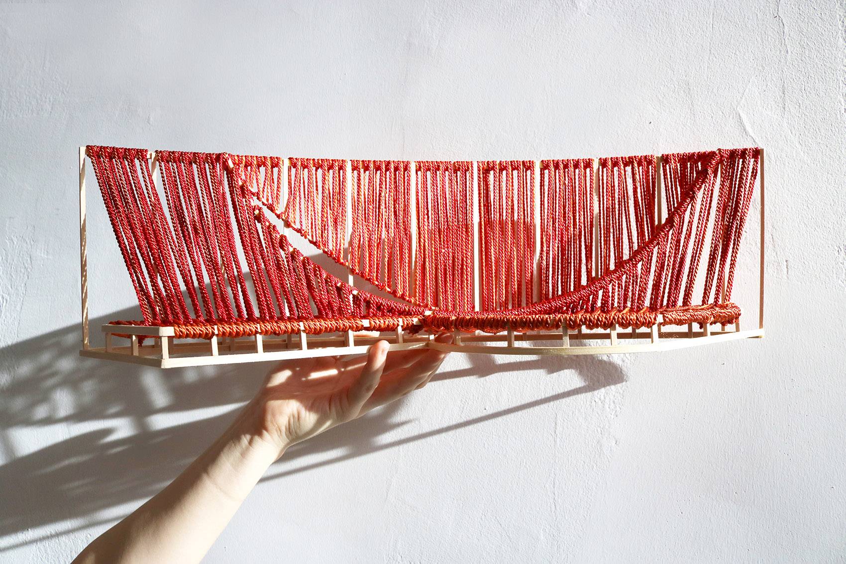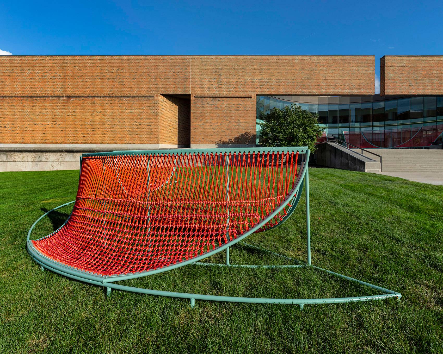 Soft Civic的柔軟性意味著空間功能結合了休閑及政治的用途,以及材料本身的物質性。由編織網(wǎng)面和鋼制框架制作而成的裝置在很大程度上探索了織物的柔軟性。編織網(wǎng)面通過尼龍繩編織的繩結,將家居空間的紋理帶入到公共領域,意圖鼓勵在管制場地進行游戲和互動。橙紅相間的繩子來回纏縛在市政廳古老的磚墻之間,將建筑物的色彩與紡織景觀聯(lián)系起來。編織的繩結是與布魯克林一家紡織工坊Powerhouse Arts合作完成的,它代表了一種共同努力的愿望,以及項目圍繞著集體參與的初衷。