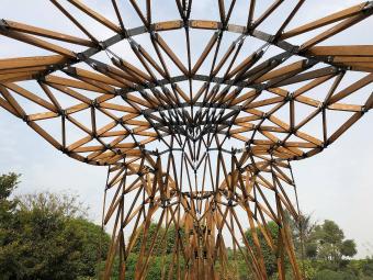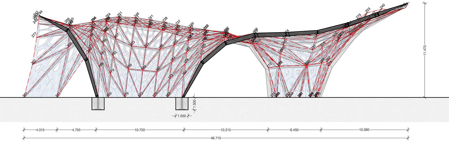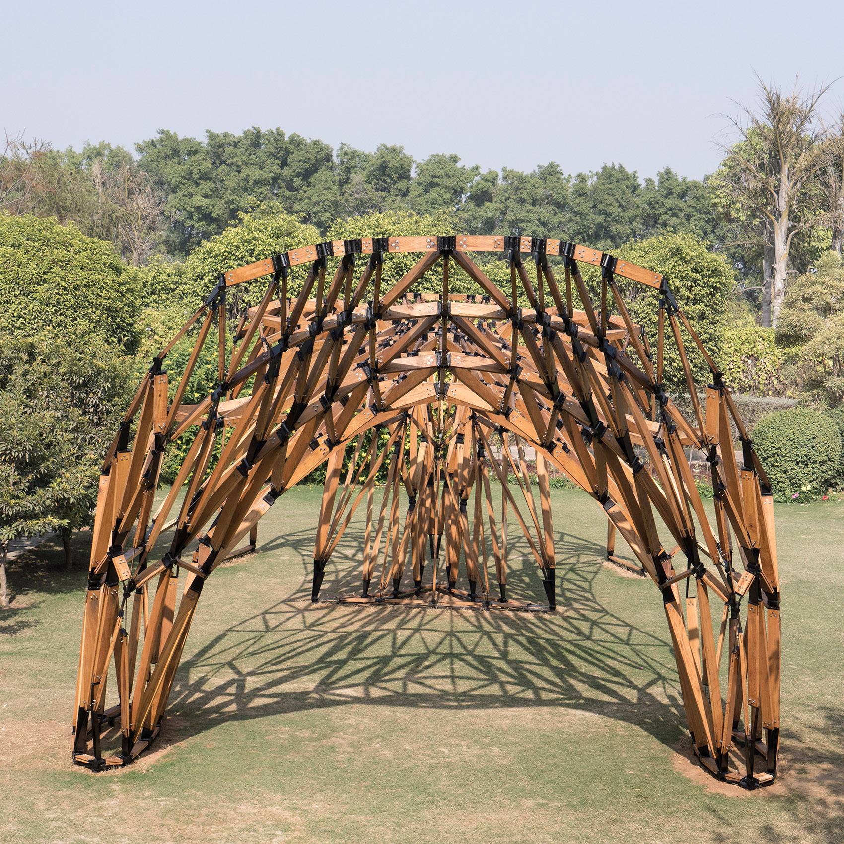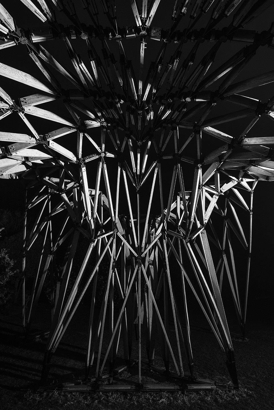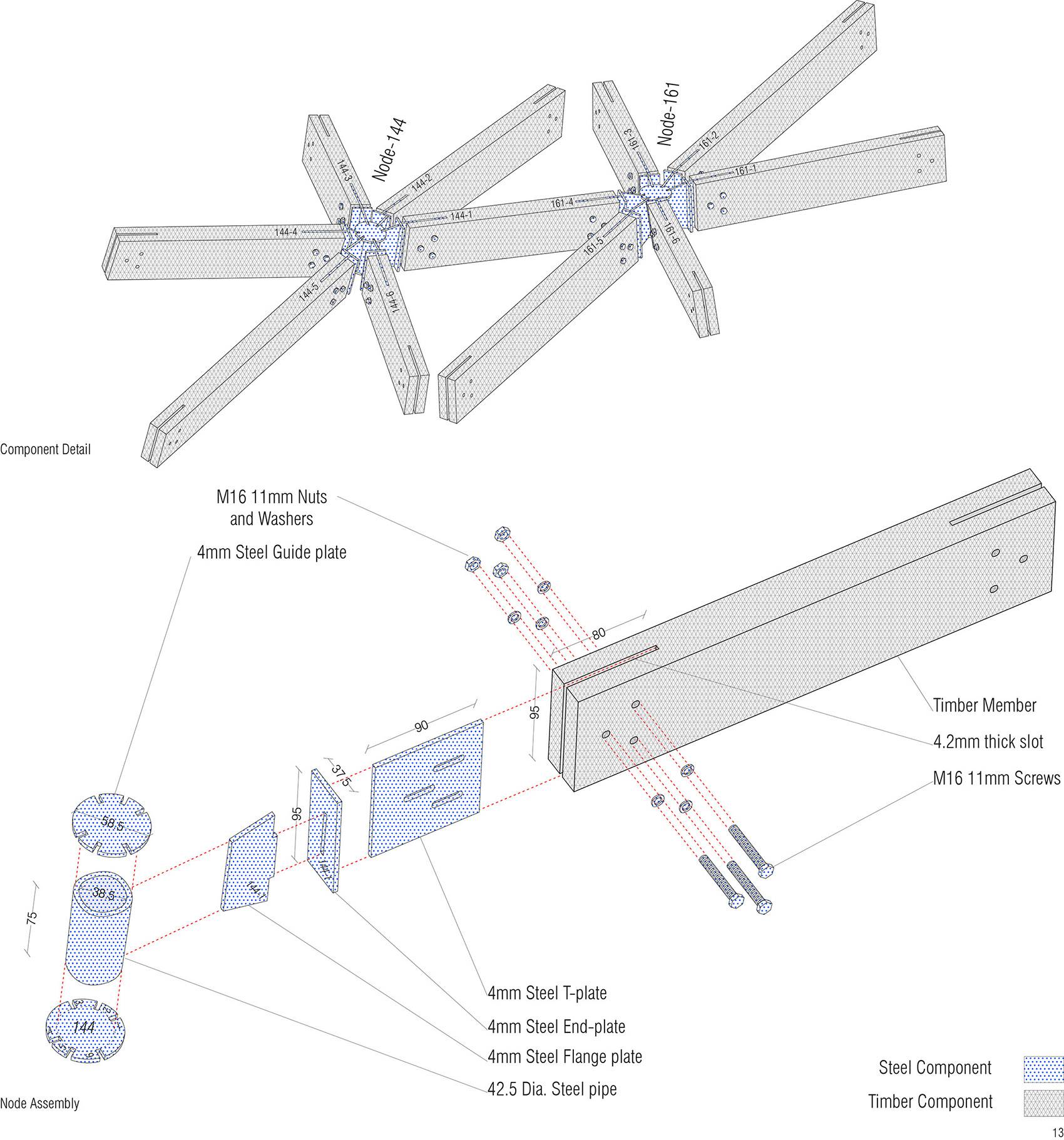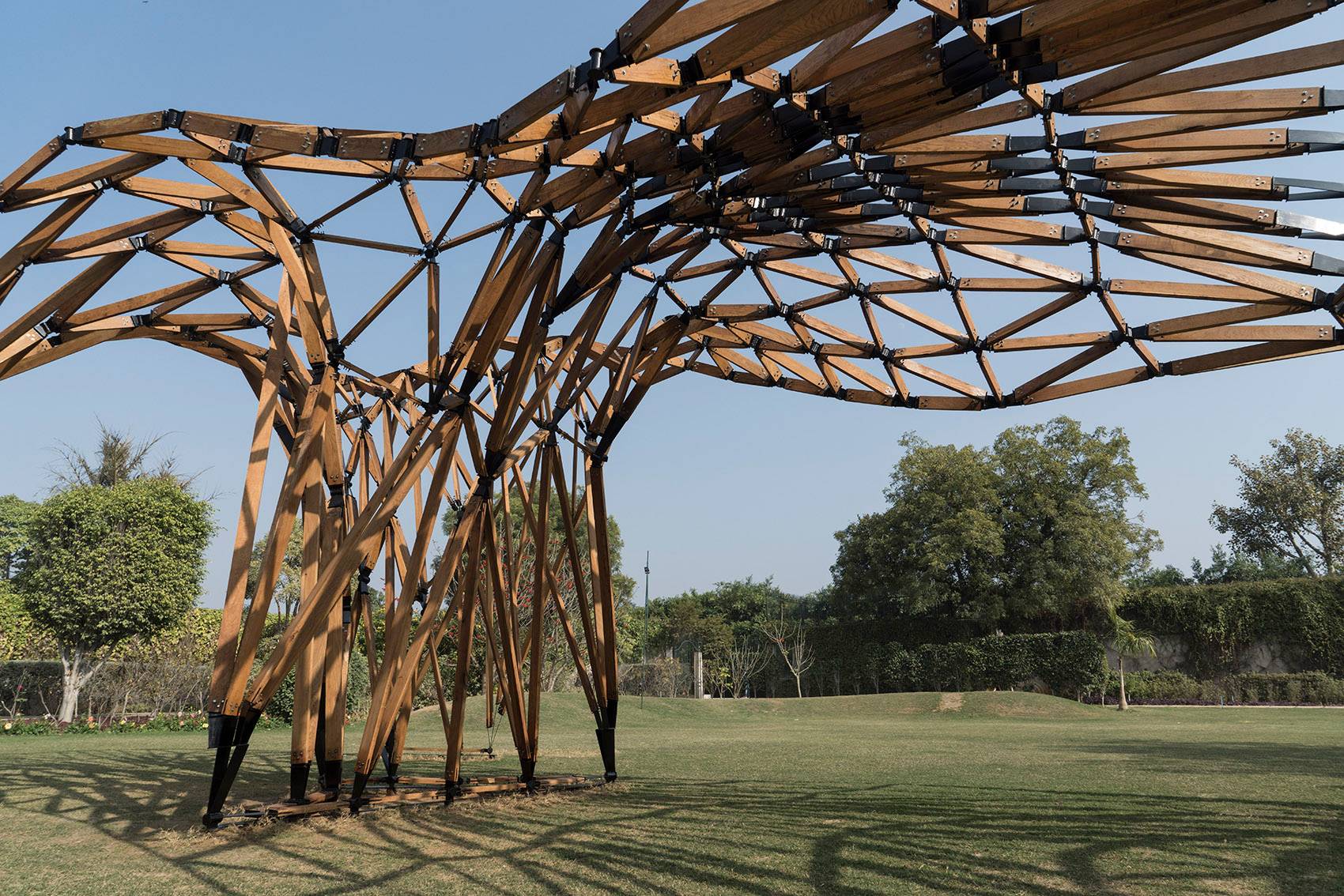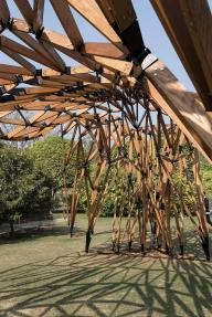 考慮到宗教信仰中的火神,建筑師選擇木材作為本項目的材料。木制的格柵狀殼體由841根橫梁構(gòu)成,并在某些特定的節(jié)點處用鋼構(gòu)件連接。各橫梁的布置角度和傾斜度都各不相同。涼亭復(fù)雜的幾何設(shè)計在電腦中完成,所有的信息都被輸入進(jìn)一個定制的計算機(jī)腳本中,隨后該腳本便可根據(jù)特定的程序生成本項目所有的305個節(jié)點設(shè)計以及鋼構(gòu)件的切割模板。這些構(gòu)件經(jīng)過數(shù)控機(jī)床(CNC)切割,然后通過焊接技術(shù)被精確地連接在一起,之后再使用低技術(shù)的方法進(jìn)行組裝。