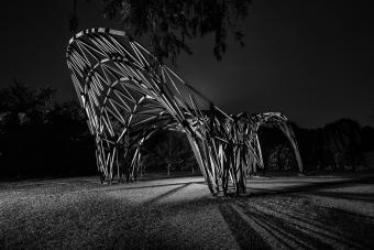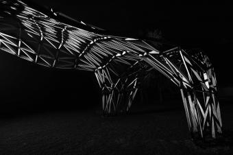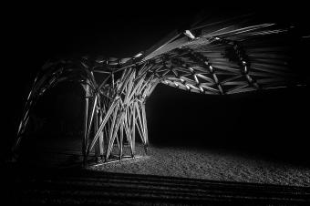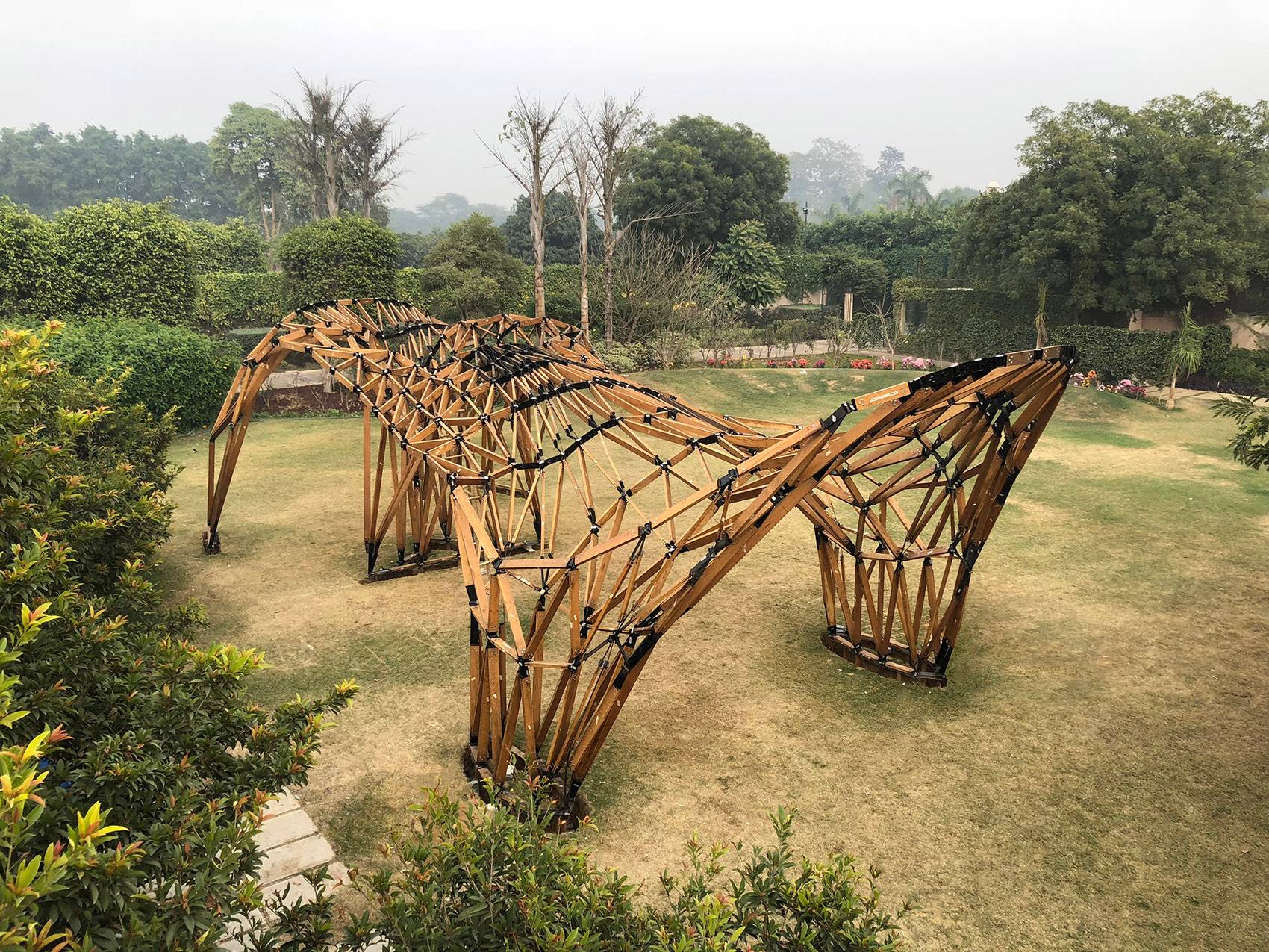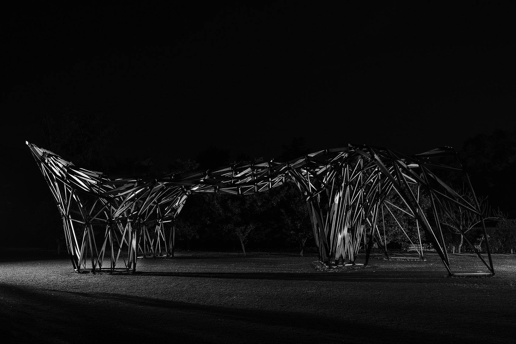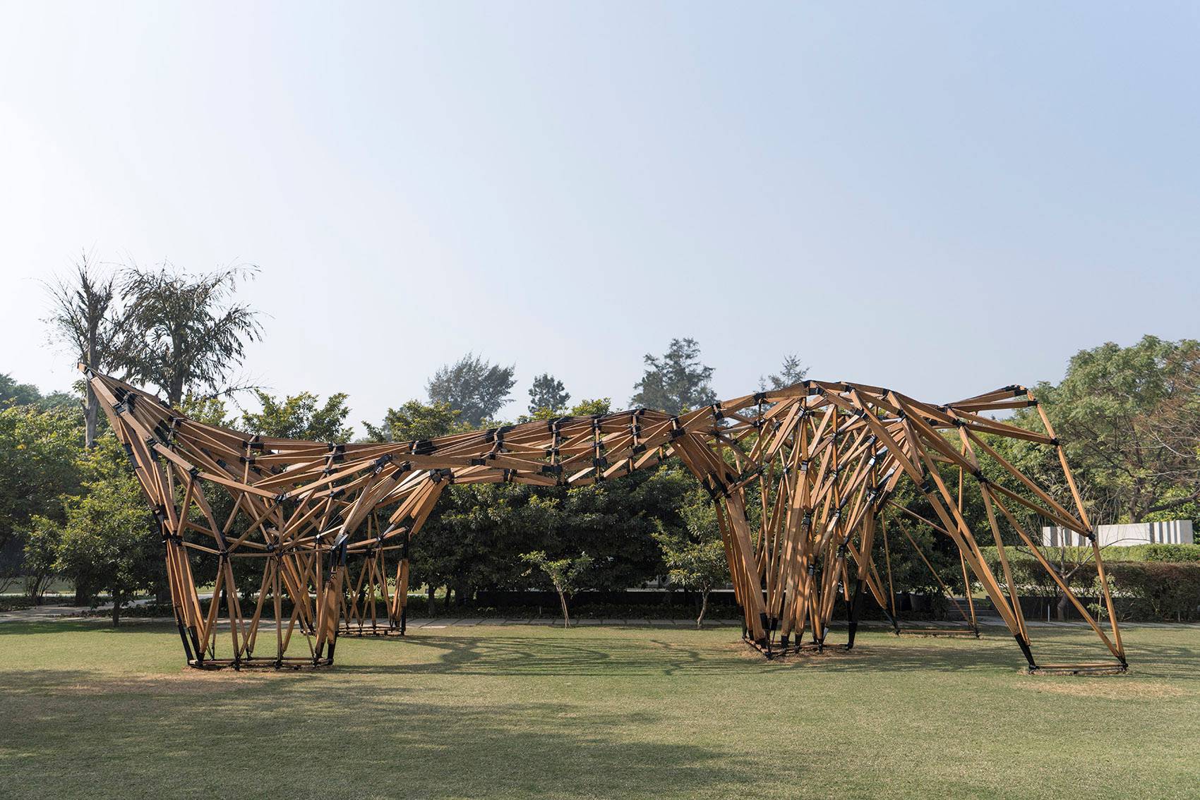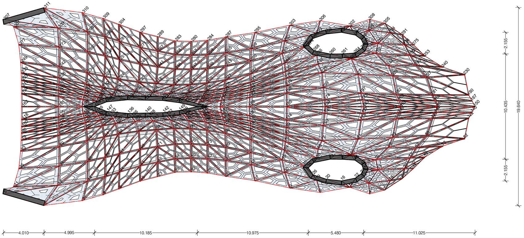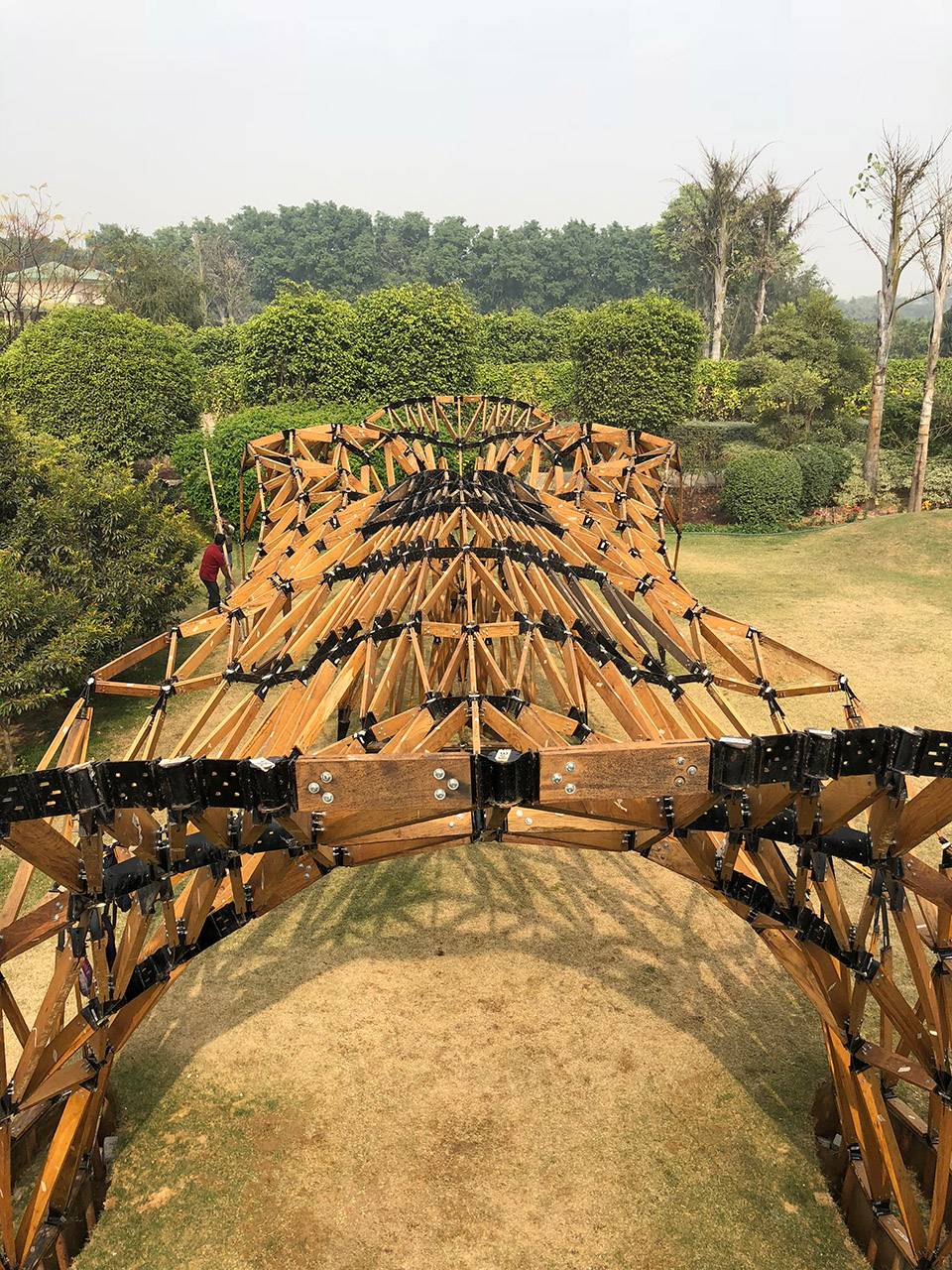 考慮到宗教信仰中的火神,建筑師選擇木材作為本項目的材料。木制的格柵狀殼體由841根橫梁構(gòu)成,并在某些特定的節(jié)點處用鋼構(gòu)件連接。各橫梁的布置角度和傾斜度都各不相同。涼亭復(fù)雜的幾何設(shè)計在電腦中完成,所有的信息都被輸入進(jìn)一個定制的計算機(jī)腳本中,隨后該腳本便可根據(jù)特定的程序生成本項目所有的305個節(jié)點設(shè)計以及鋼構(gòu)件的切割模板。這些構(gòu)件經(jīng)過數(shù)控機(jī)床(CNC)切割,然后通過焊接技術(shù)被精確地連接在一起,之后再使用低技術(shù)的方法進(jìn)行組裝。