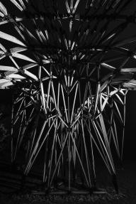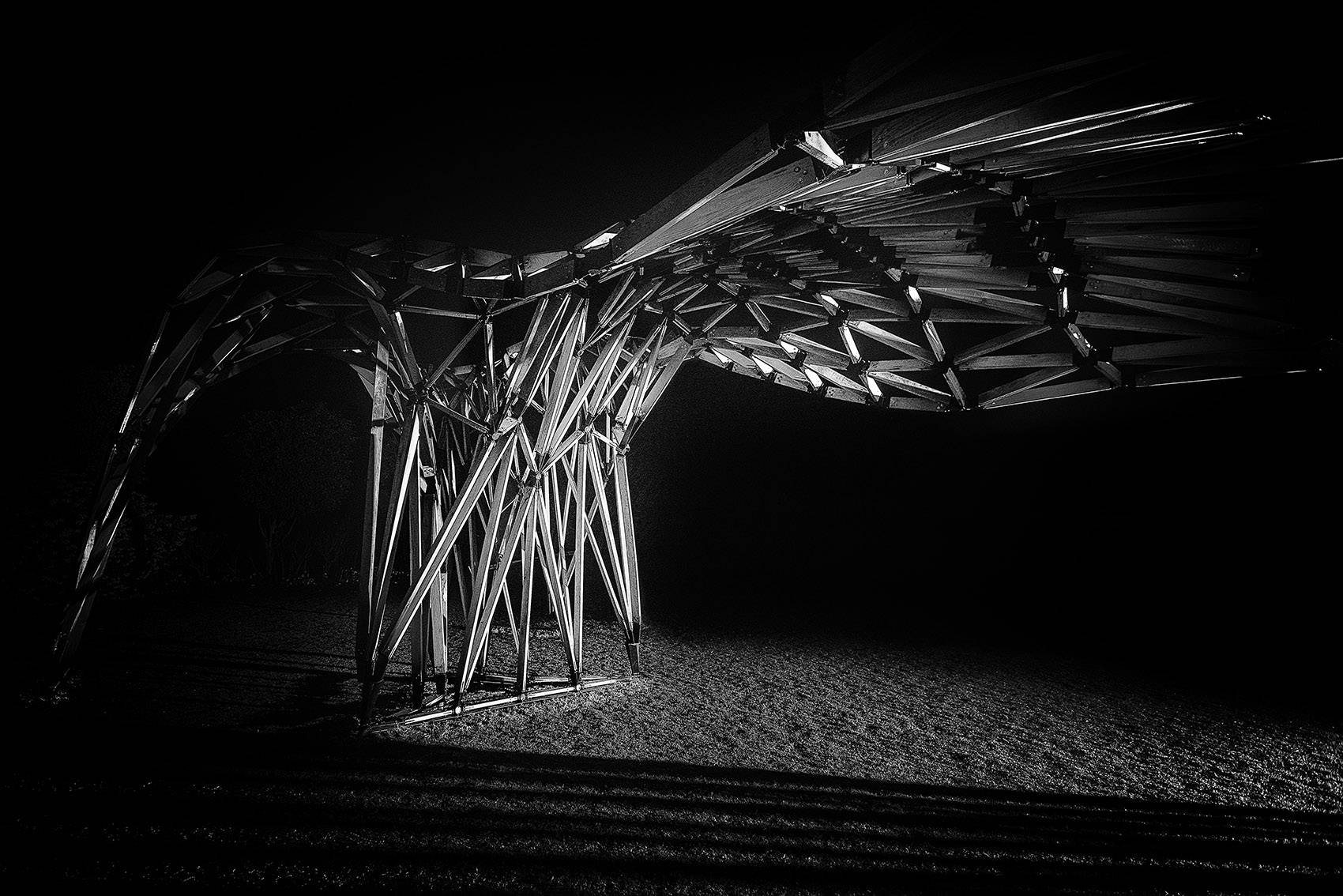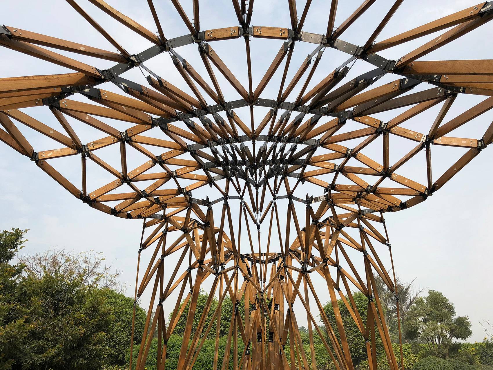 ▼涼亭局部,841根橫梁構(gòu)成木制的格柵狀殼體結(jié)構(gòu),各橫梁的布置角度和傾斜度都各不相同