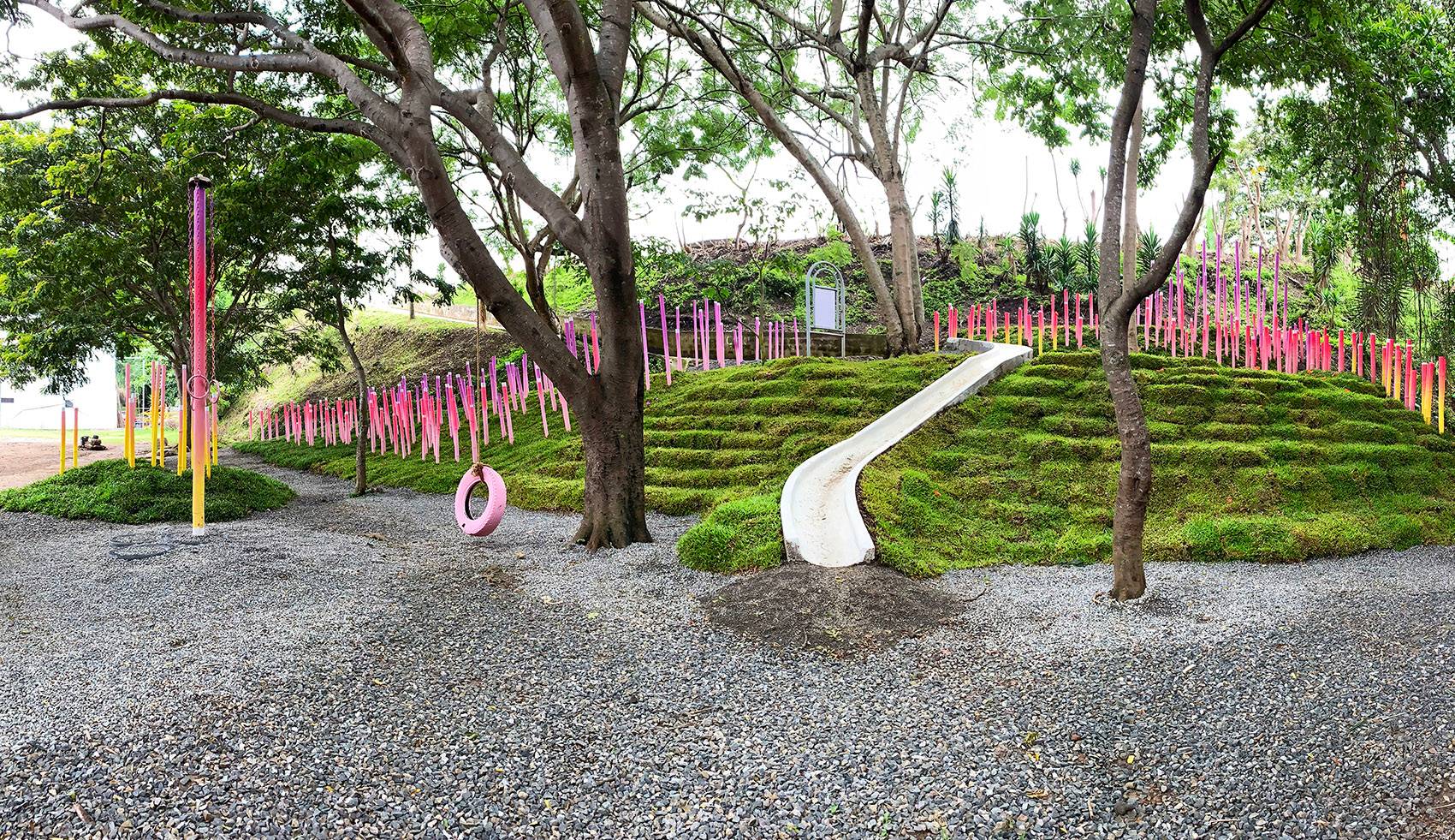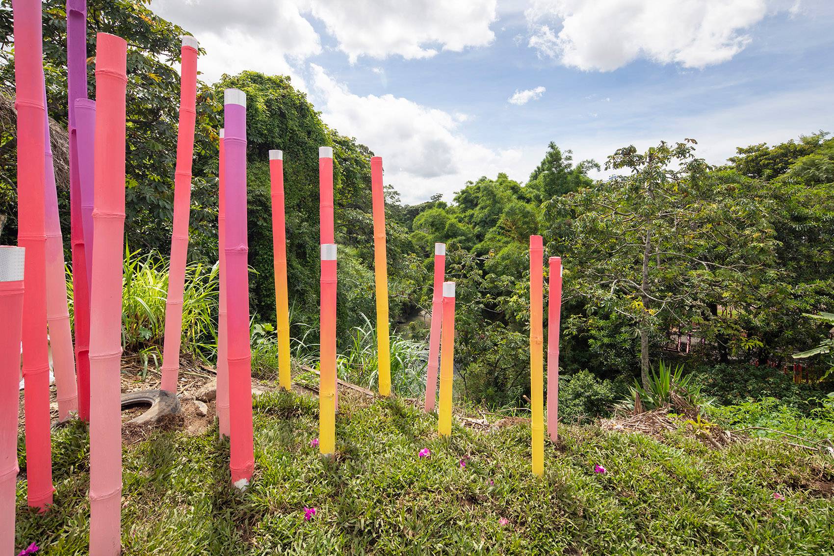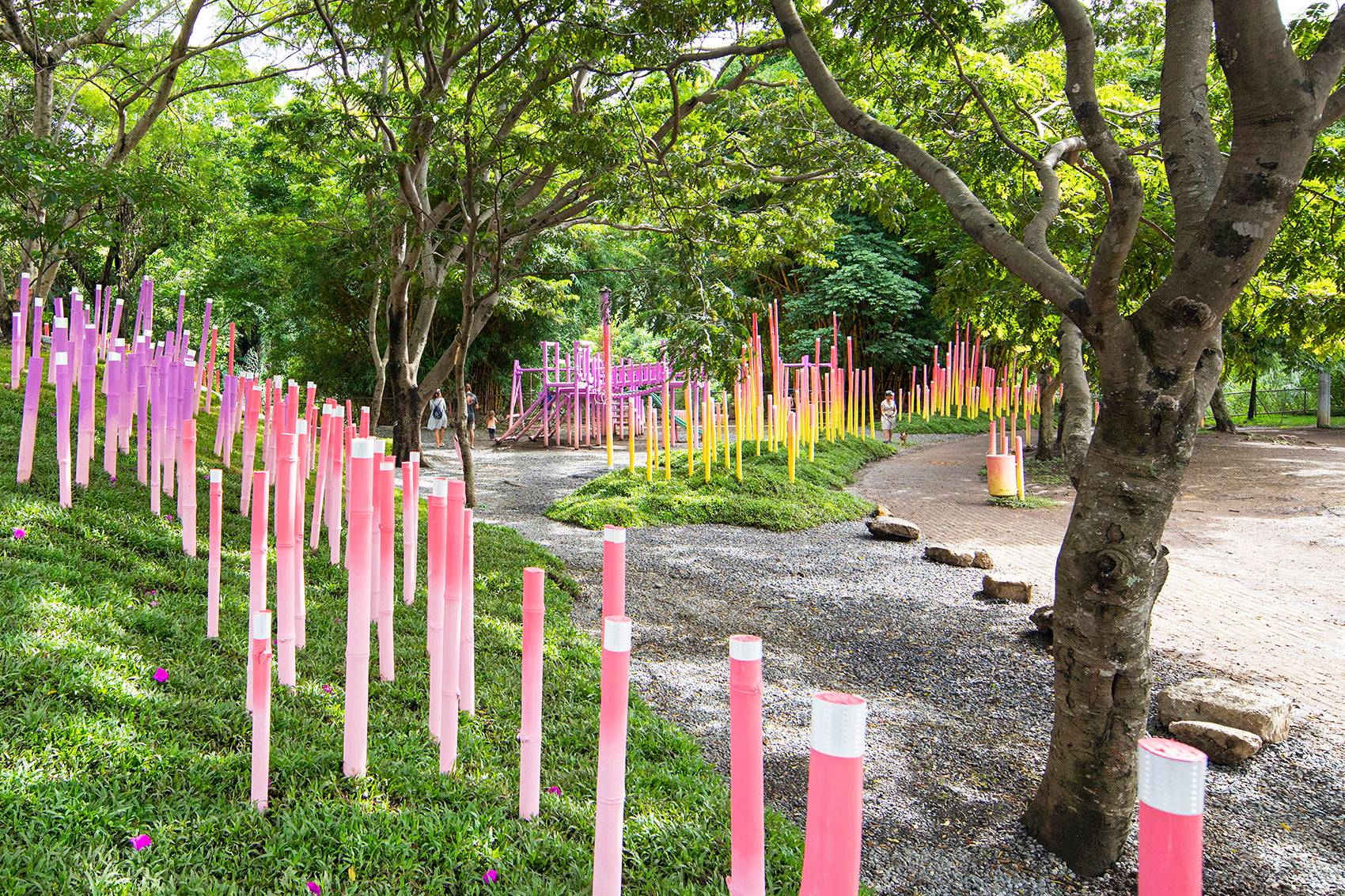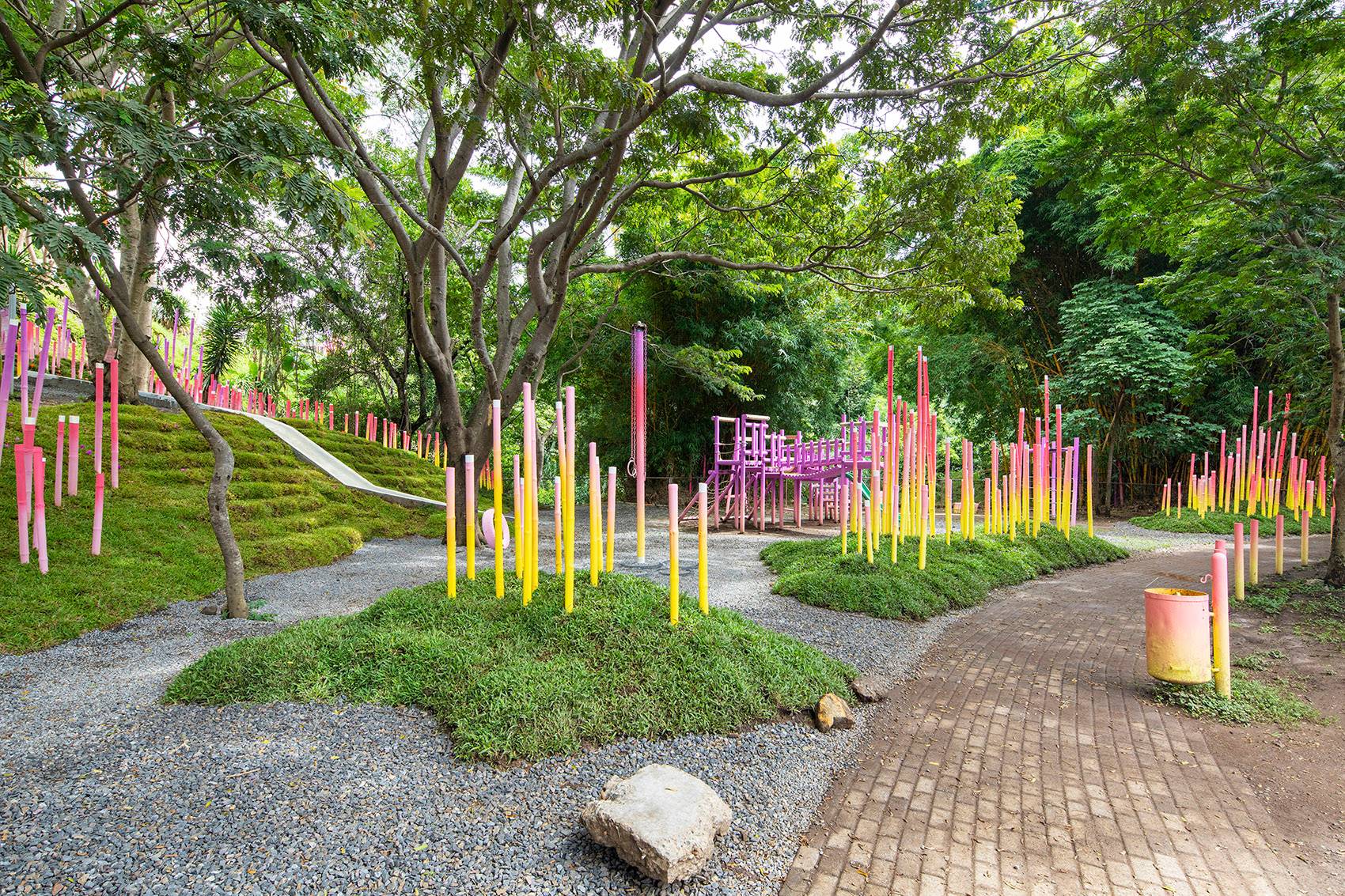 最終打造而成的是一片被繪制成黃、金橘、粉紅和紫色的漸變竹林。它們創(chuàng)造出一條蜿蜒的小路,將Polideportivo公園的主要節(jié)點與附近的鐵路連接起來。場地被形態(tài)各異的草坪進一步塑造,這些草坪還作為不同模塊竹林的基座。該裝置占地總面積約2,000平方米,包括600個填充有礫石和碎石的再生輪胎(用作防洪土墩和土壤固持)和總長約1,200米的竹子。