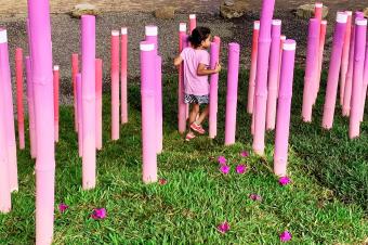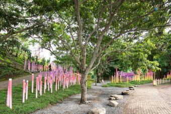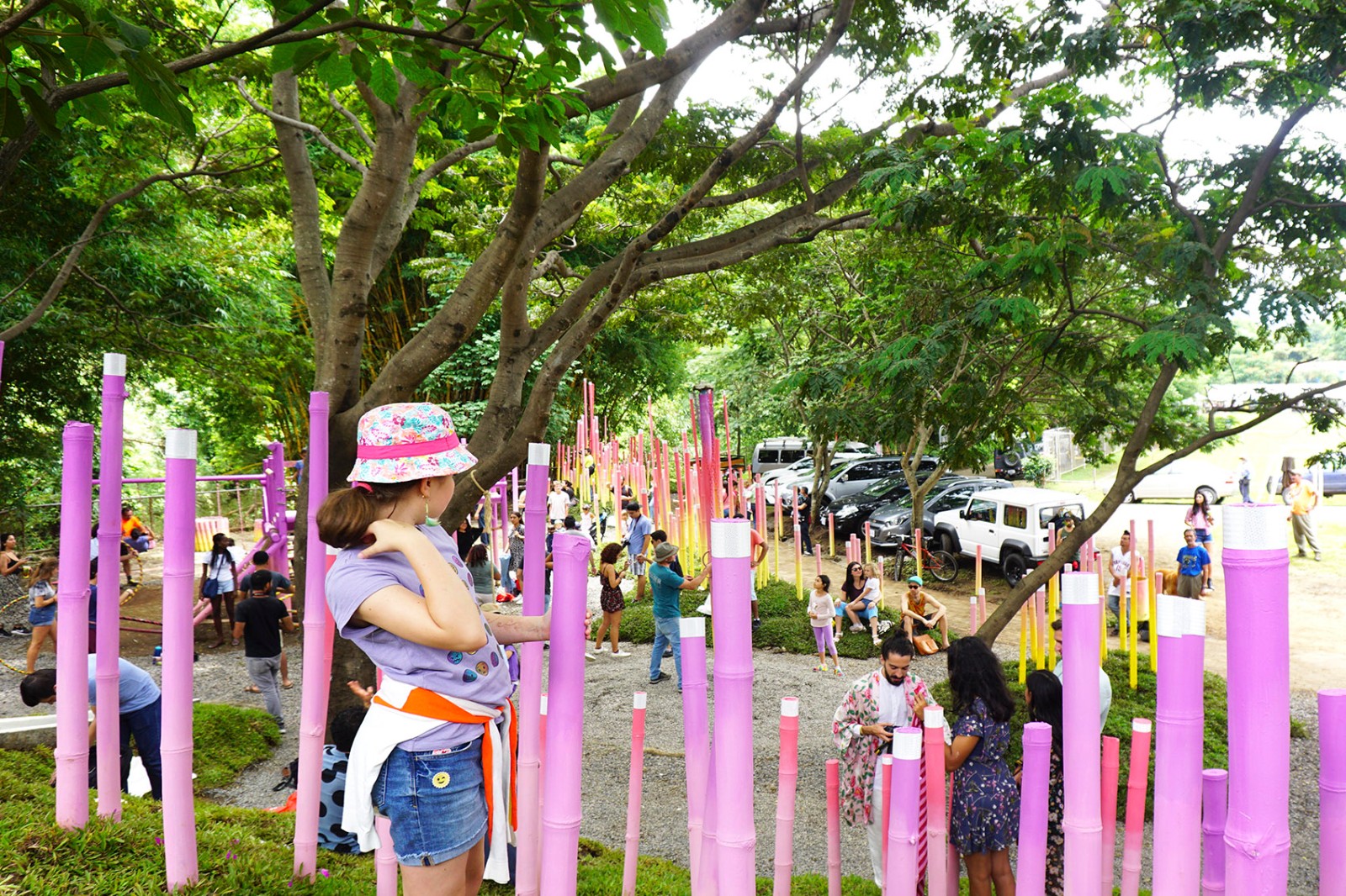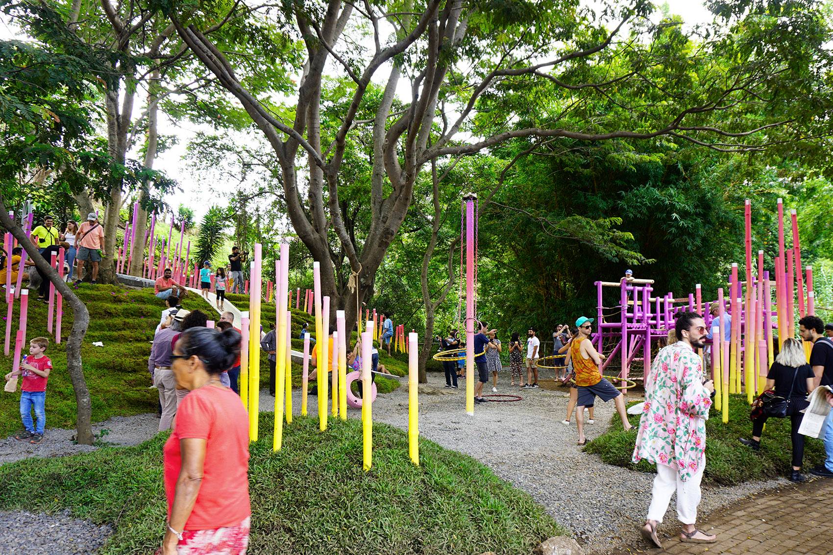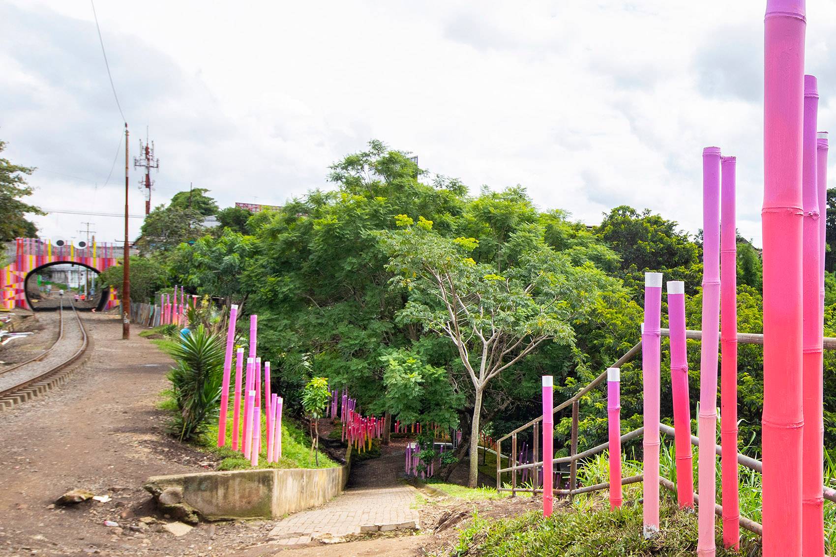 最終打造而成的是一片被繪制成黃、金橘、粉紅和紫色的漸變竹林。它們創(chuàng)造出一條蜿蜒的小路,將Polideportivo公園的主要節(jié)點與附近的鐵路連接起來。場地被形態(tài)各異的草坪進一步塑造,這些草坪還作為不同模塊竹林的基座。該裝置占地總面積約2,000平方米,包括600個填充有礫石和碎石的再生輪胎(用作防洪土墩和土壤固持)和總長約1,200米的竹子。
