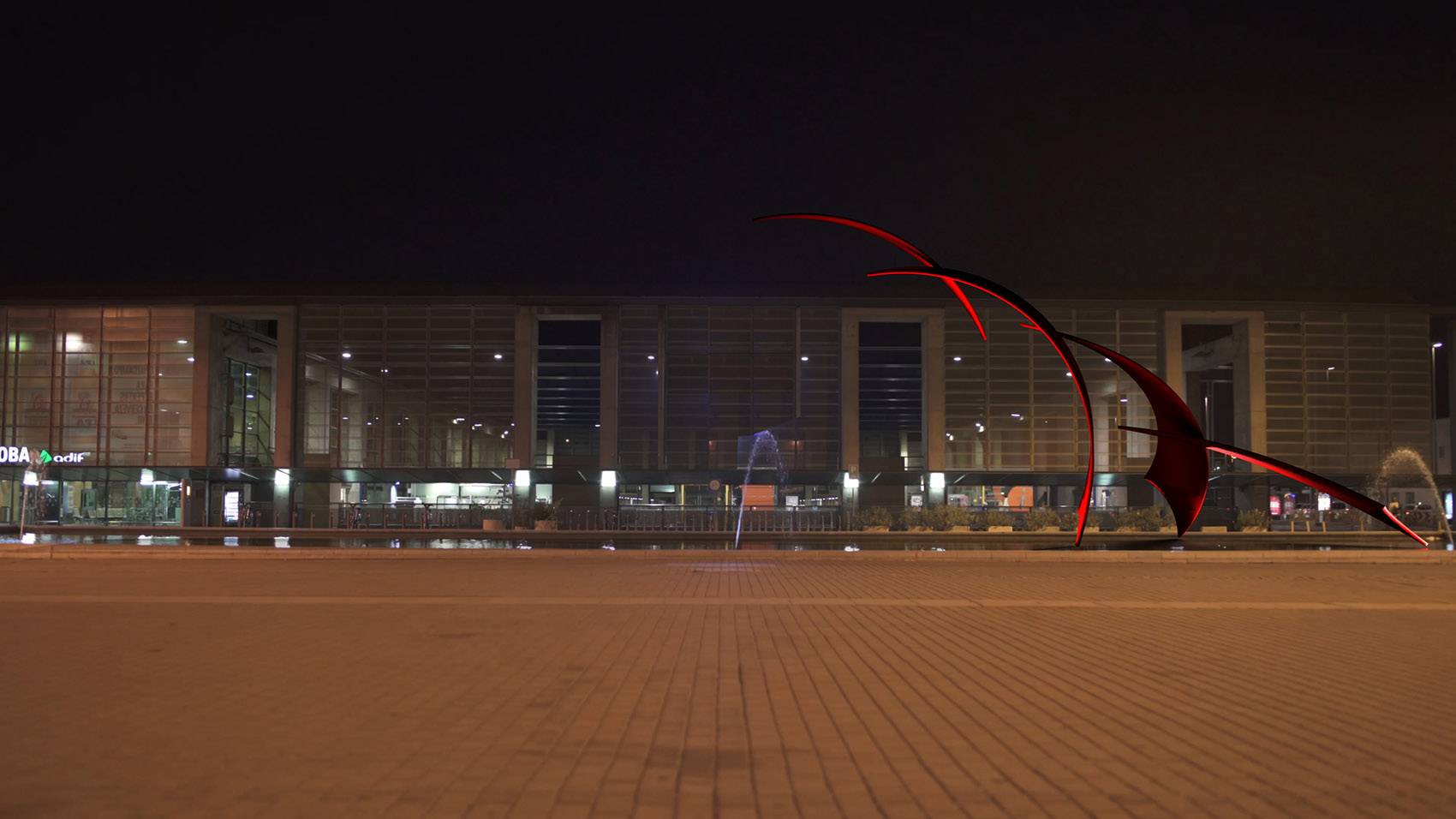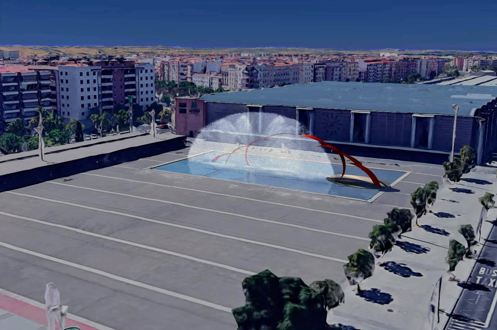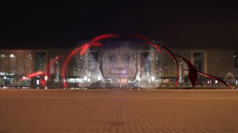 這是一個(gè)以鳥居為原型、融合了投影功能的大型雕塑。雕塑主體由鋼材料構(gòu)成,并在中間形成一個(gè)虛擬的投影水幕。