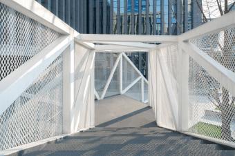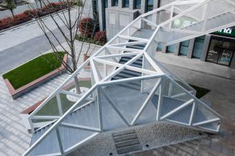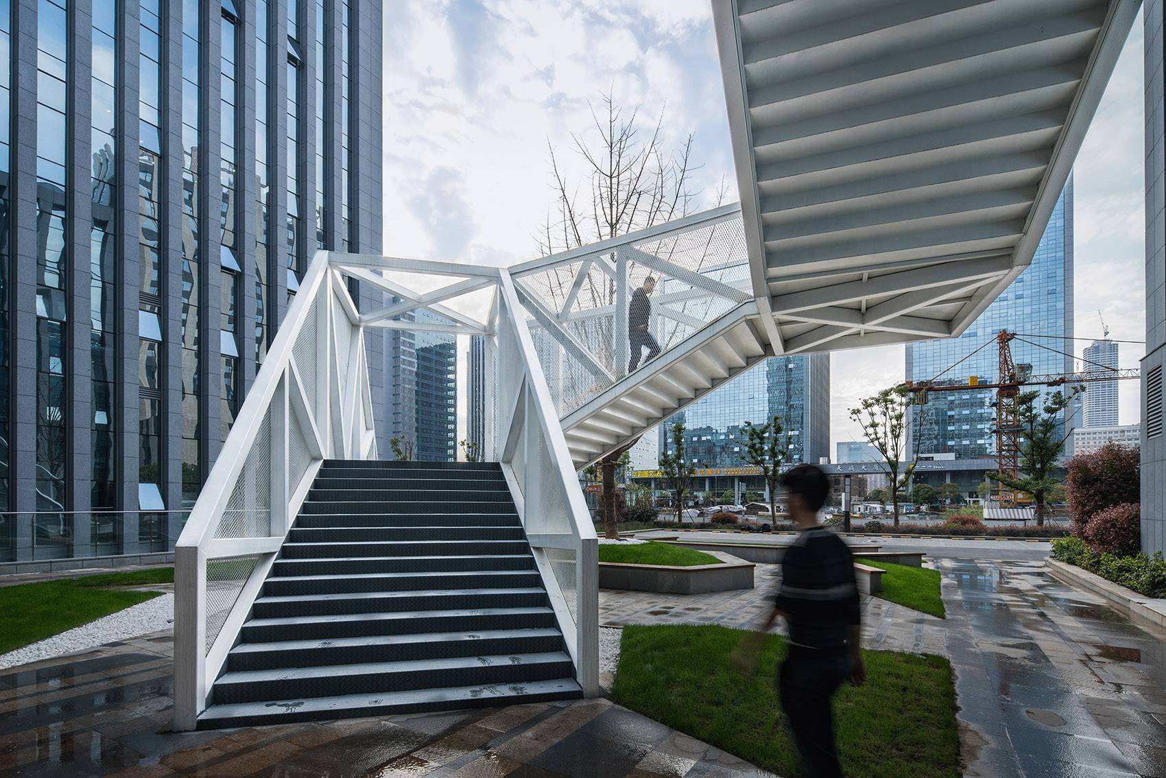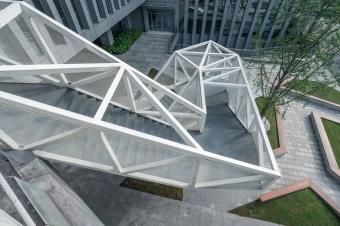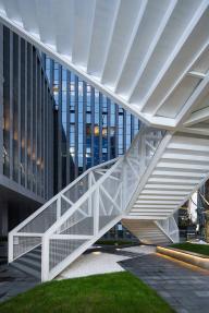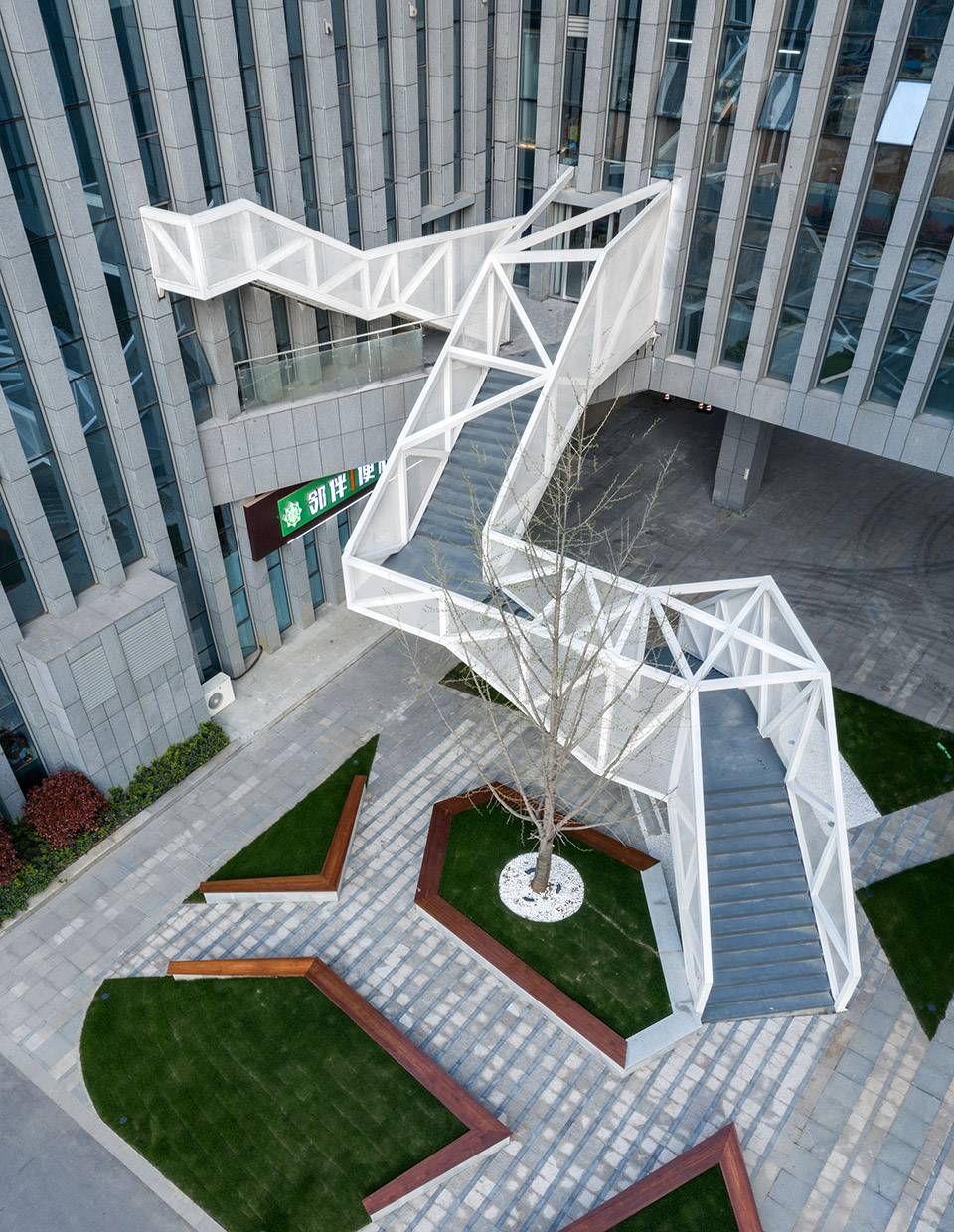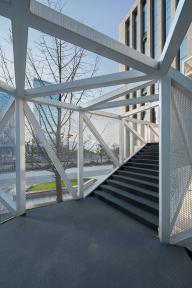 設(shè)計(jì)將云梯作為院落空間內(nèi)最重要的造景和觀景裝置。云梯的外部形體因折返的輪廓而具有隨性和松弛特質(zhì),恰恰與背景的總部建筑的勻質(zhì)挺括線條風(fēng)格迥異,使云梯成為最為活躍的造景元素。當(dāng)沿著云梯逐漸攀爬,景觀會(huì)連續(xù)變化,空間體驗(yàn)得以強(qiáng)化。