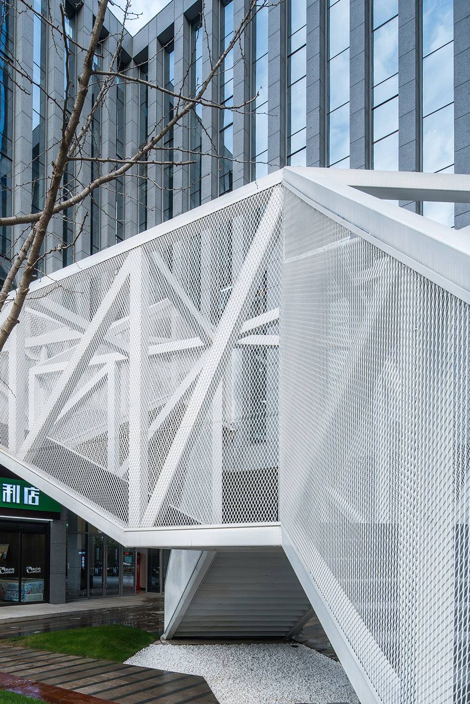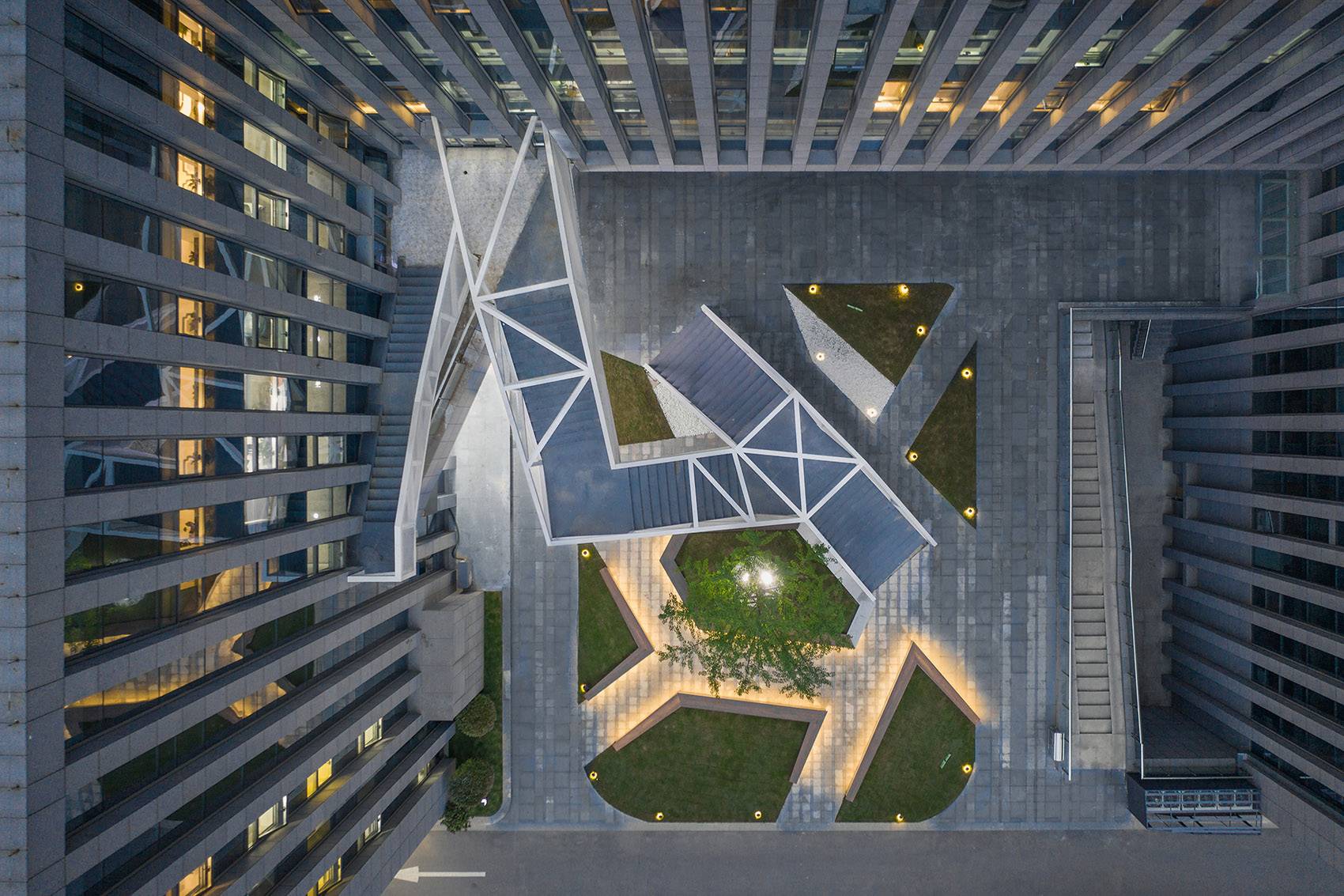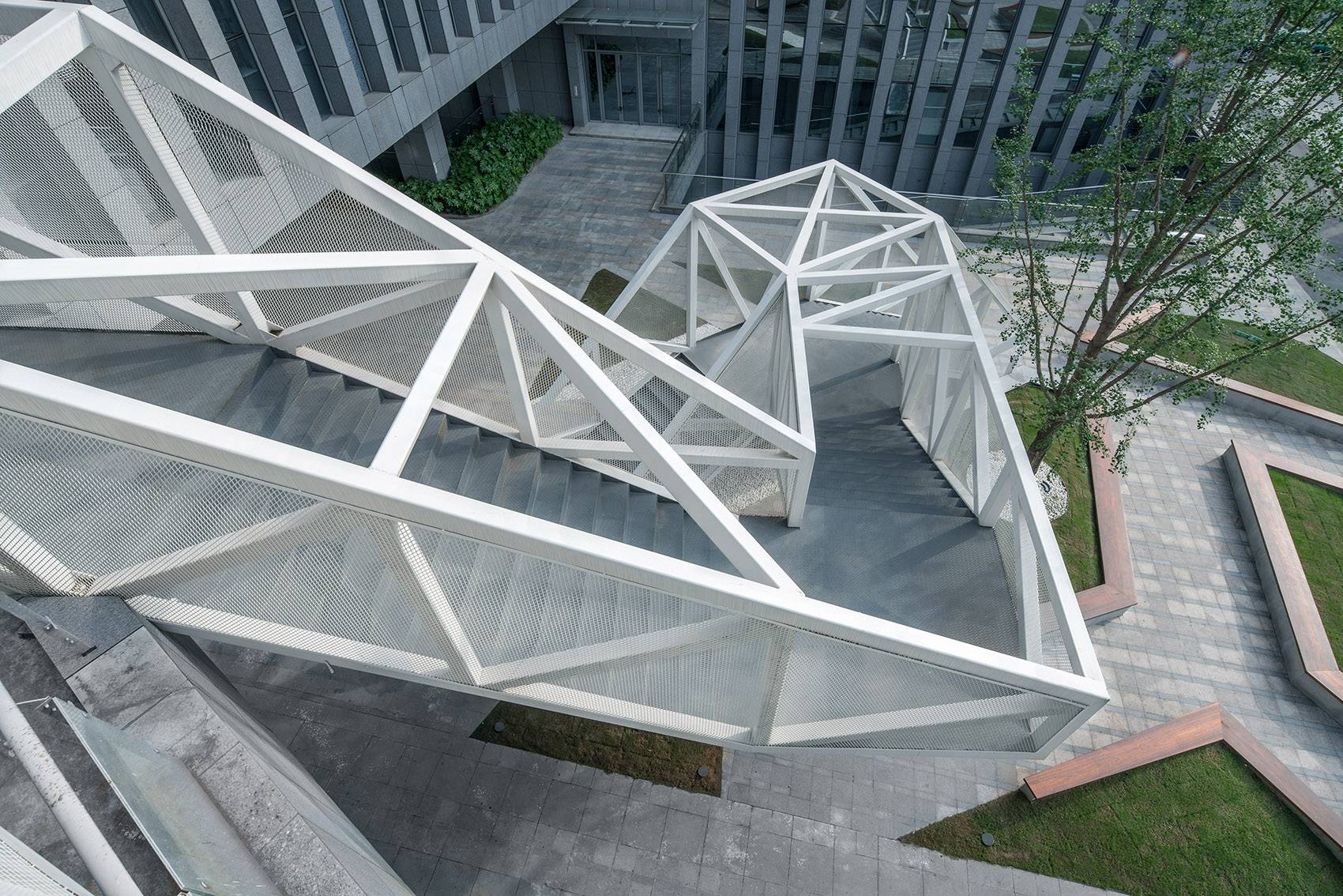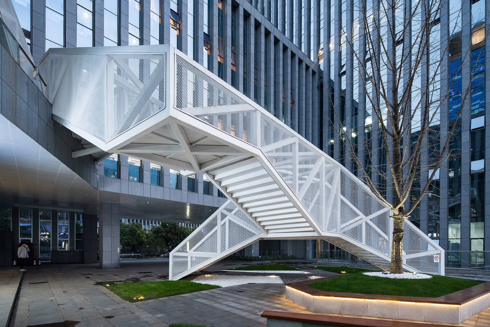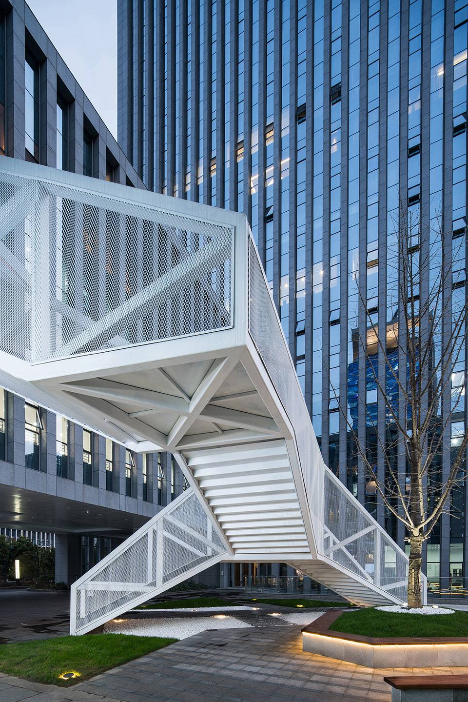 云梯位于江蘇舜禹投資總部塔樓與裙房的交接處,主要功能是改善商業(yè)動(dòng)線及豐富建筑組團(tuán)的院落空間體驗(yàn)。作為典型的交通設(shè)施,樓梯的各入口合理地順應(yīng)了不同方向的商業(yè)人流,交通便捷性的設(shè)計(jì)考慮自然形成了折線狀的平面幾何關(guān)系,由外而內(nèi)地確立了樓梯在場(chǎng)地中的秩序。