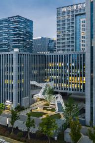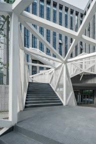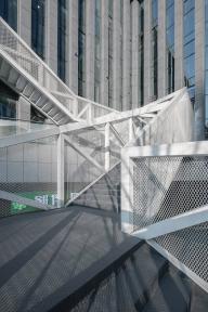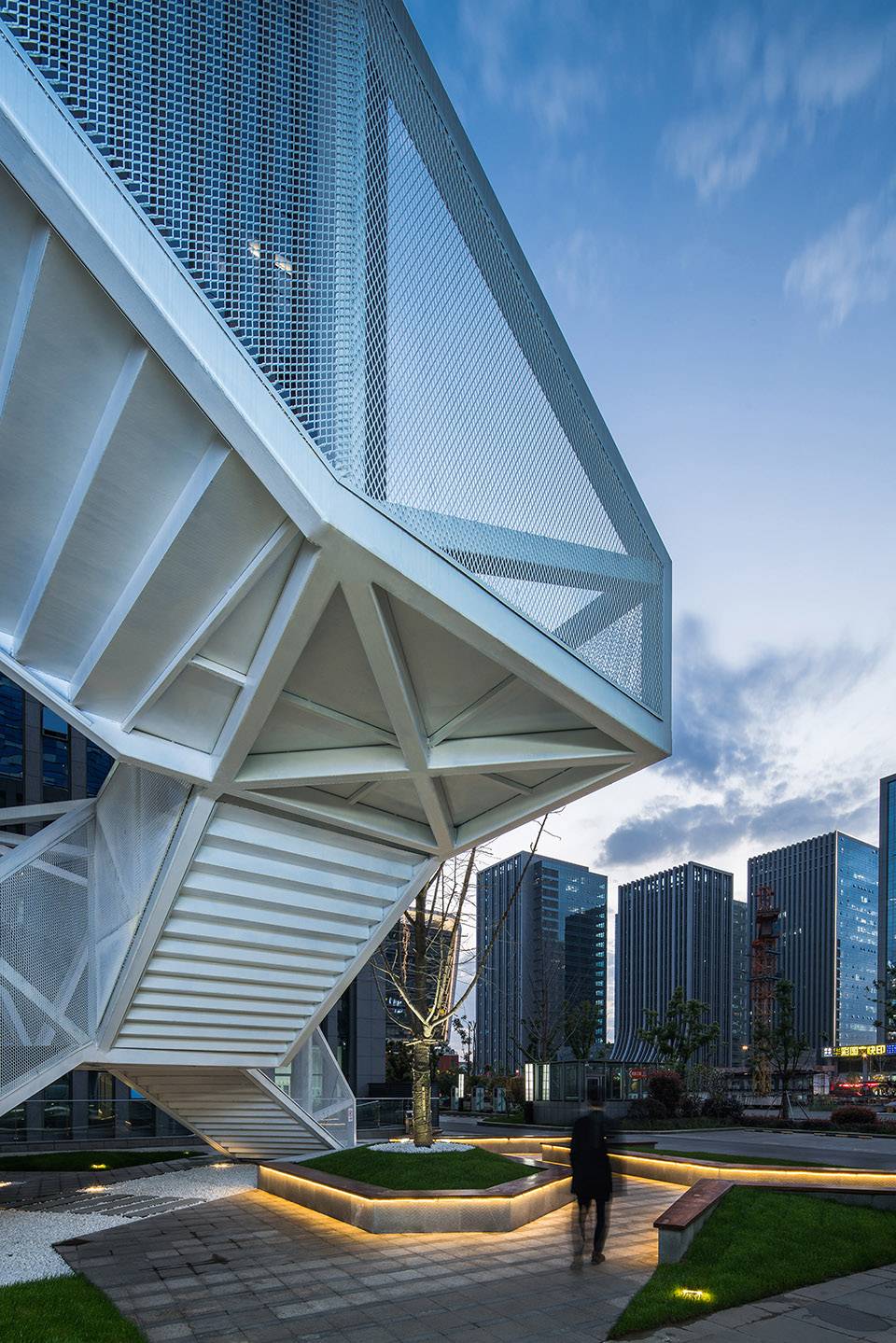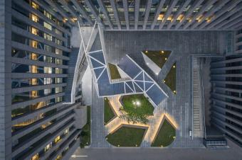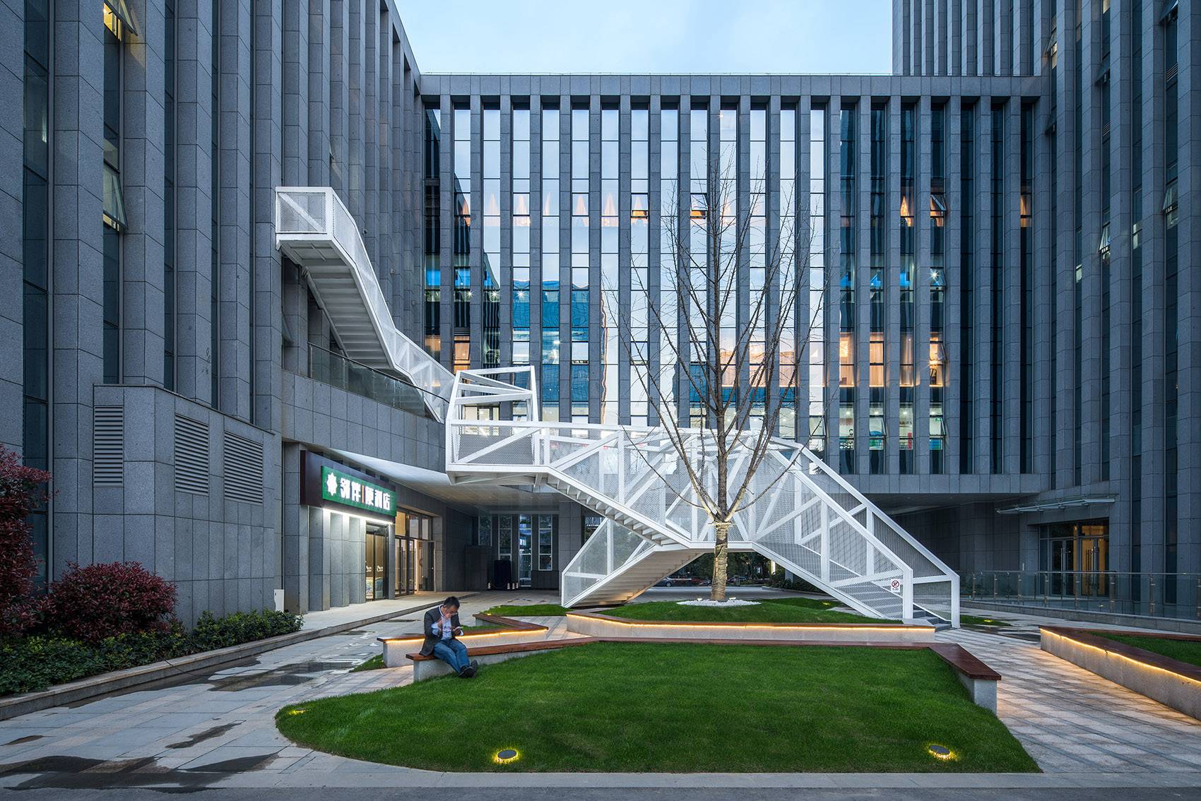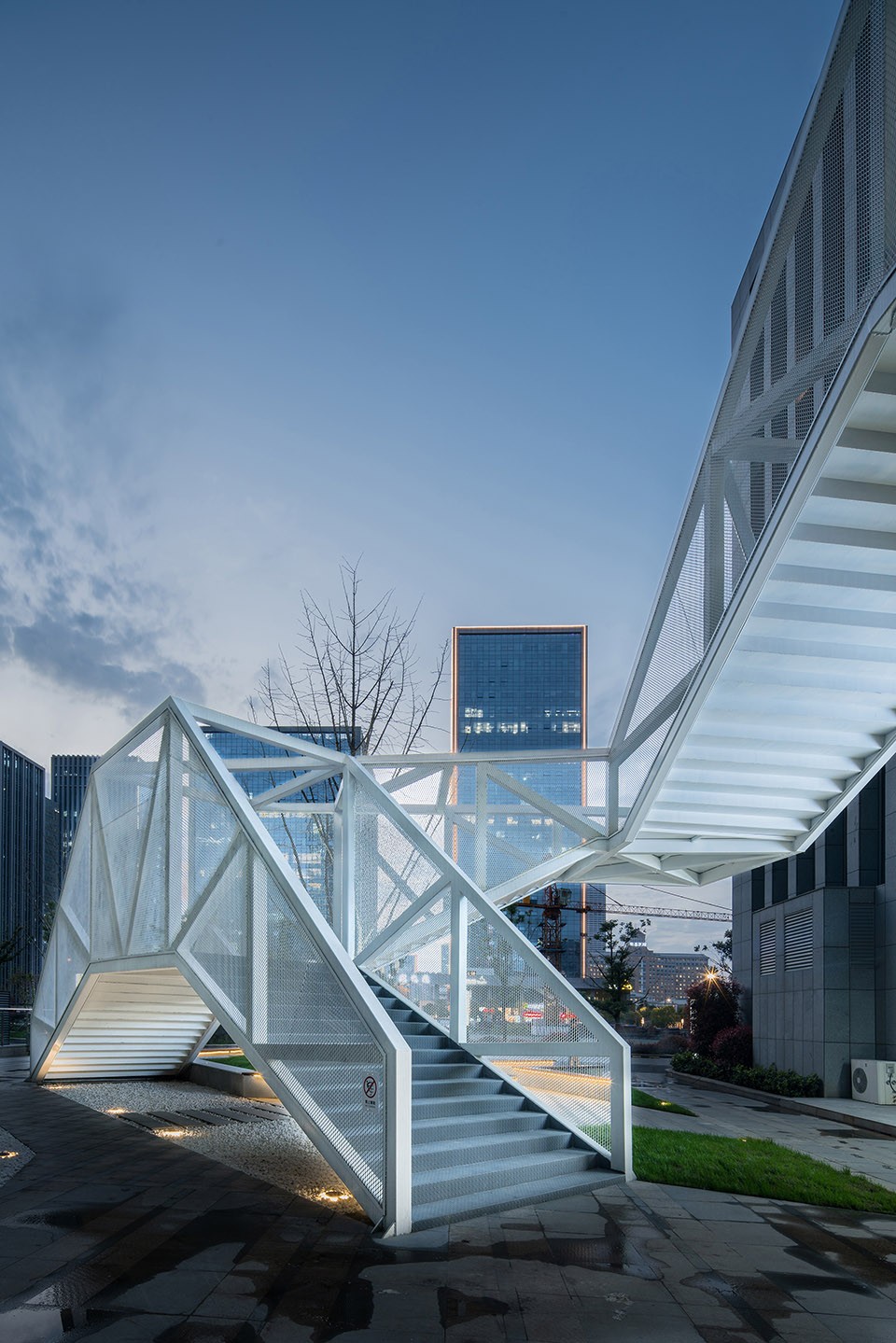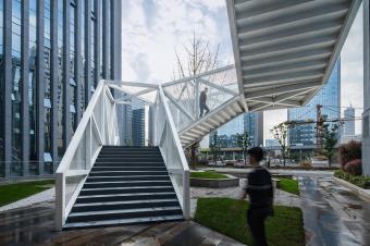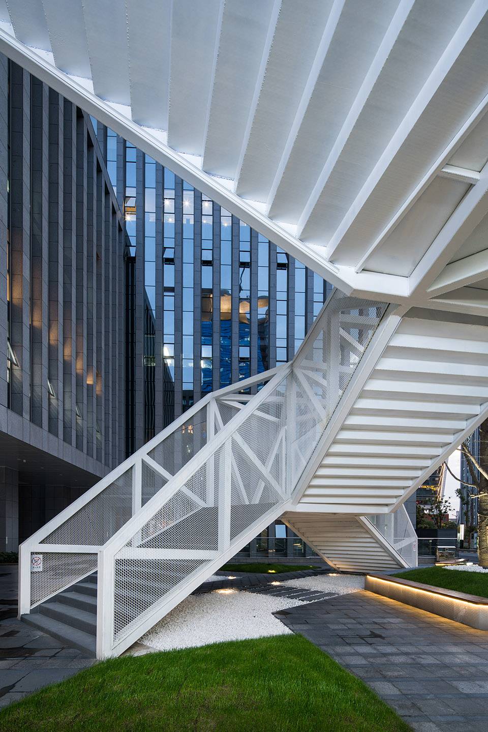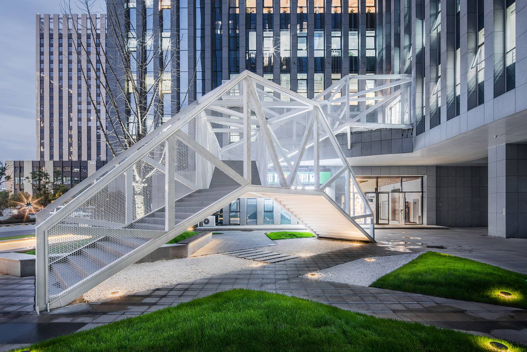 云梯位于江蘇舜禹投資總部塔樓與裙房的交接處,主要功能是改善商業(yè)動(dòng)線及豐富建筑組團(tuán)的院落空間體驗(yàn)。作為典型的交通設(shè)施,樓梯的各入口合理地順應(yīng)了不同方向的商業(yè)人流,交通便捷性的設(shè)計(jì)考慮自然形成了折線狀的平面幾何關(guān)系,由外而內(nèi)地確立了樓梯在場(chǎng)地中的秩序。
