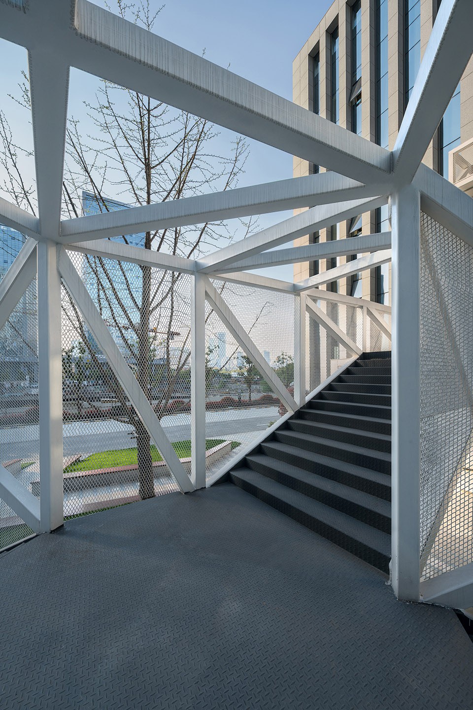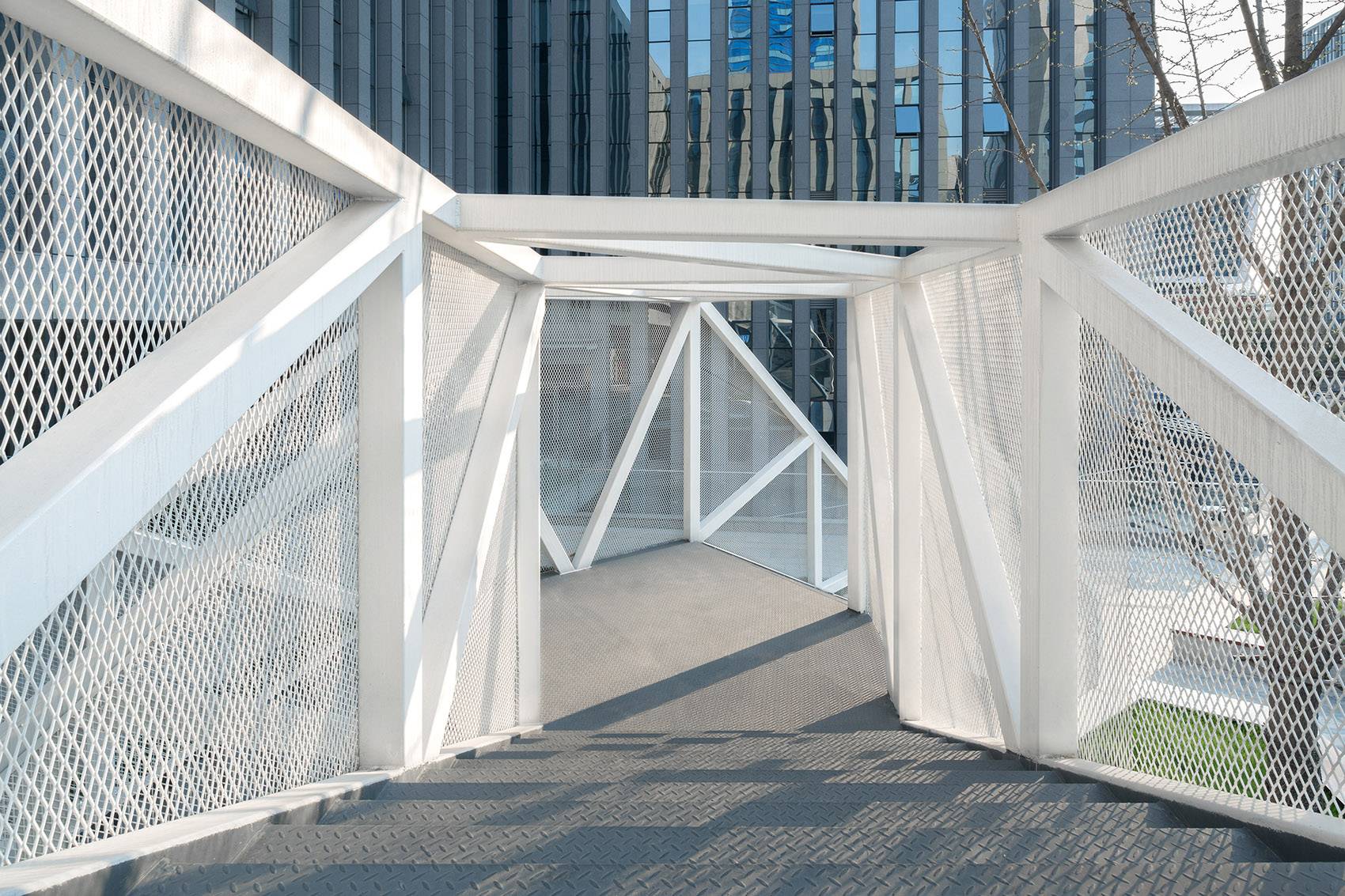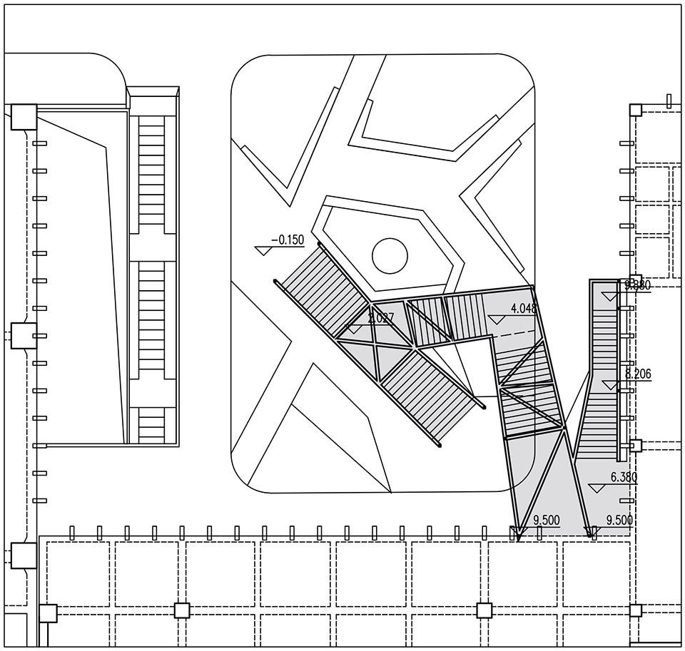 云梯由一系列相互交織的桁架結(jié)構(gòu)組成,各構(gòu)件彼此支撐,共同組成了空間桁架結(jié)構(gòu),因此具有了良好的結(jié)構(gòu)穩(wěn)定性。依據(jù)細(xì)致的設(shè)計(jì)和精確的計(jì)算,不同鋼桿件截面的均依據(jù)內(nèi)力大小控制,從而使得云梯的結(jié)構(gòu)具有了精確形式和極少主義特征,結(jié)構(gòu)精致誘發(fā)的結(jié)構(gòu)感知成為空間體驗(yàn)的重要組成部分。