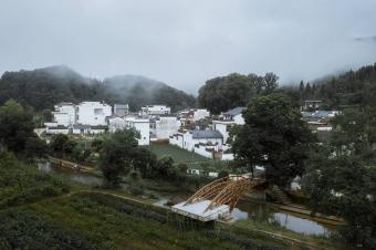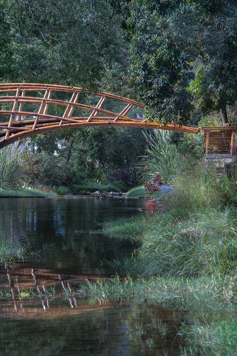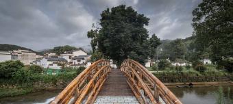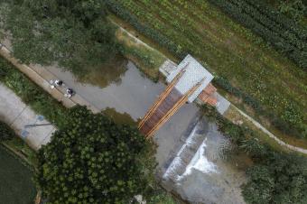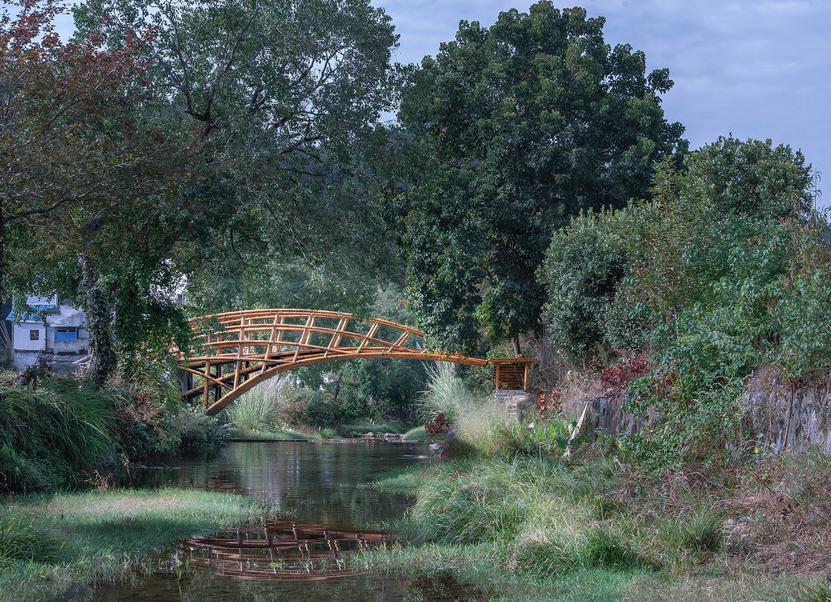 項目的場地位于安徽祁門縣桃源村。一條10米寬的水系貫穿村頭村尾,阻隔了村落和農(nóng)田。為了便于村民去田間耕作,需要增加一座人行橋。水系是居住和勞作的分界線,而橋則是通向田園山野的入口。后山上,毛竹密布。用竹子建造,材料本身取之于自然,為人所用,是一種在地的營造。