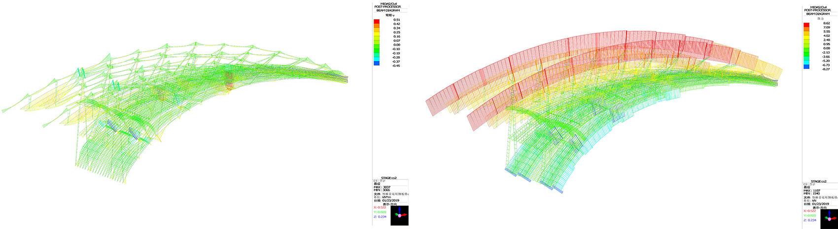 ▼內(nèi)力恒載彎矩(左)和內(nèi)力恒載軸力(右)