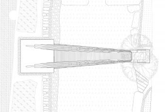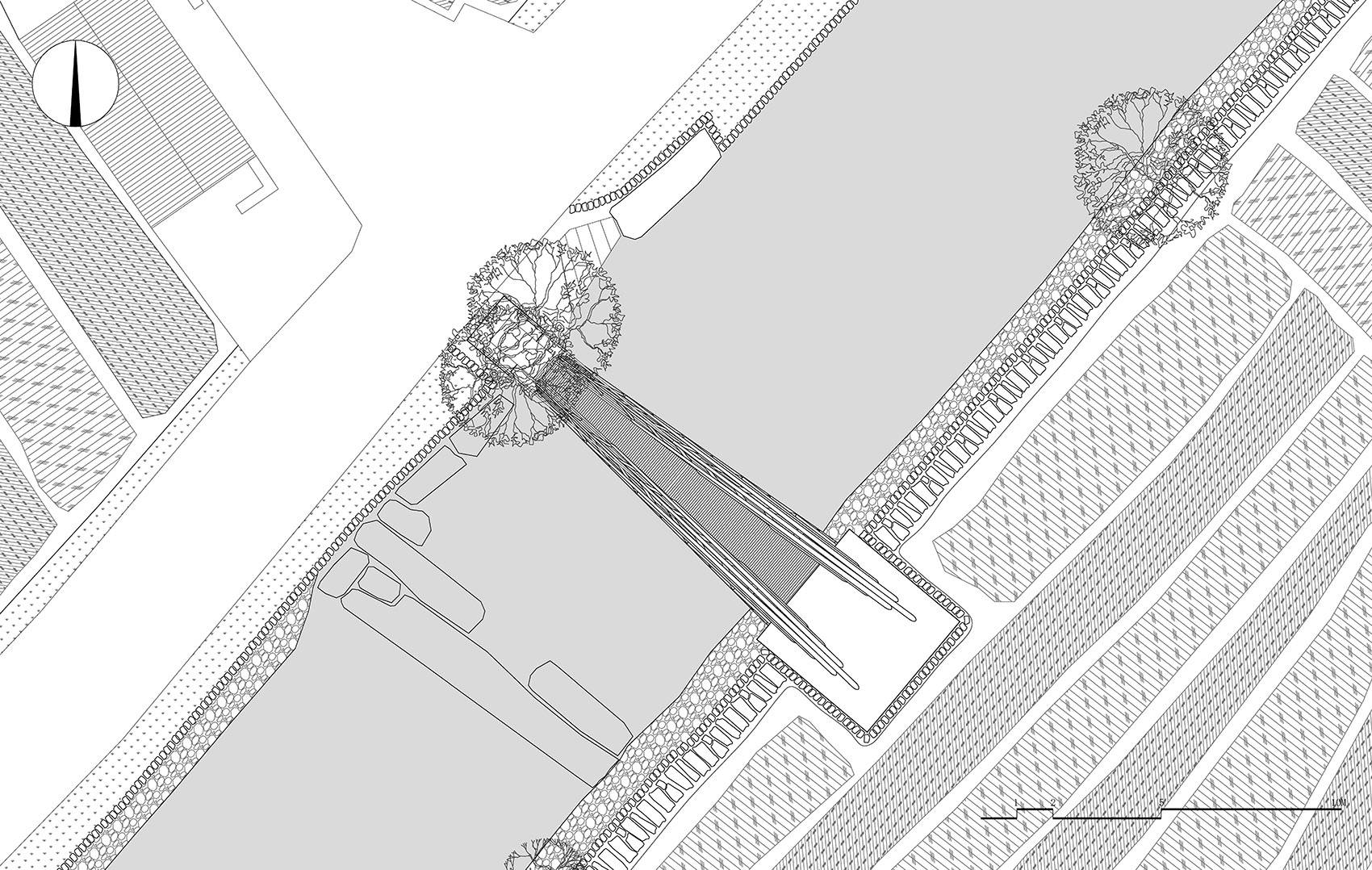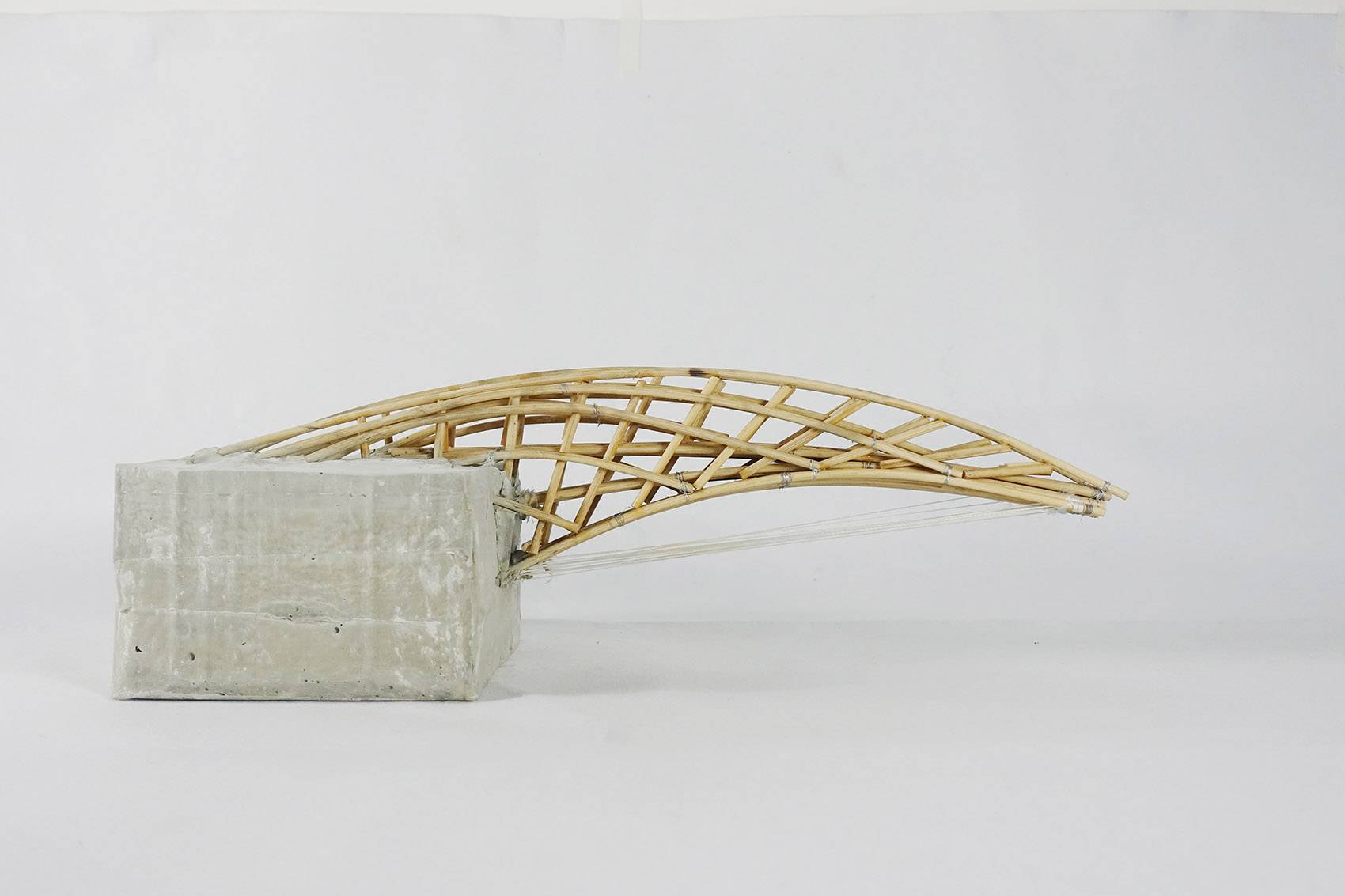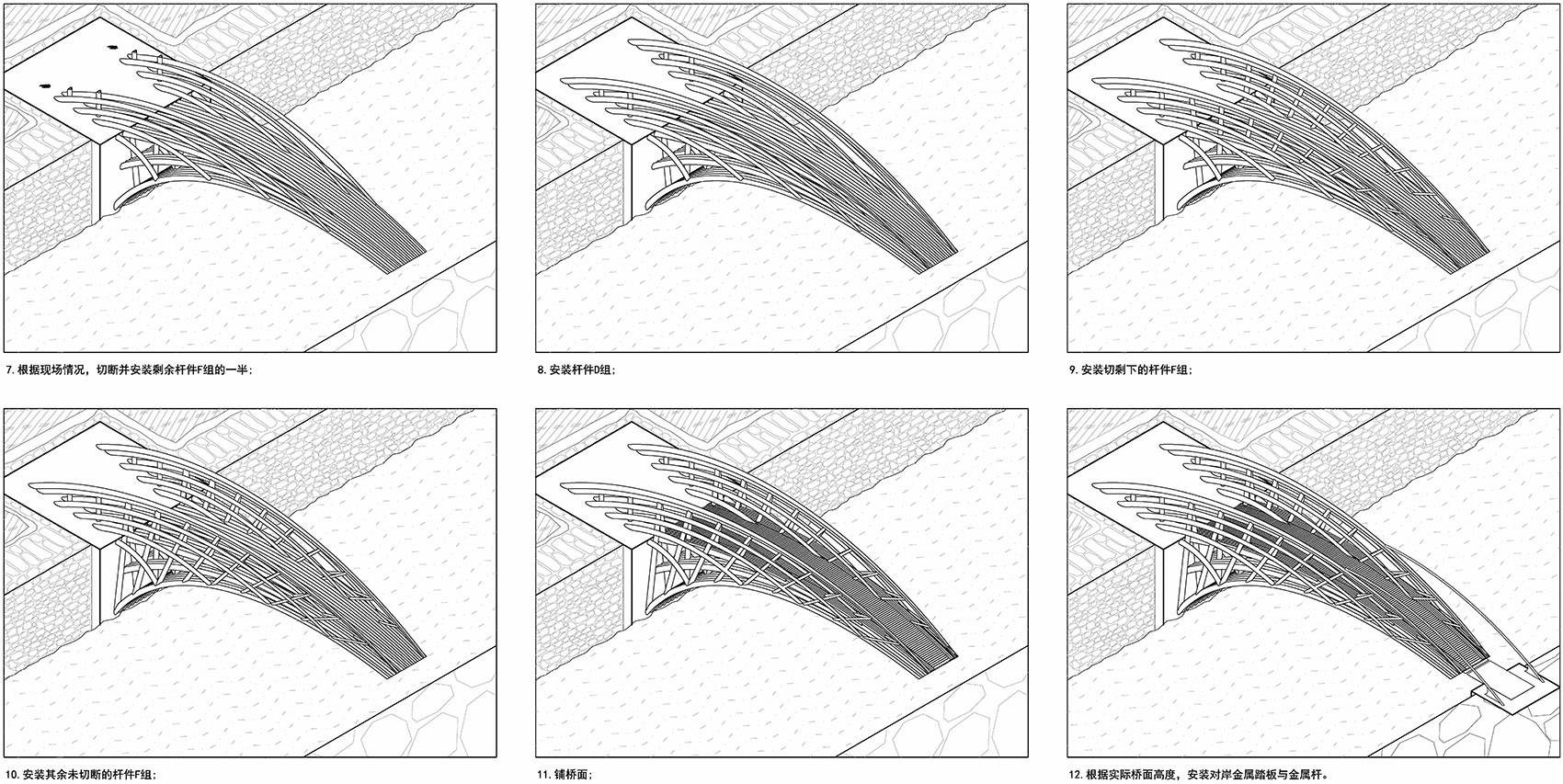 最終,竹構(gòu)懸臂橋,僅靠竹子的力量,自一岸飛架而出,直達對面,形成懸岸飛橋的畫面。橋的端頭同對岸脫開,猶如“斷橋”,強化了懸臂這一結(jié)構(gòu)形式的奇觀感,形成了一種因結(jié)構(gòu)張力而產(chǎn)生的戲劇性。