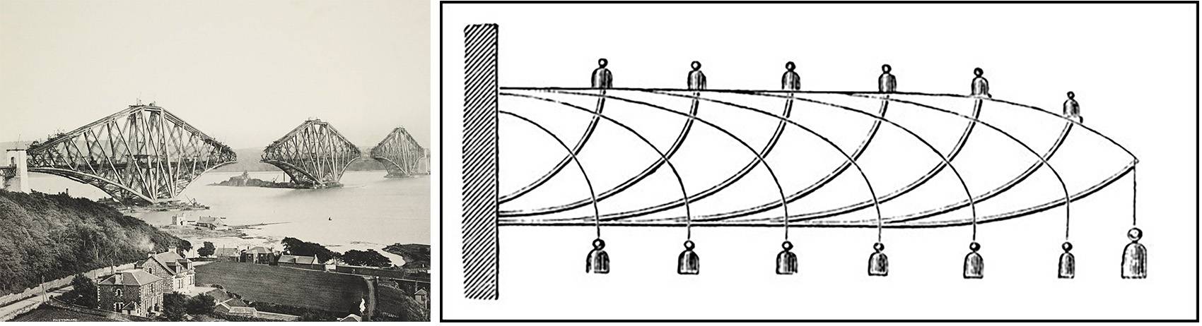 ▼福斯灣大橋(左)和庫爾曼繪制的懸臂梁的結(jié)構(gòu)主應(yīng)力軌跡線(右)