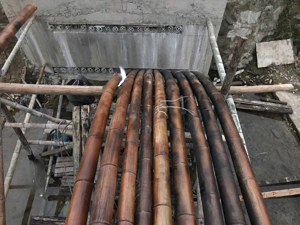 橋面扶手同橋身融為一體,成為主要的結(jié)構(gòu)高度,而橋面較為平緩,利于行走。橋身上弧線的為受拉桿件,直線的為受壓桿件,有效避免了竹子受彎不利的弱點。竹結(jié)構(gòu)的節(jié)點是核心技術(shù)問題。通過鋼片加強以及竹筒中用混凝土灌漿來加強節(jié)點,另外增加不銹鋼抱箍解決了竹子日久開裂強度下降的問題。