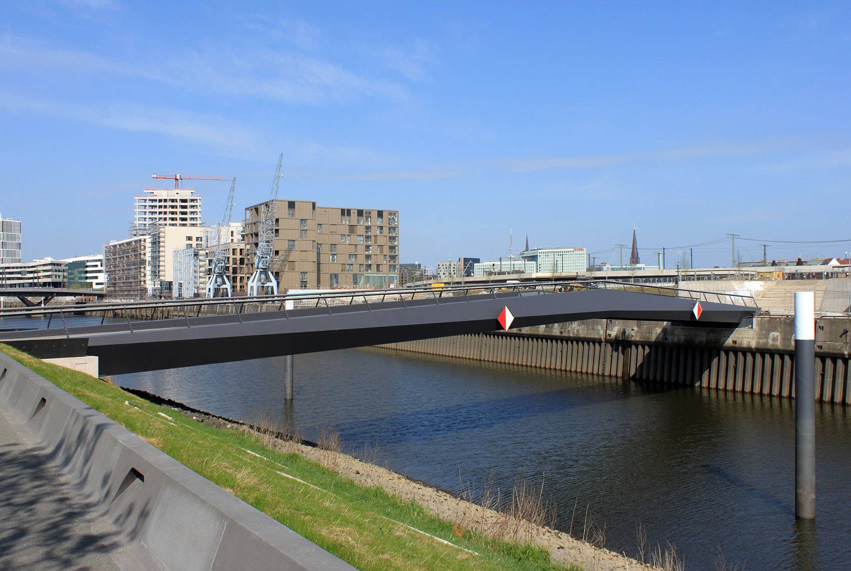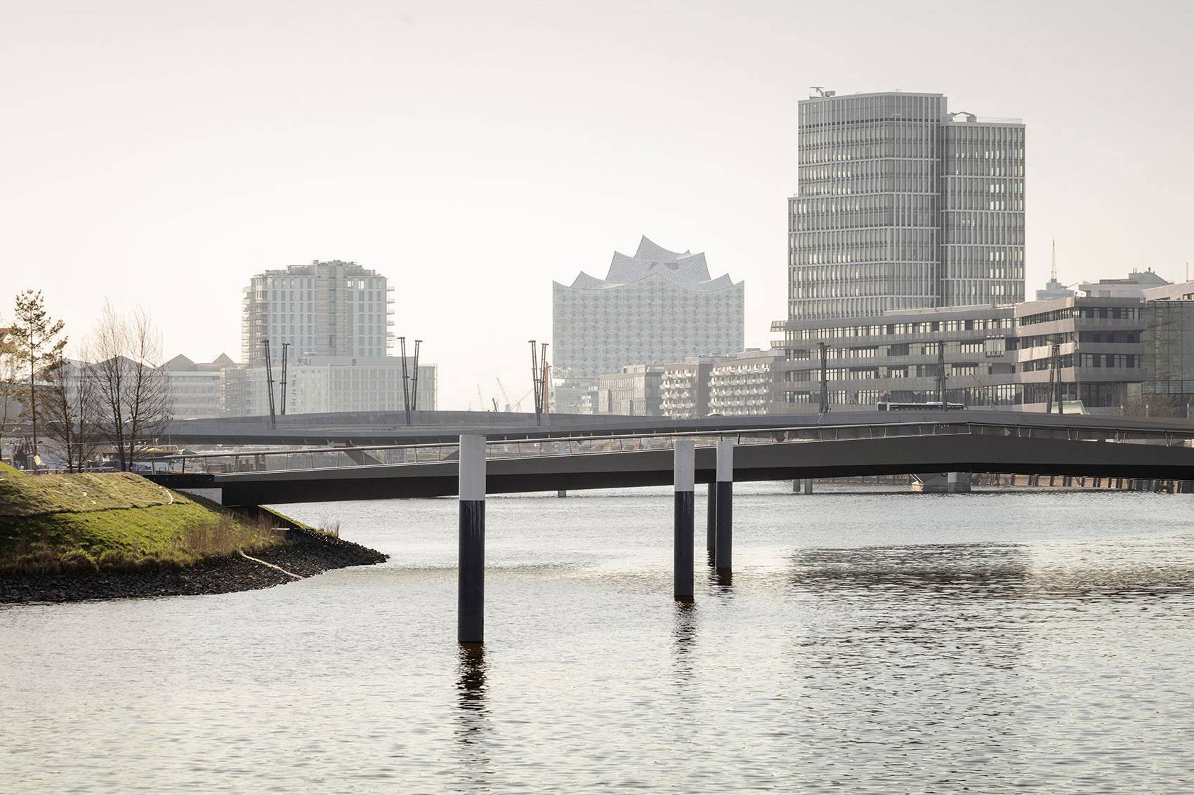 這座行人自行車橋的結(jié)構(gòu)設(shè)計(jì)靈感來自港口常見的船舶、軌道和起重吊臂等工業(yè)元素。橋梁的主體由七組強(qiáng)度在20至70毫米之間的預(yù)制鋼板構(gòu)成,在馬格德堡制造完成后運(yùn)往漢堡,在彼得森碼頭的預(yù)裝配區(qū)域進(jìn)行組裝。2017年夏一座浮式起重機(jī)將總重量300頓的橋梁主體精準(zhǔn)的吊裝至安裝地點(diǎn)??缍却蠹s65米的橋面鋼結(jié)構(gòu)由一個(gè)槽形梁組成,市政管道被安置于其內(nèi)。為了給駁船行駛創(chuàng)造最大的通航空間,橋面最高點(diǎn)略微不對(duì)稱的設(shè)置于北側(cè)靠近碼頭堤岸一面。鋼板表面的折疊肌理令其從側(cè)面看起來更加輕盈纖細(xì)。步行橋的扶手為向內(nèi)傾斜的鋼條和水平方向的不銹鋼纜索構(gòu)成,如金銀細(xì)工般精美,木制扶手進(jìn)一步增強(qiáng)了其優(yōu)雅效果。