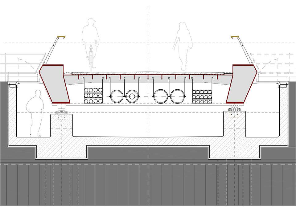 橋梁和濱水大道是港口城錯(cuò)綜復(fù)雜道路網(wǎng)絡(luò)的主要構(gòu)成元素,而巴肯港港池是整個(gè)港口城內(nèi)最大的內(nèi)河港池。除位于西部的大型公路橋外,新建步行橋在北側(cè)建筑群和南部半島之間建立了連接,大大縮短了巴肯港住宅區(qū)內(nèi)部的交通路經(jīng),將維斯曼碼頭一側(cè)的住宅與Atelier Loidl設(shè)計(jì)的巴肯公園聯(lián)系起來。步行橋的受益者首先是步行者和騎行者,特別是有孩子的家庭,可以直接穿過港池到達(dá)對(duì)面的公園。新建步行橋不僅使鄰里之間的溝通更加緊密,同時(shí)也連接了彼得森碼頭區(qū)域的天然氣、自來水和廢水管道以及電力、通訊線路。