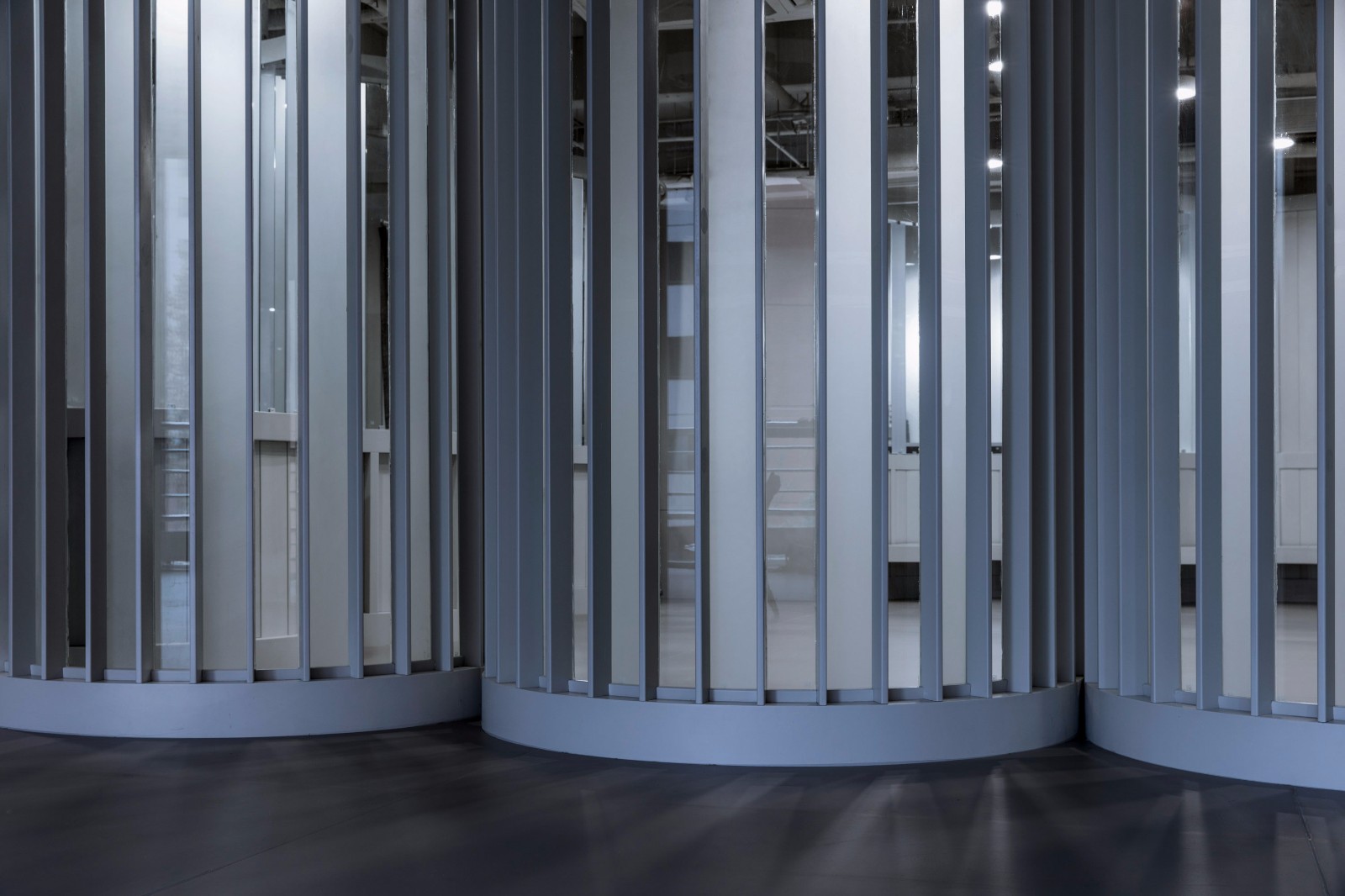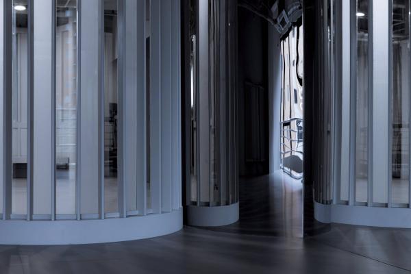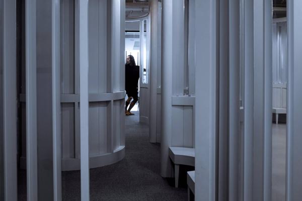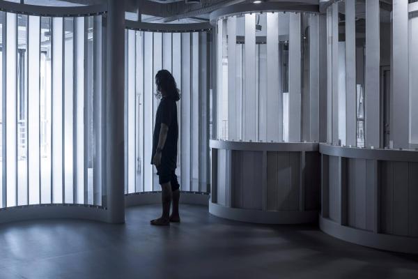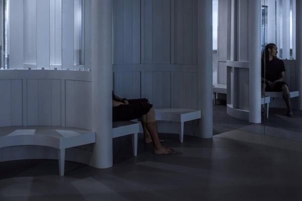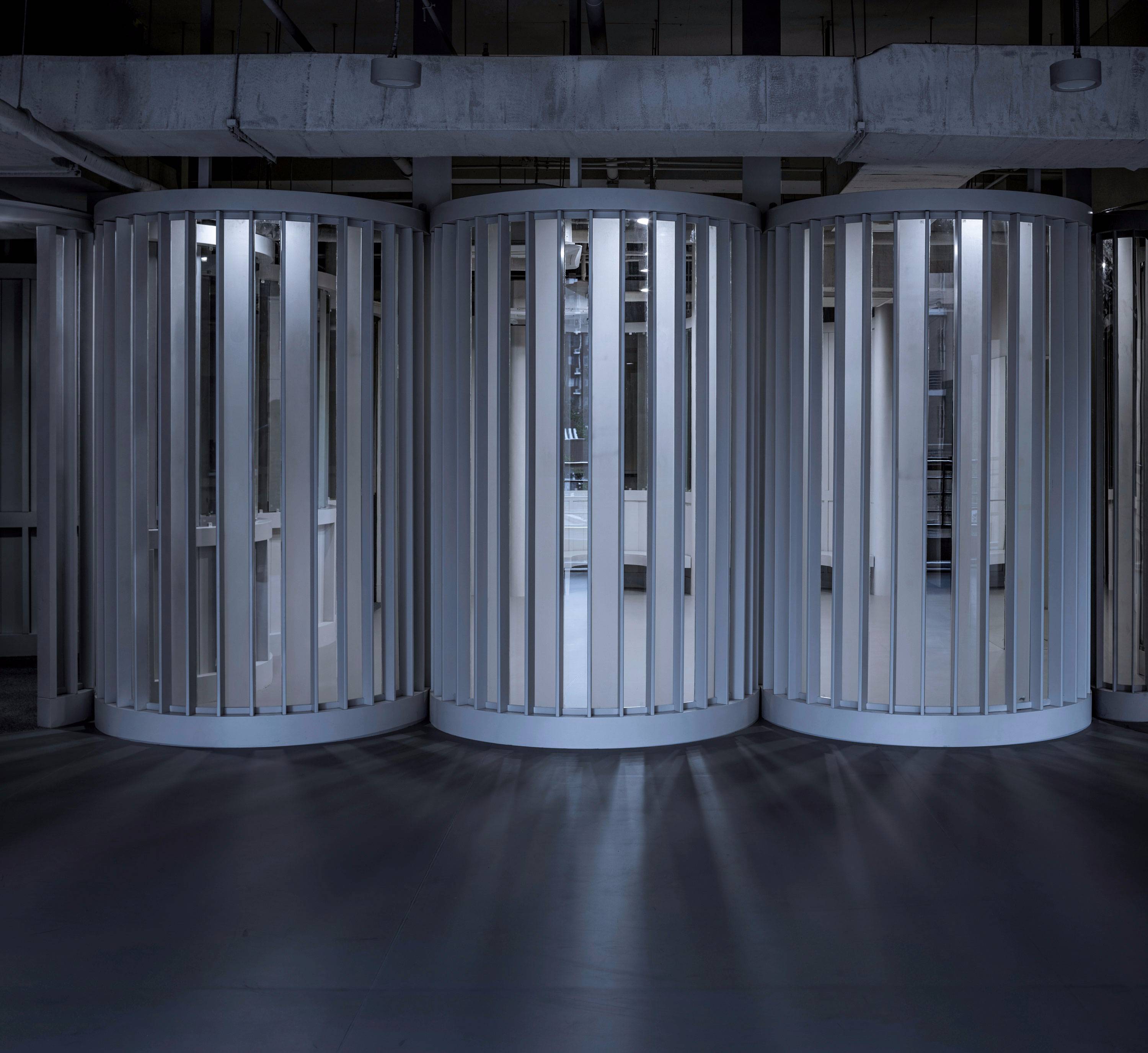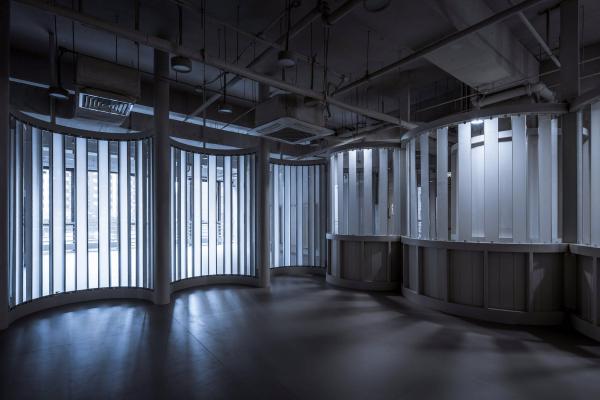 實際上,在舞蹈教學中,這種“觀賞”,自然地促進了學員的學習動力與表演熱情。成為優(yōu)秀的“展示者”,表達自己,用身體積極主動地傳遞信息,這不正是舞蹈教學中非常重要的一部分么。身處“包間走廊”中的等待學習的學員,也在學習成為優(yōu)秀的“觀賞者”。正是這種表演與觀看的往來,促成了教學中生動的模擬,讓這個過程變得生動、有趣。由此,環(huán)境中的“形象符號”也變得更有提示性的作用:整個裝置立面中全部采用了豎向的線條,讓人聯(lián)想到古典劇院中褶皺的幕布。