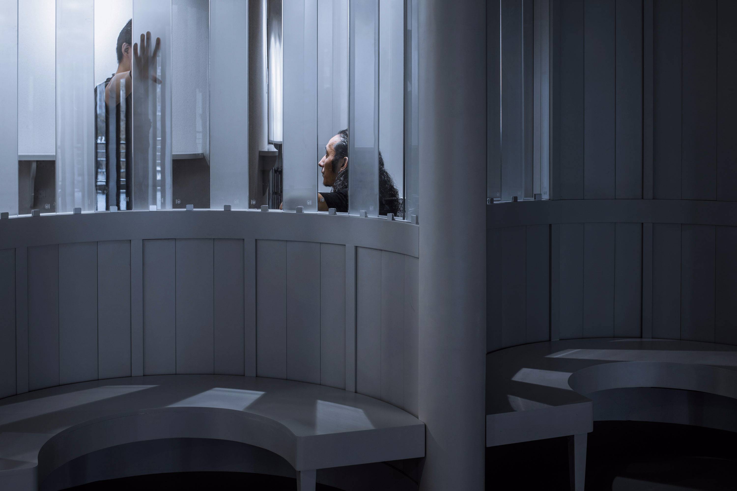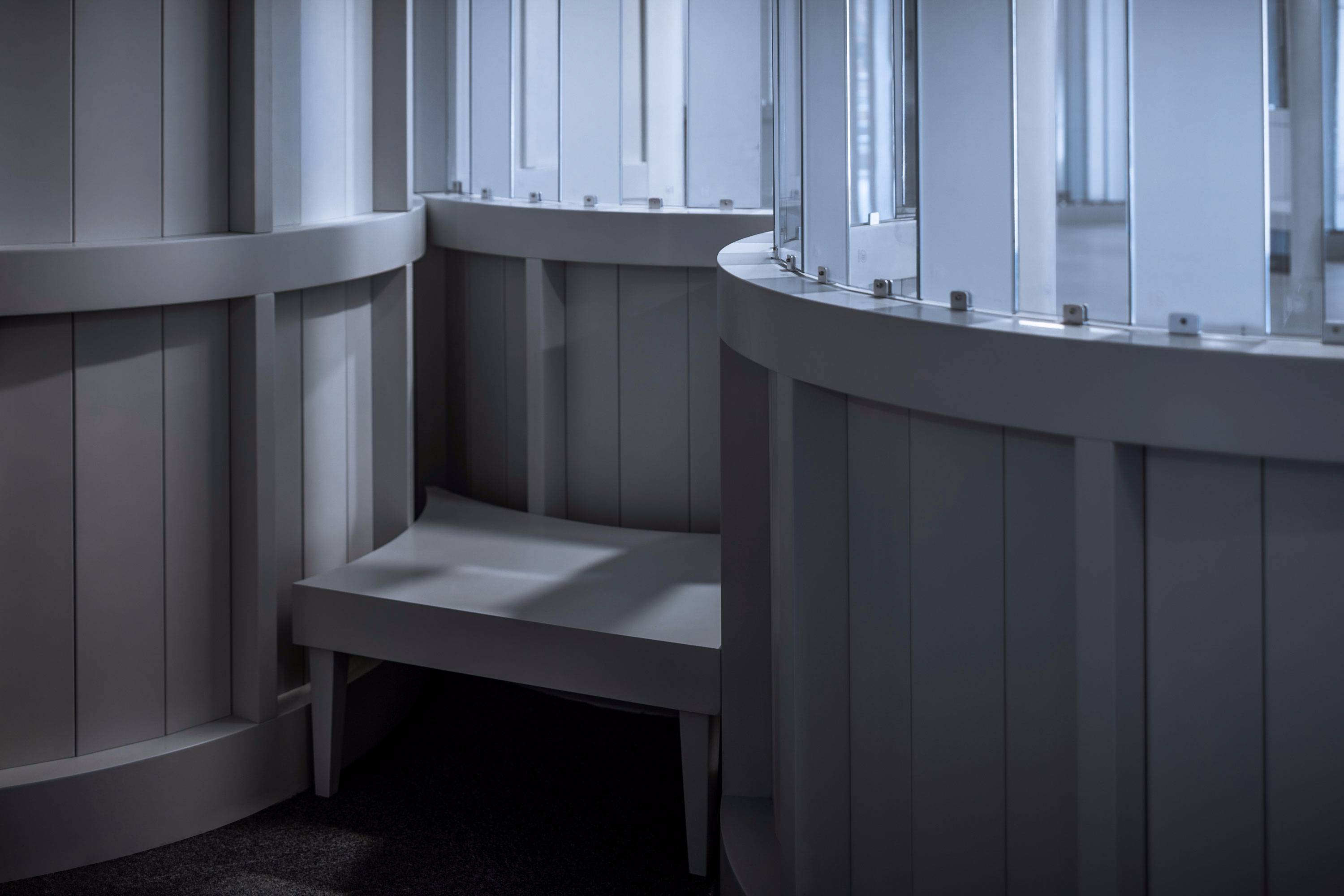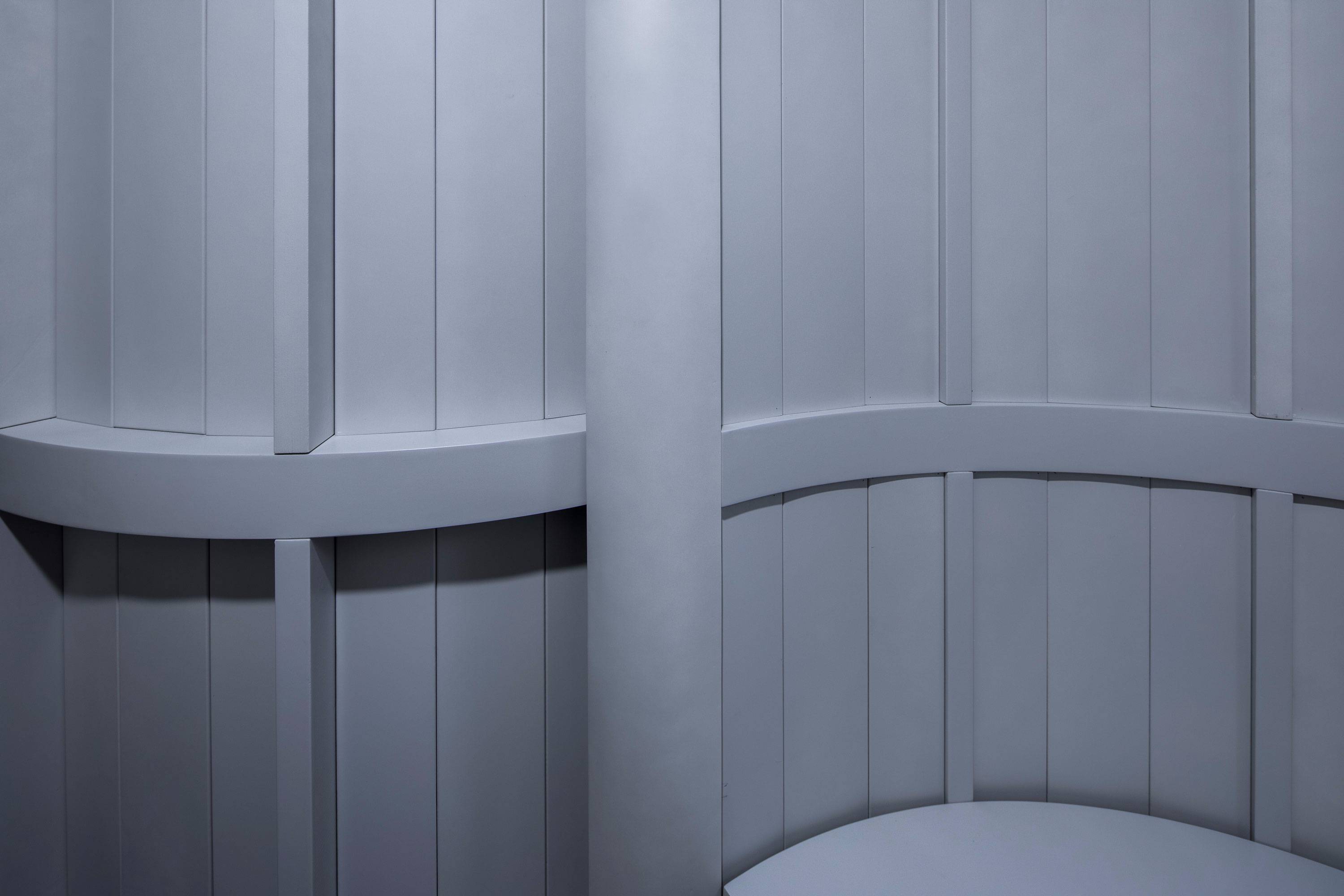 這個“符號”時刻提示著人們身處于這項身體的藝術(shù)創(chuàng)作與訓練氛圍中,讓里面的一切變得更有儀式感。在座位的后面,使用豎向木板作為矮靠墻或矮扶墻;在更衣室的外面,使用豎向木板作為隔墻;在教室和練習室之間,使用透明與磨砂玻璃交替的玻璃作為視線可以通過的介質(zhì),這種透明與半透明的交替,使得觀看與被看,更為輕柔、含蓄,為視線的交流更添一份友善、欣賞和友善。