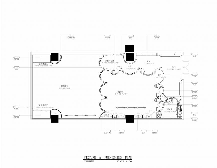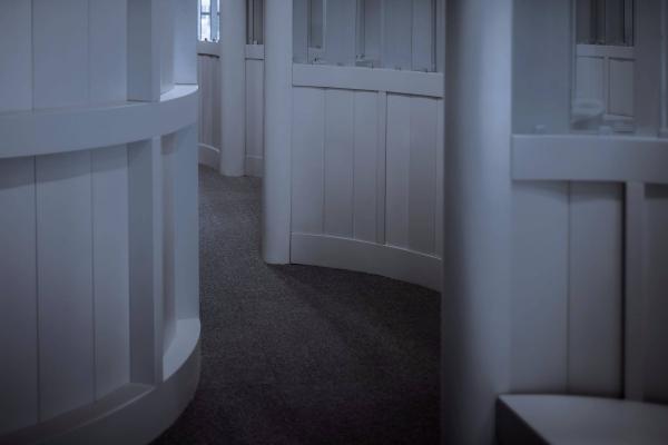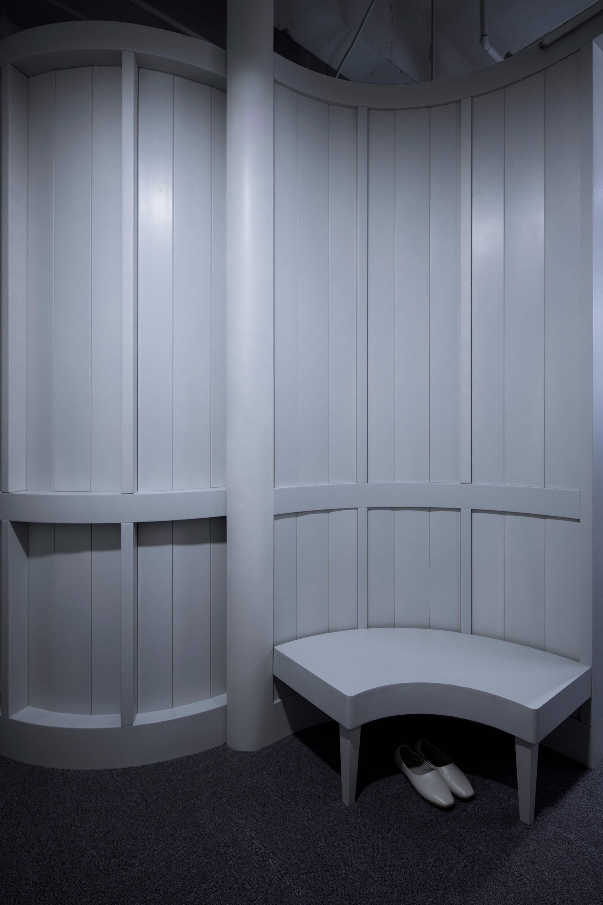 “器屋”是一個舞蹈教室,我們希望這里是教學、練習舞蹈的地方,也是每個人通過身體使用、體驗、參與其中的室內(nèi)“構(gòu)筑物”。這里鼓勵人們通過身體體驗,所以它被設(shè)計的非常的柔軟,它面積不大,圓形始終貫徹在整體設(shè)計的邏輯中,并通過這個基礎(chǔ)形狀的組合,自然而然地衍生出不同功能的房間,如門廳、更衣室、練習室、教室、走廊等等。為了不浪費面積,走廊與休息間合并互相兼顧使用,它還有一個更為重要的功能,即模仿古典劇院中的貴賓包房,有座椅,有矮扶墻,有看窗。多個半圓形在平面上串聯(lián)而成的包間式走廊,便于“看客”坐在其中休息、等待、同時觀看舞蹈室里面的“表演”。