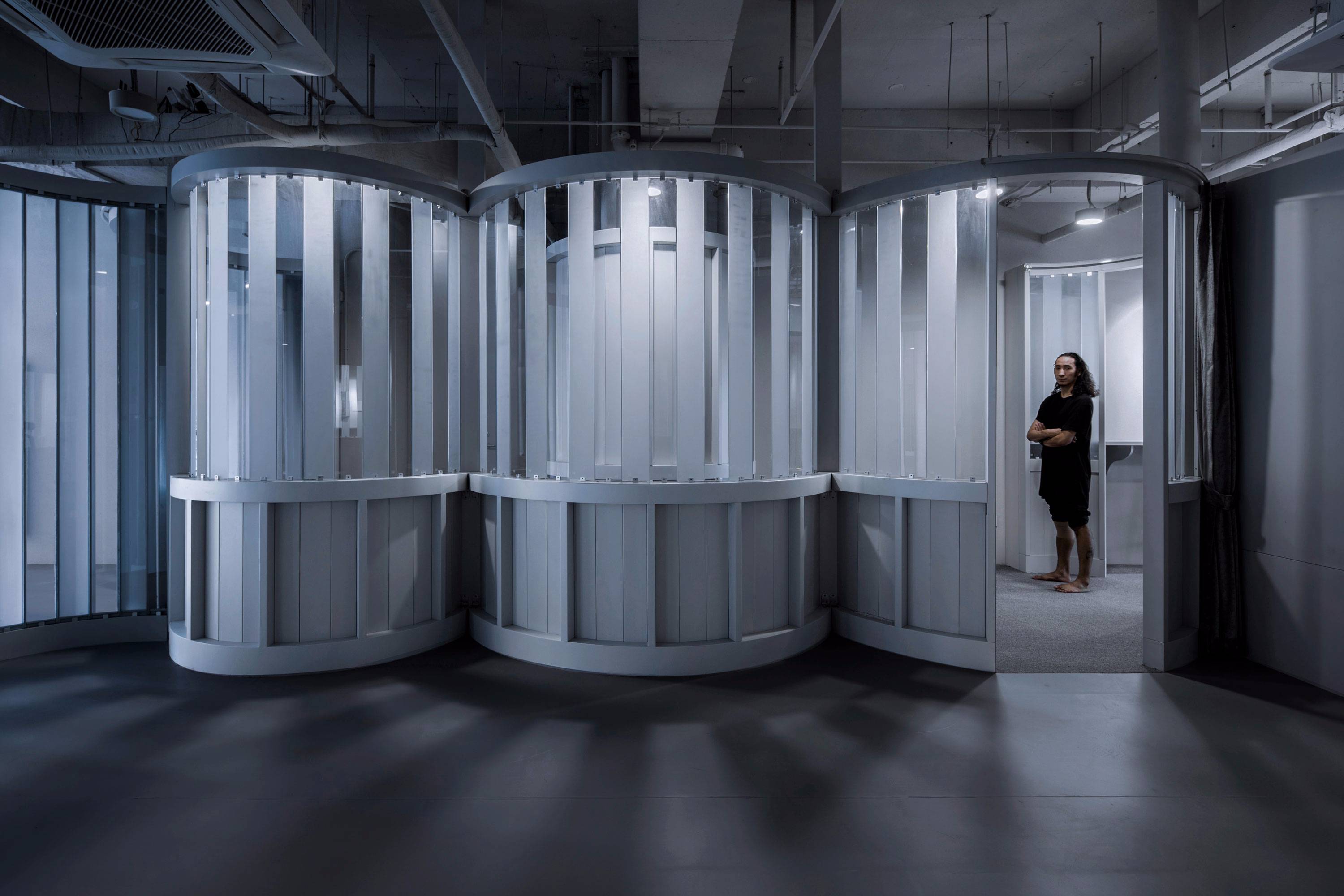 這個項目并非傳統(tǒng)的室內(nèi)項目,而是一個具有價值的、語言單純的、完整且統(tǒng)一的室內(nèi)實驗裝置。在競爭激烈的商業(yè)市場環(huán)境中,能夠帶有夢想地、創(chuàng)造這樣獨特體驗的“大裝置”空間的概率很小,這也是勇敢的、夢想家般的、追求獨特品牌的經(jīng)營者的一份貢獻。事實上,這個項目也讓每一個身處其中的教員、學員在艱苦的教學過程中,體驗到了練習背后早已到來的成就與收獲的喜悅,一份用身體表演、展現(xiàn)自己的喜悅。