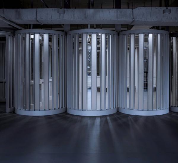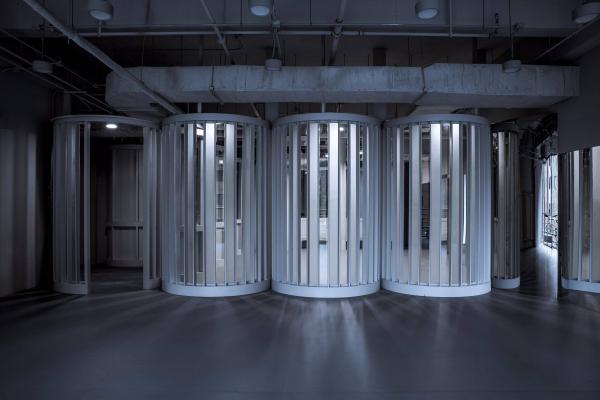 在設(shè)計中,我們所碰到的最大的難題是:如何處理這個小型項目中既簡化設(shè)計手法與建造方式,又需隨位置與角度不同呈現(xiàn)出更多豐富感受與視線變化,這兩者需求之間的矛盾。一方面,我們將設(shè)計語言精簡到豎線條交錯一項,另一方面我們又希望里面的空間效果變幻多樣。經(jīng)過研究,我們拋棄了所有的材料的材質(zhì)和顏色,從規(guī)劃中引入半徑統(tǒng)一的圓形平面組合。