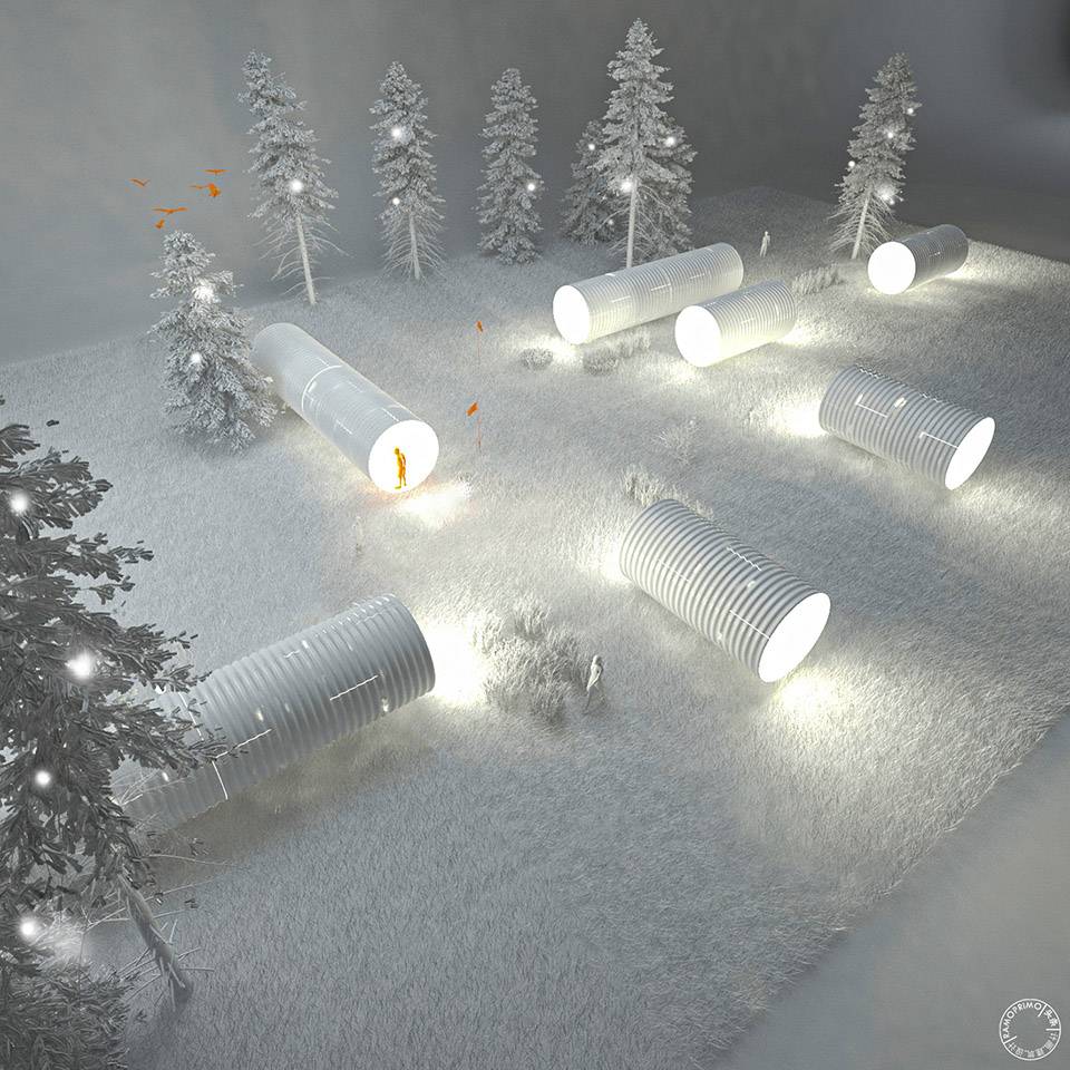 整體設(shè)計(jì)概念希望在團(tuán)結(jié)湖這一熱鬧的區(qū)域打造一片安靜的白色冬季景色。在繁忙的大都會(huì)中間,將是一片寧?kù)o的白色綠洲,點(diǎn)綴著樹(shù)木和小小的圓形管狀小屋。這一對(duì)比將引發(fā)熱烈的公眾反響:人群將在這里發(fā)生交互行為并帶動(dòng)社交媒體上的傳播。